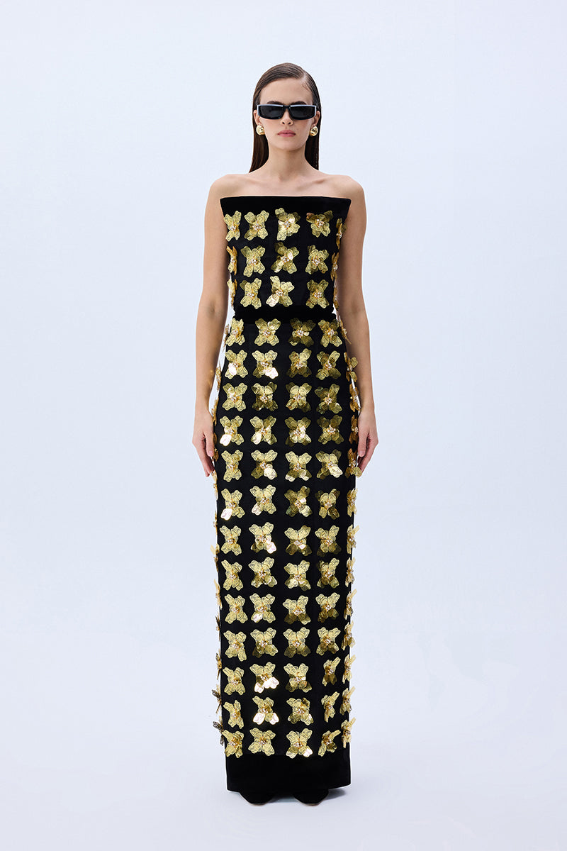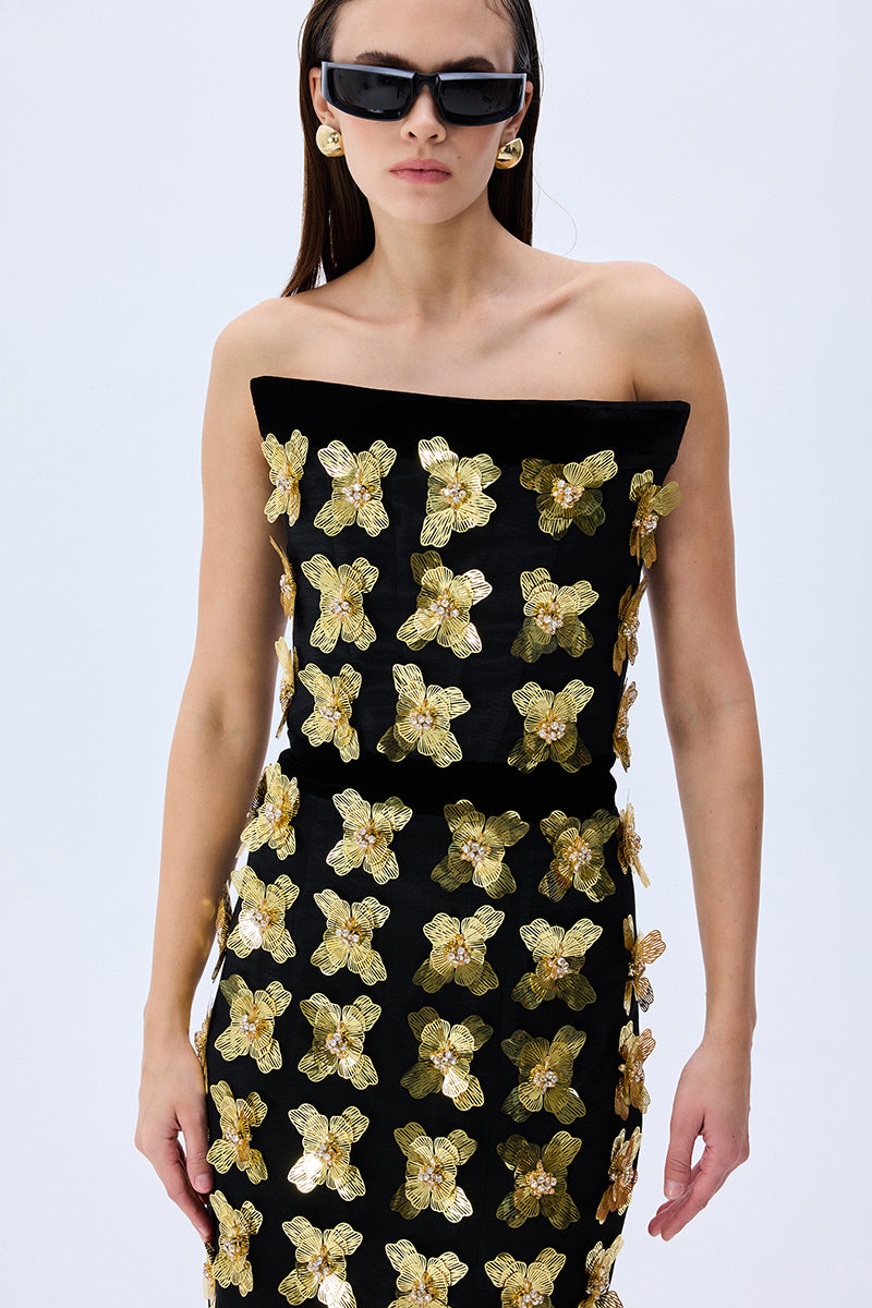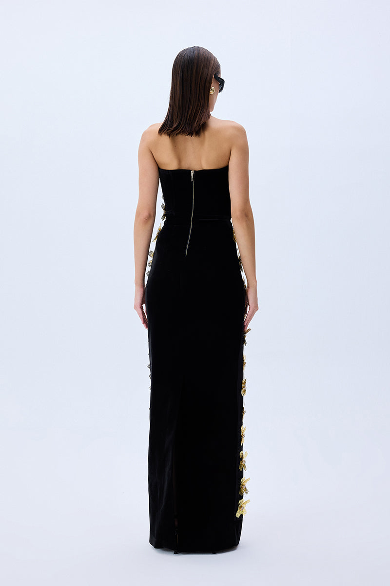 Rows of sculpted gold florals bloom across a statuesque black velvet column, catching light with every movement. A sleek silhouette wrapped in rich texture and opulence, made for moments that demand reverence.