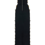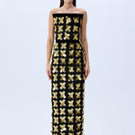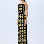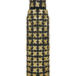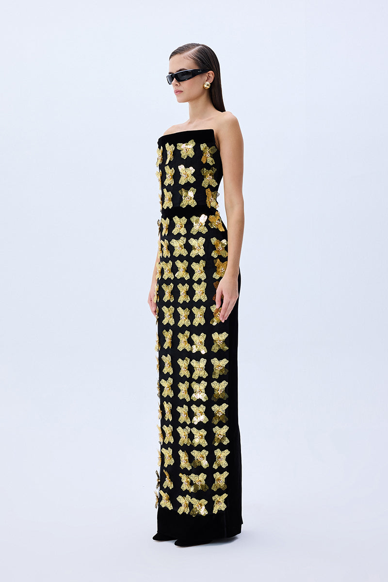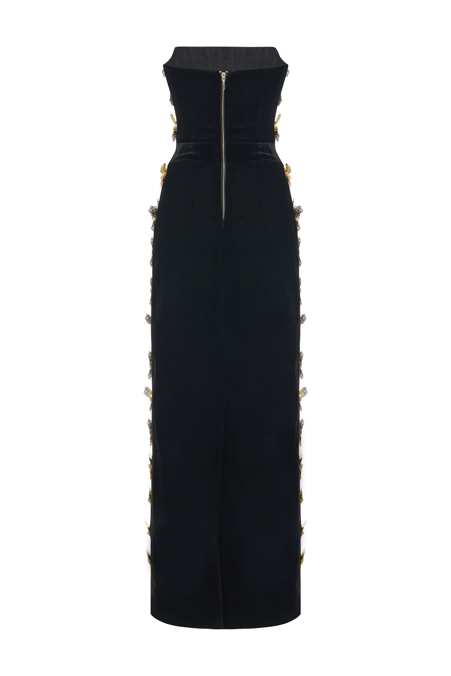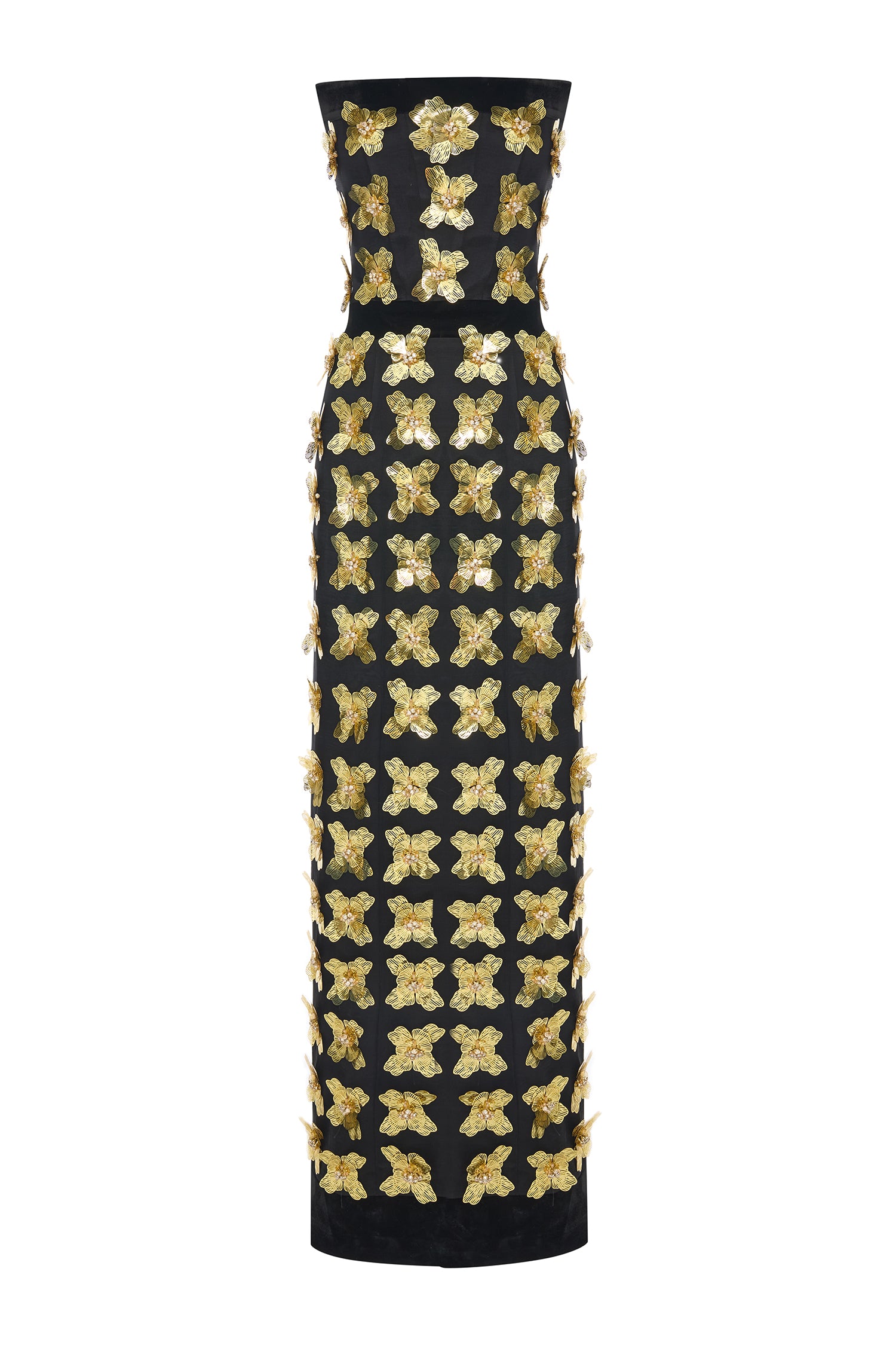 Rows of sculpted gold florals bloom across a statuesque black velvet column, catching light with every movement. A sleek silhouette wrapped in rich texture and opulence, made for moments that demand reverence.