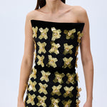 3D Gold Flower Embellished Dress With Black Velvet Detail