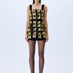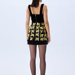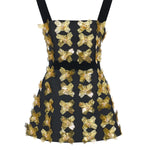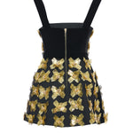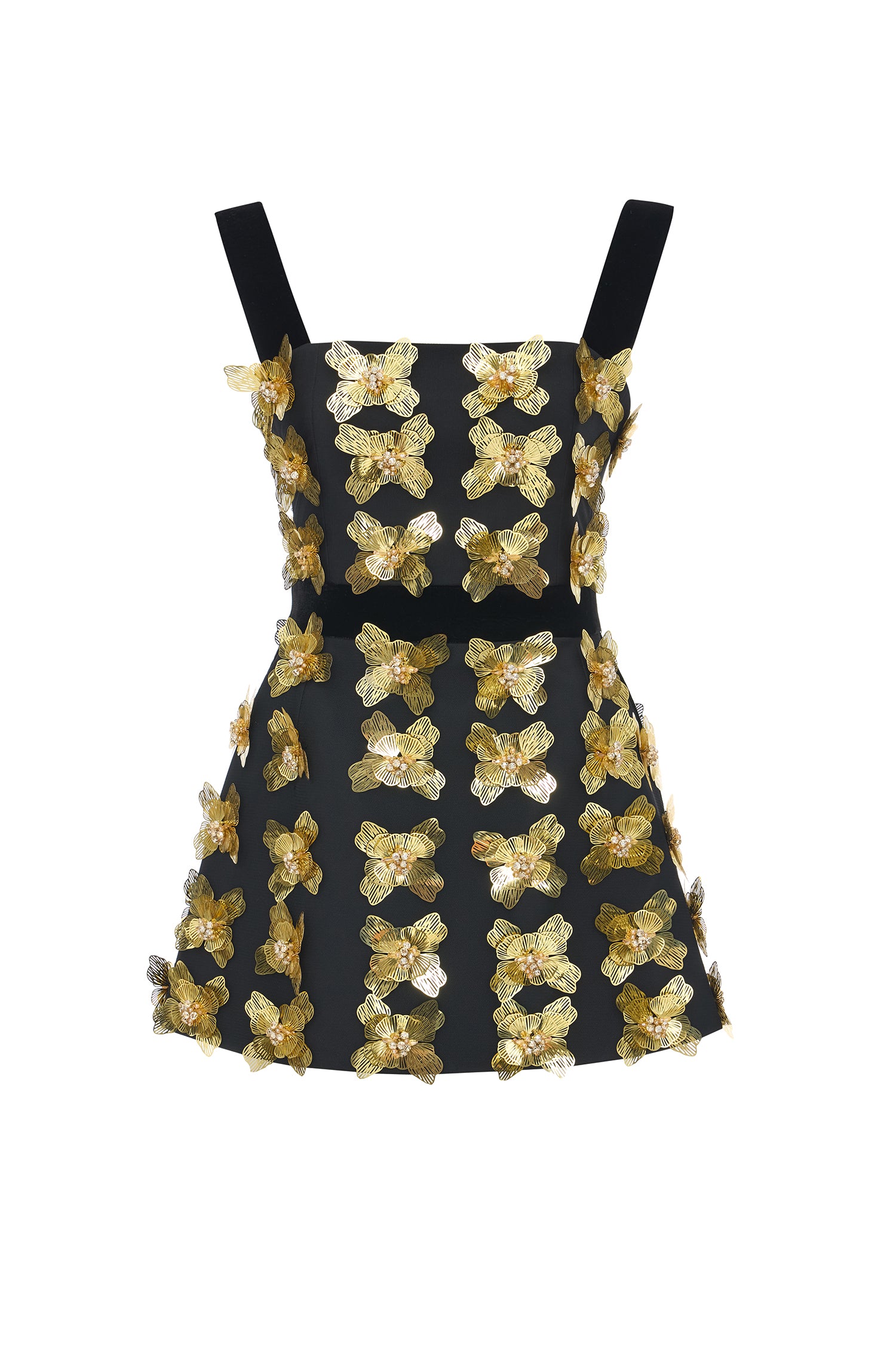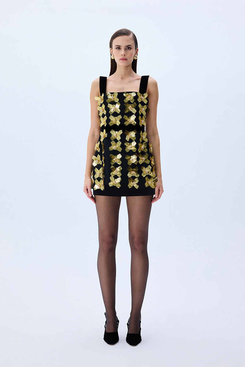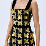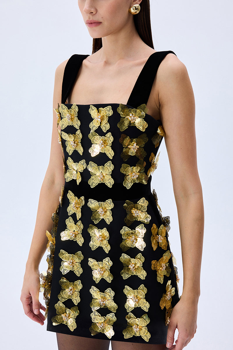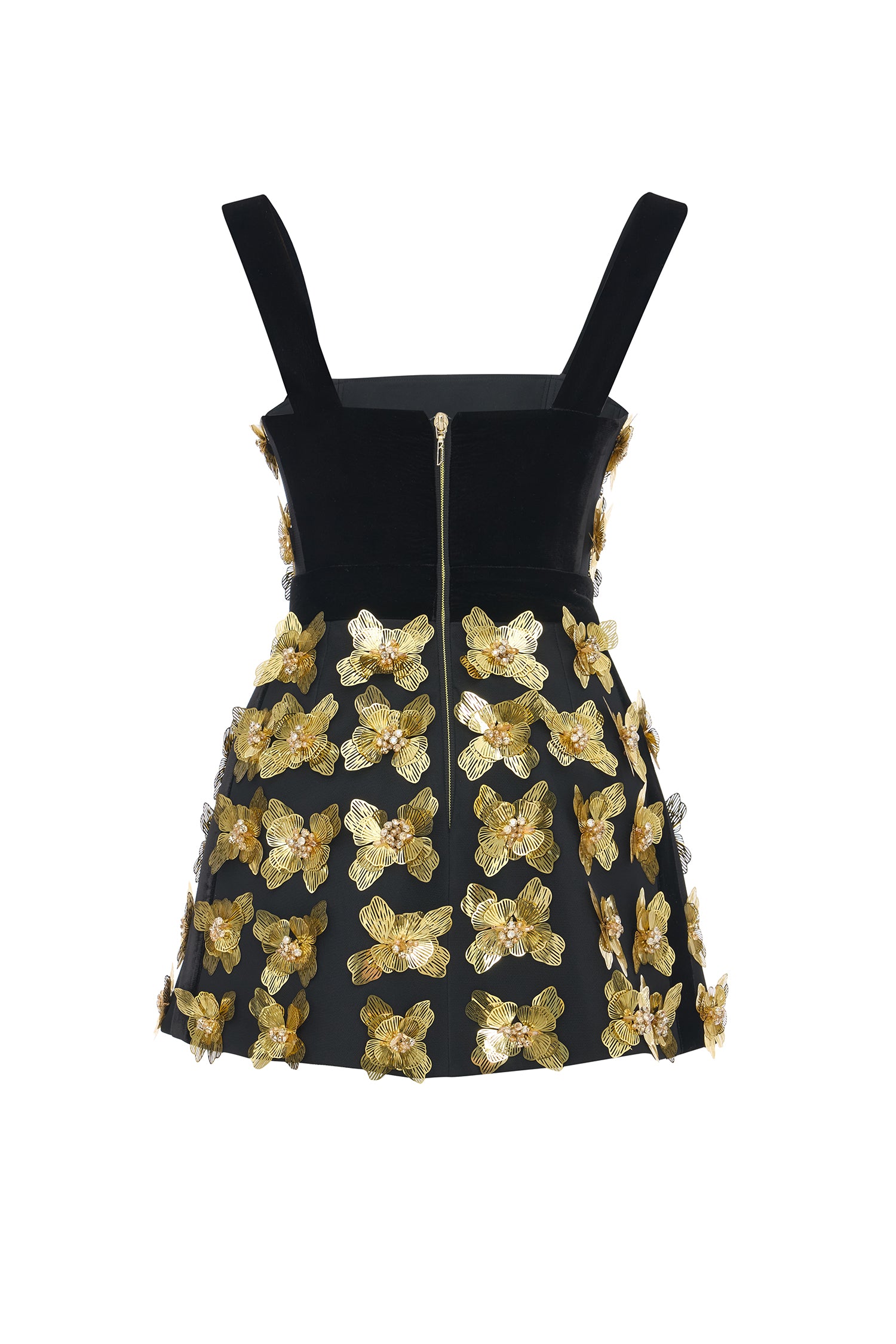 3D Gold Flower Embellished Mini Dress With Black Velvet Detail