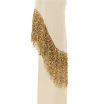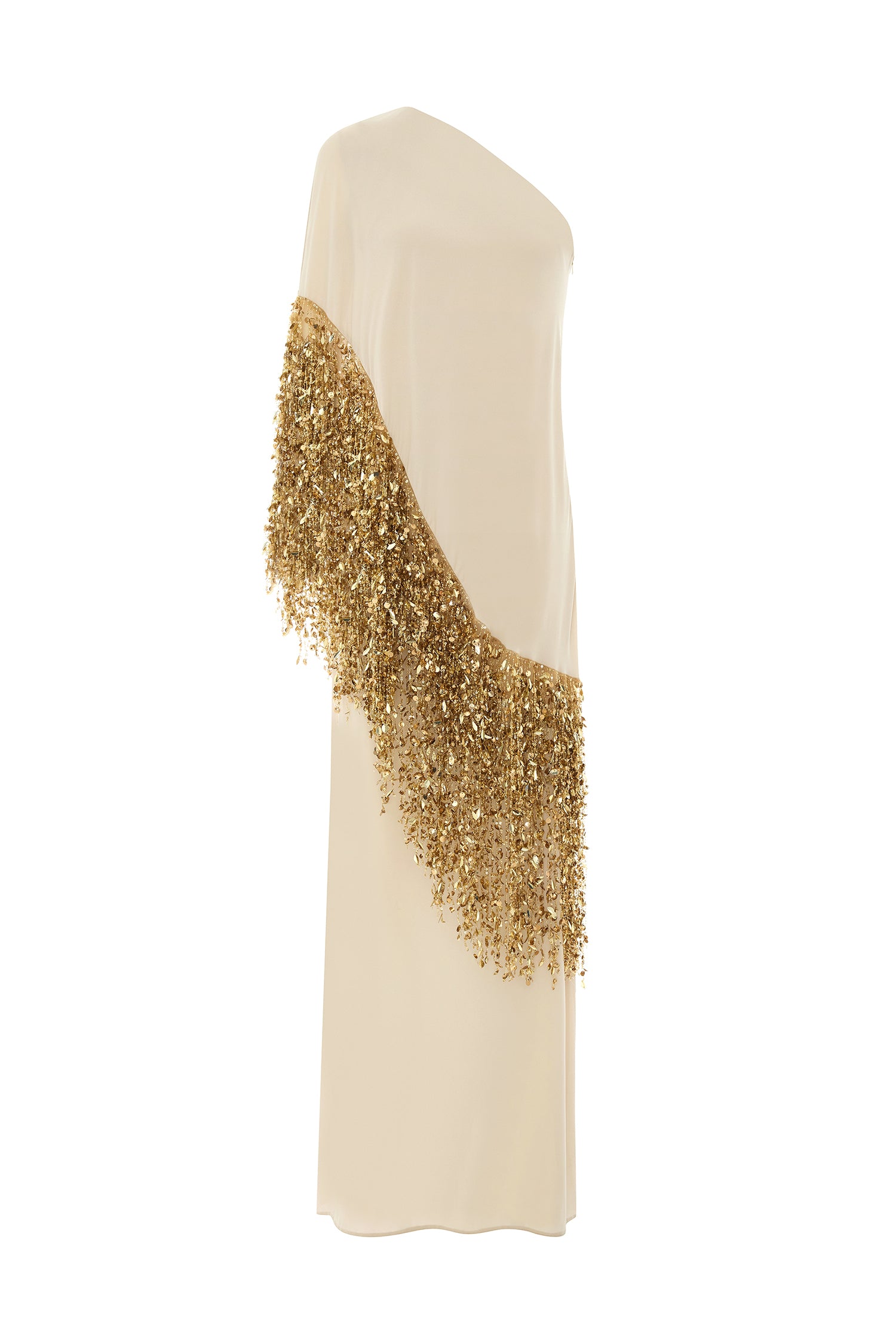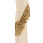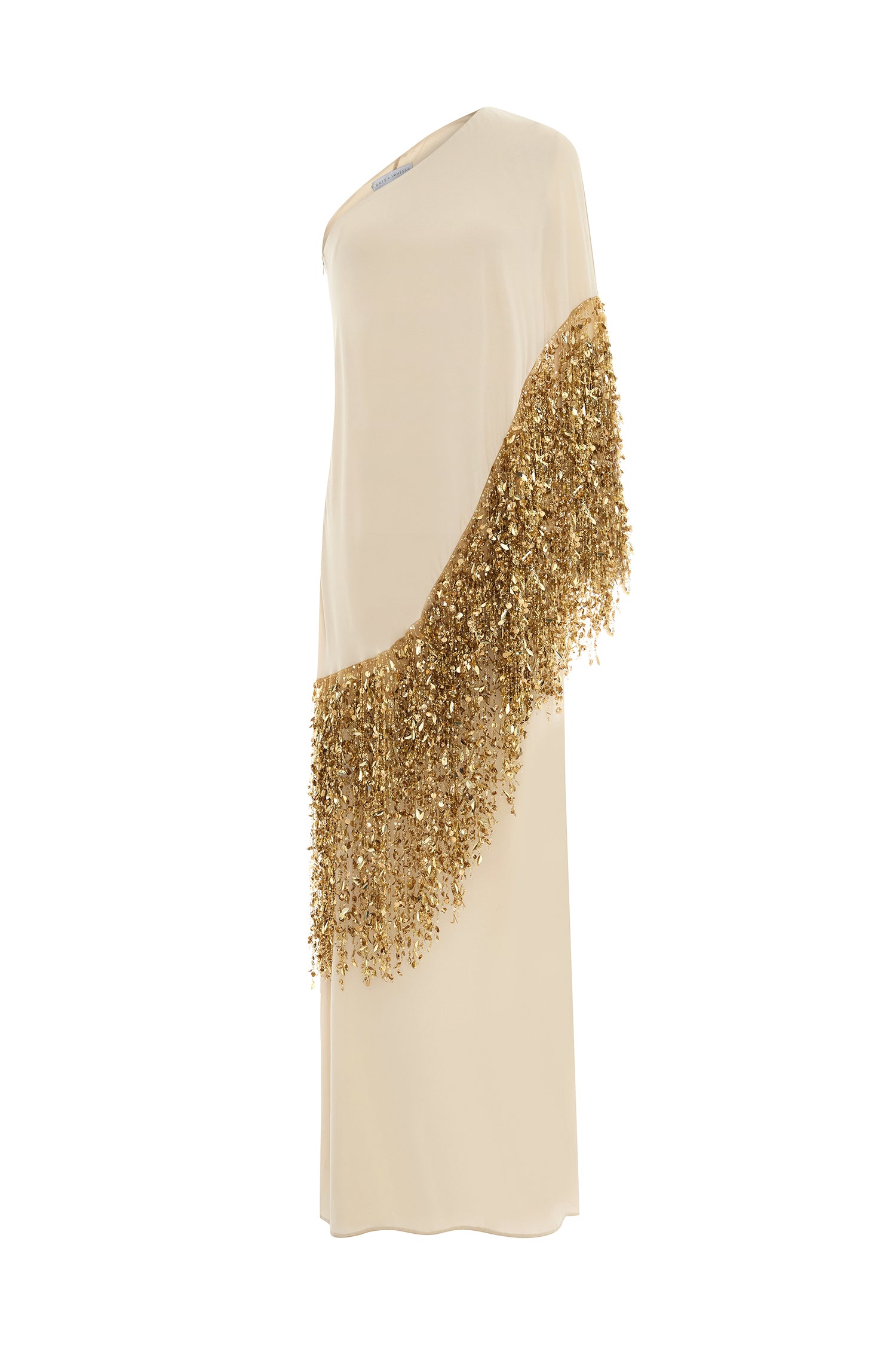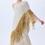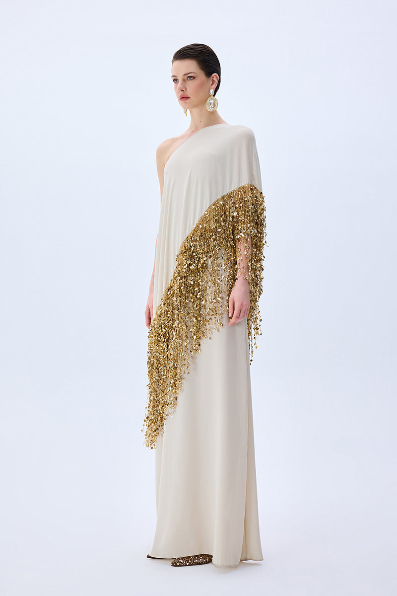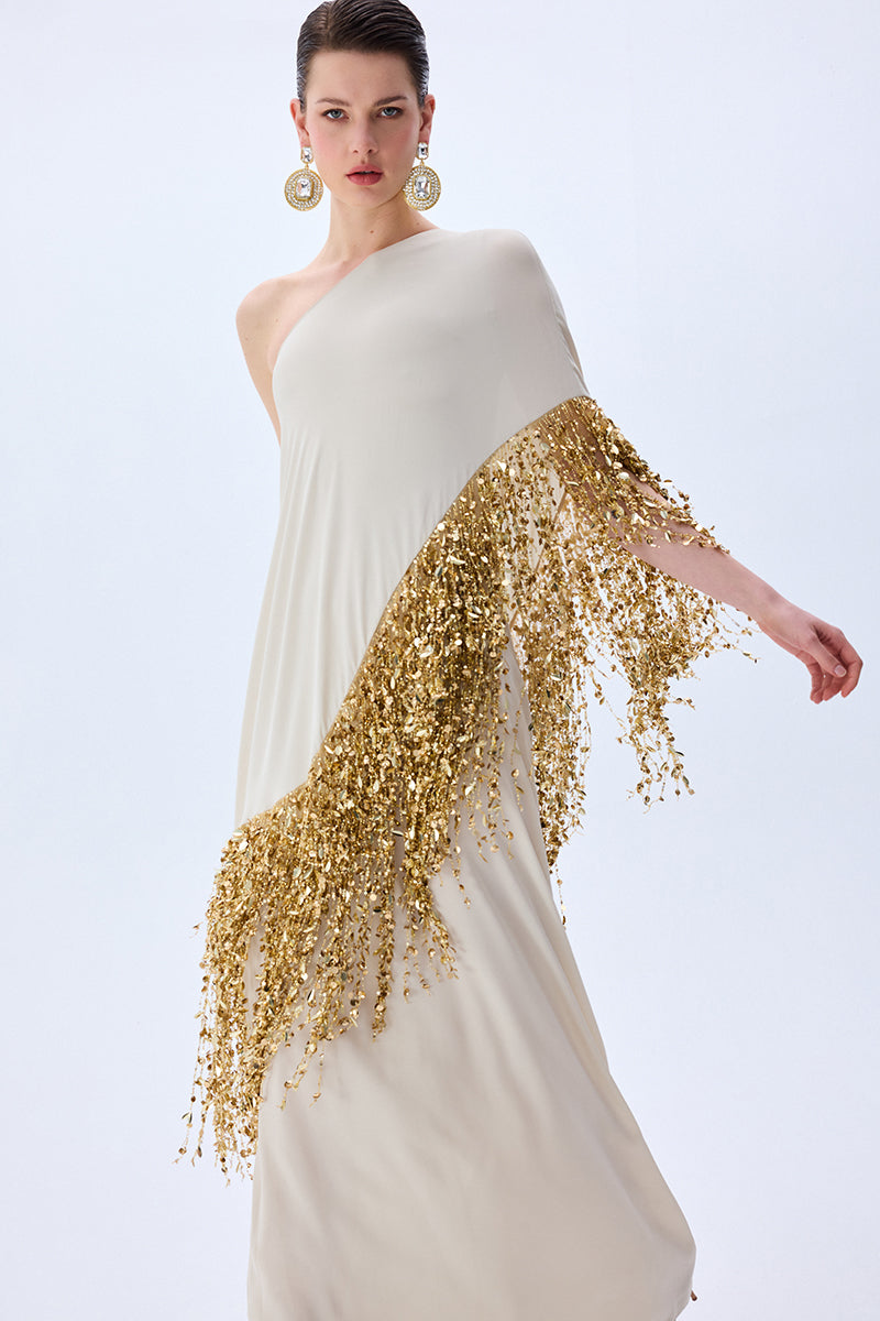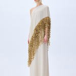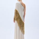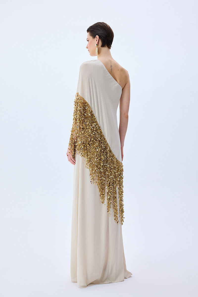 Beige Crepe Chiffon One Shouldered Dress With Gold Pailette Fringes