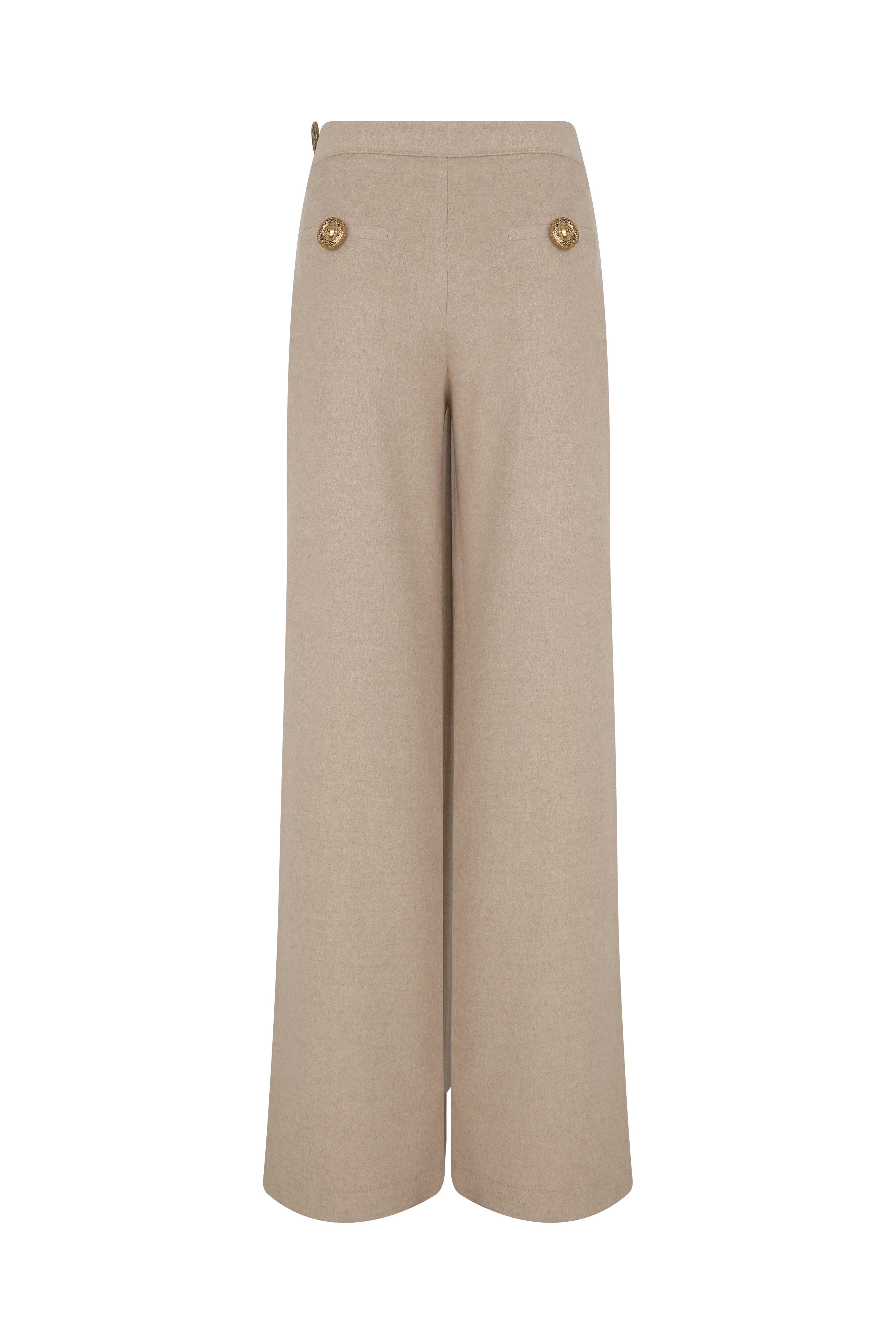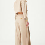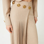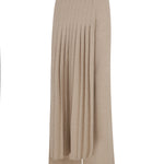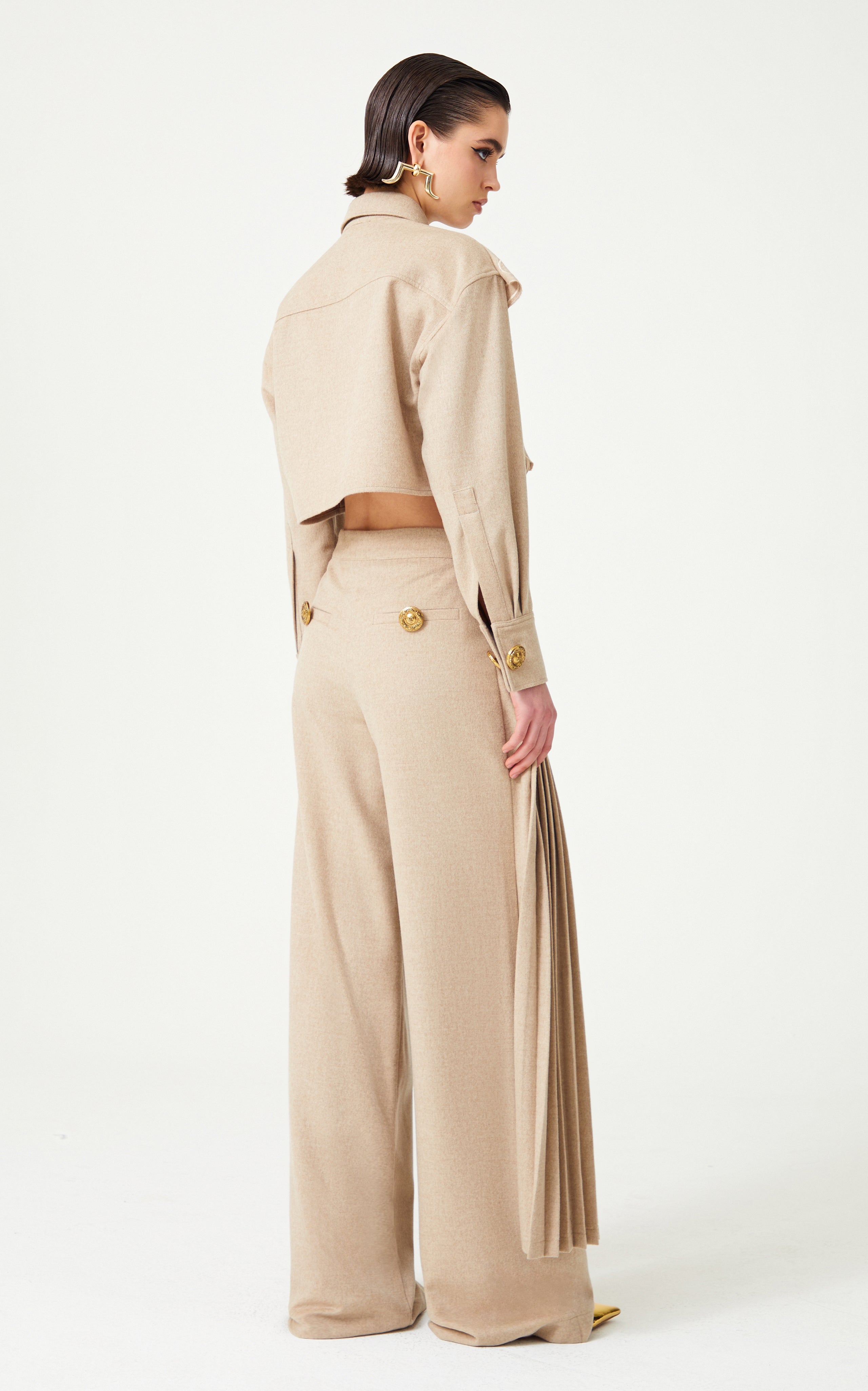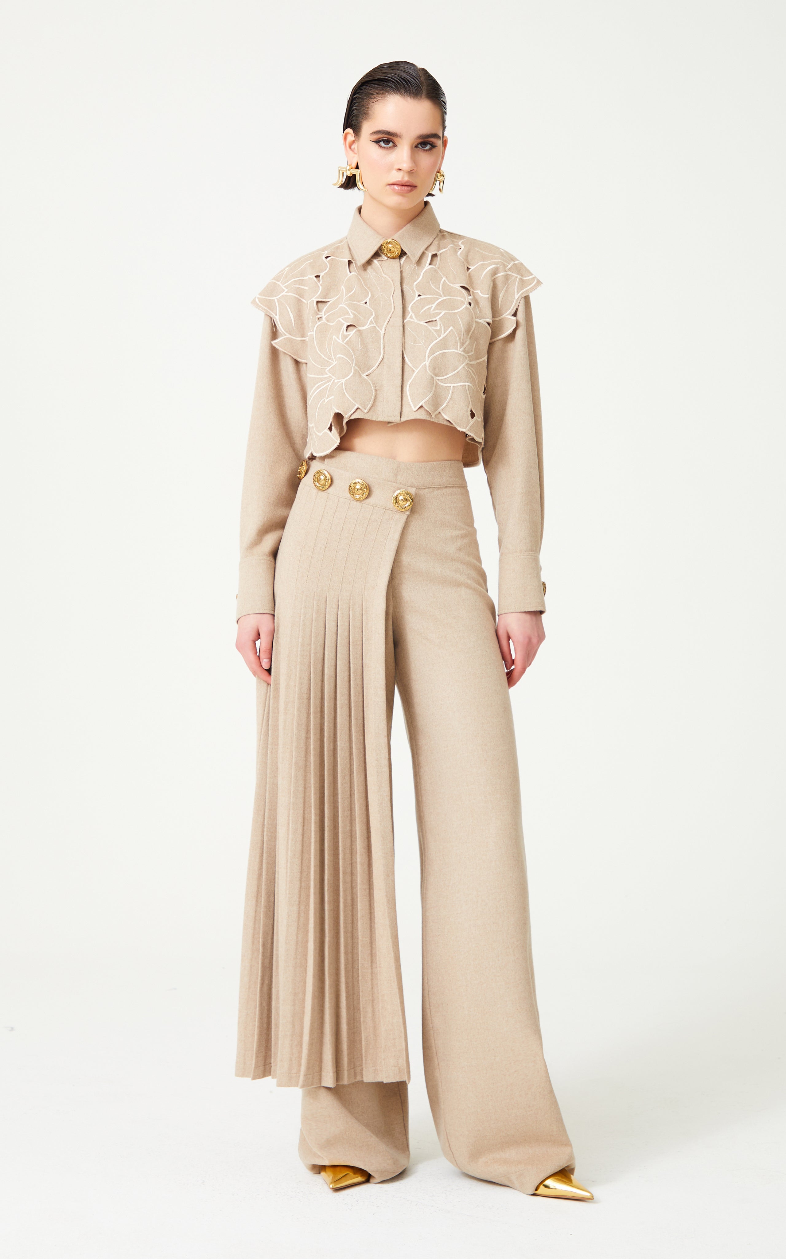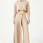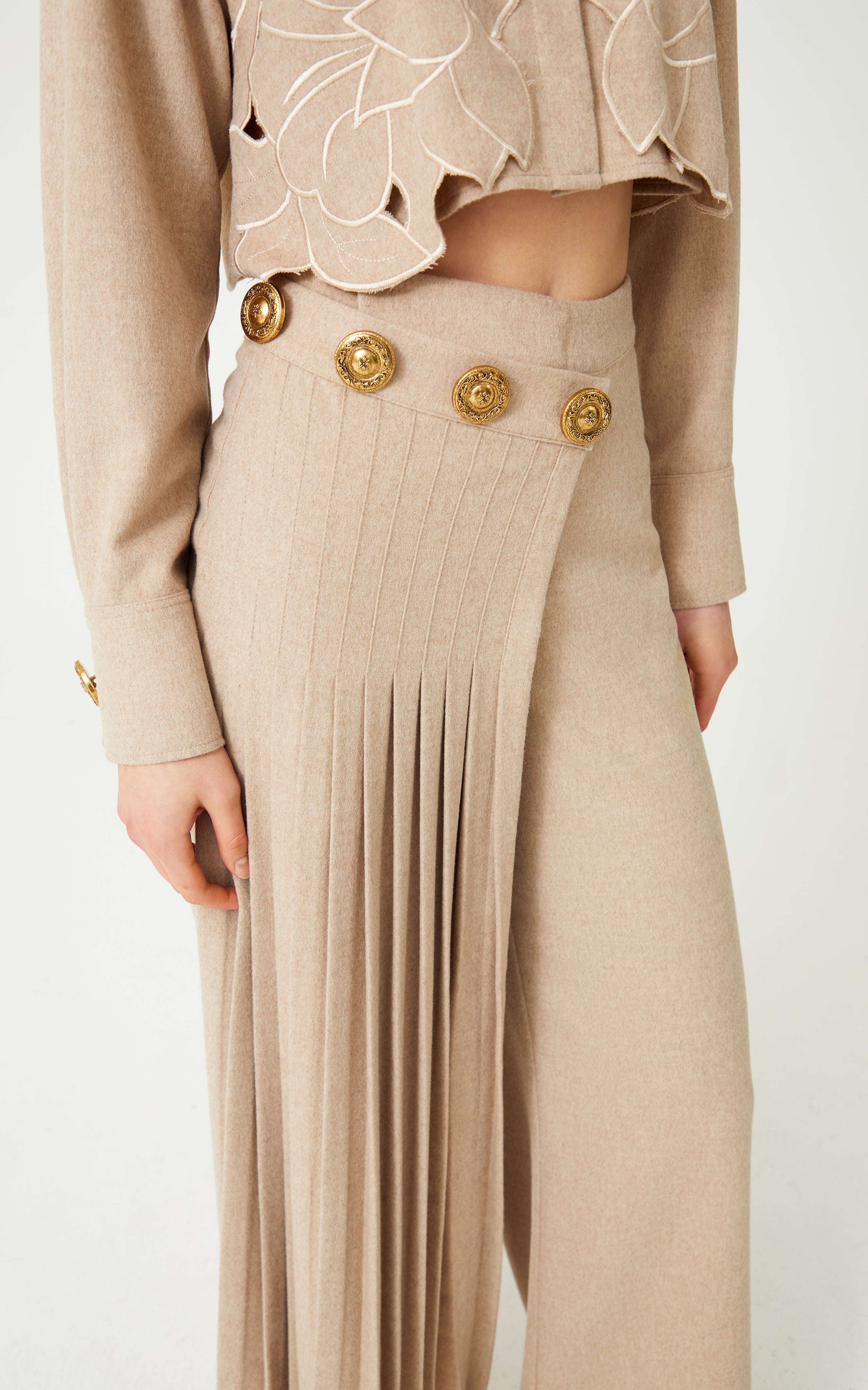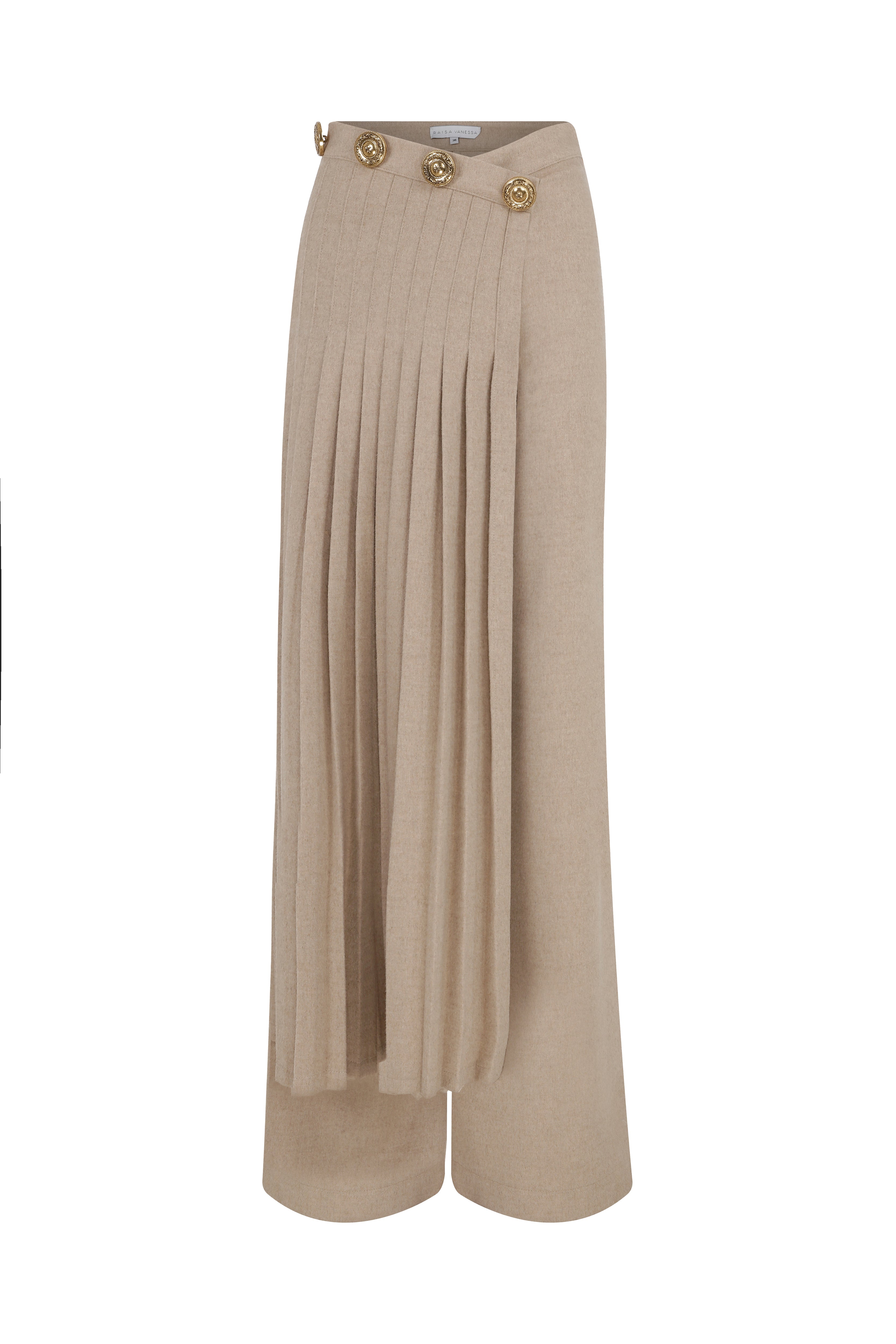 The Beige Wide Pants with Pleated Skirt Detail offer a unique twist on a classic silhouette, combining the comfort of wide-leg pants with the elegance of a pleated skirt, creating a stylish and versatile addition to your wardrobe.