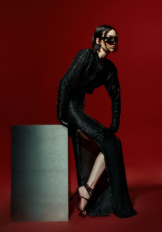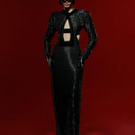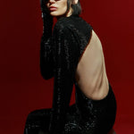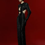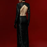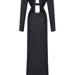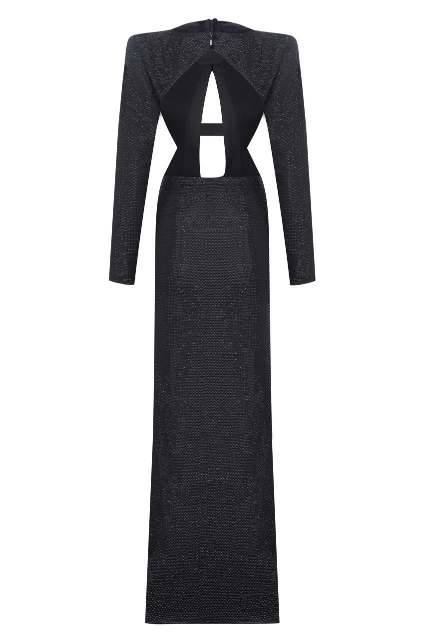 Black satin dress with sparkles, open front detail, high slit, back detail...