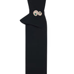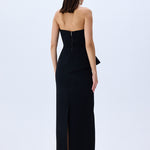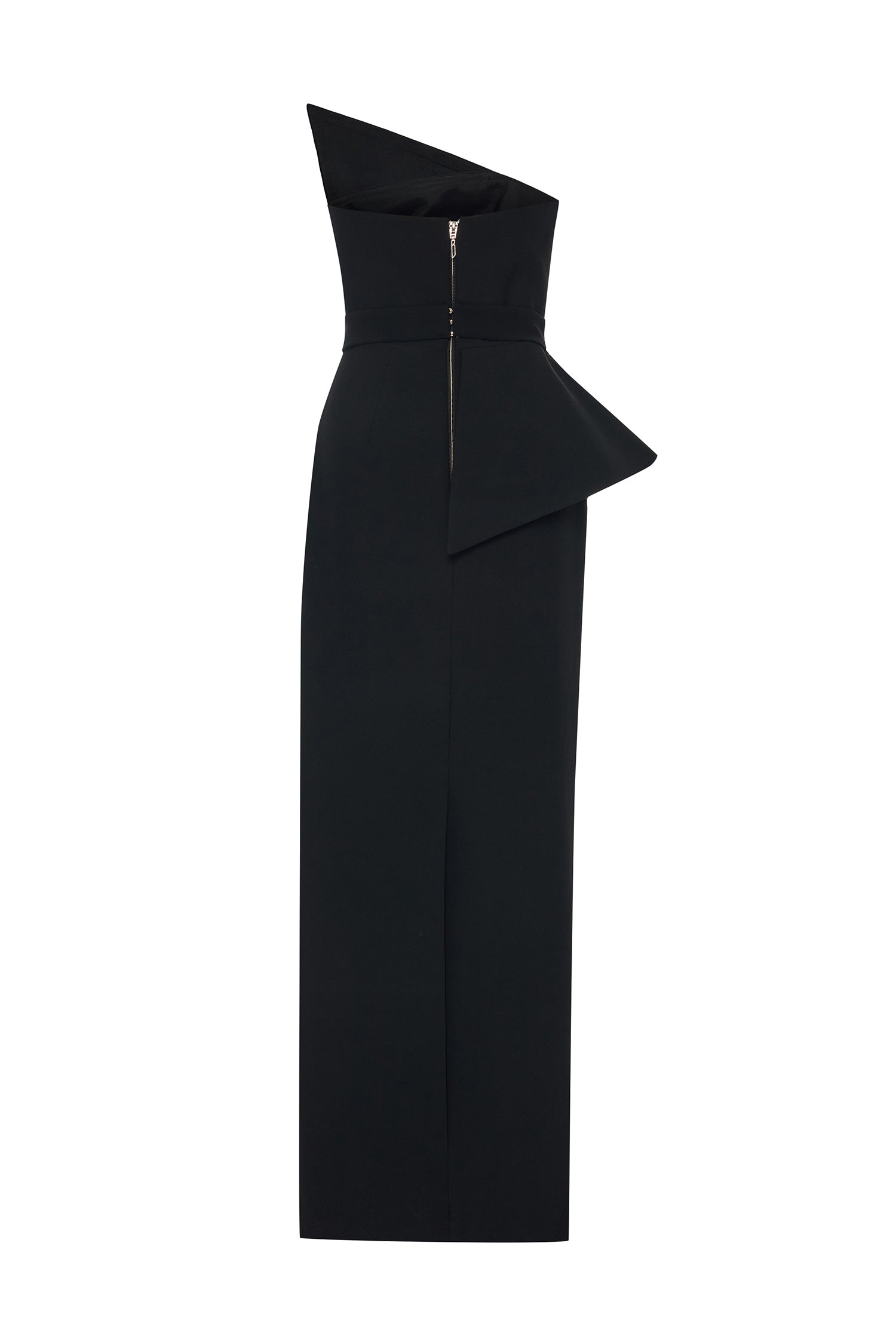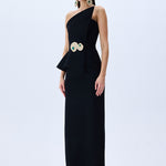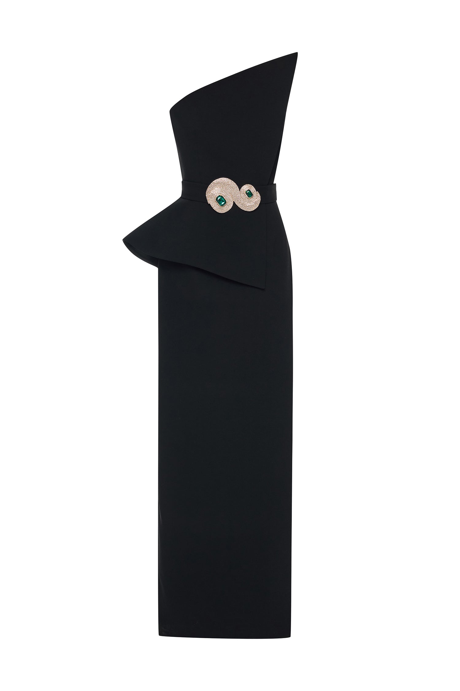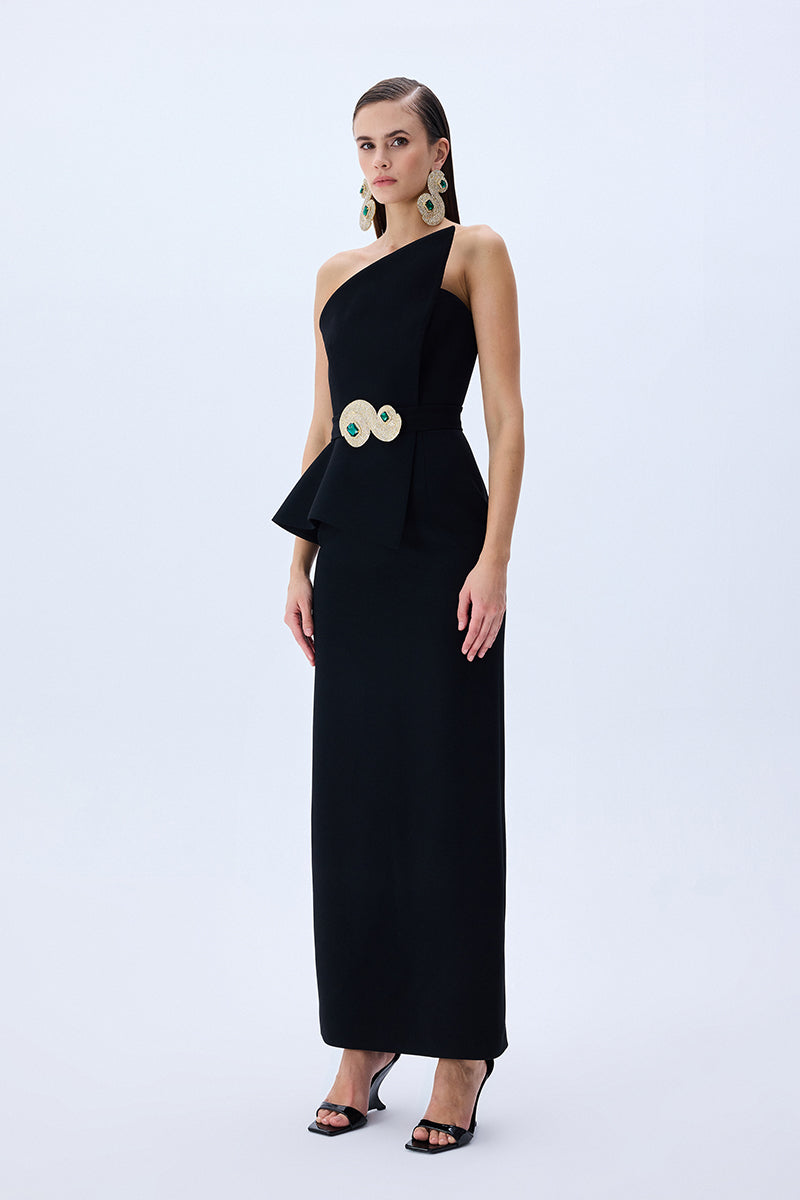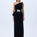 Sculpted in black crepe, the corseted silhouette draws the eye with bold asymmetry and architectural poise. Crystal-embellished medallions at the waist offer a touch of celestial light where structure meets quiet seduction.