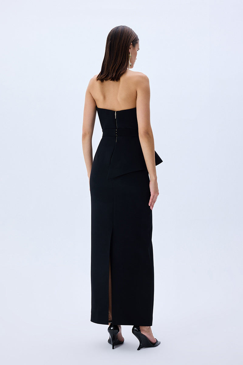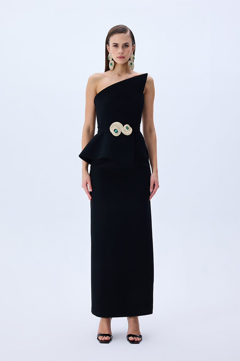 Black Crepe Corseted Architectural Midi Dress With Crystal Belt