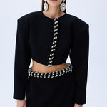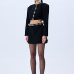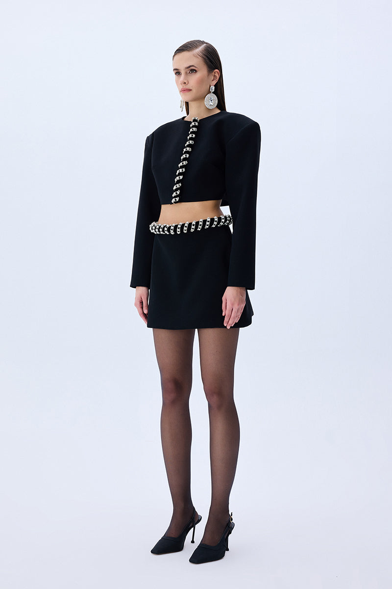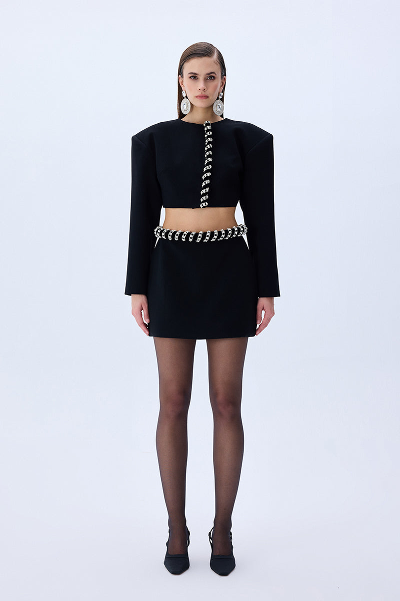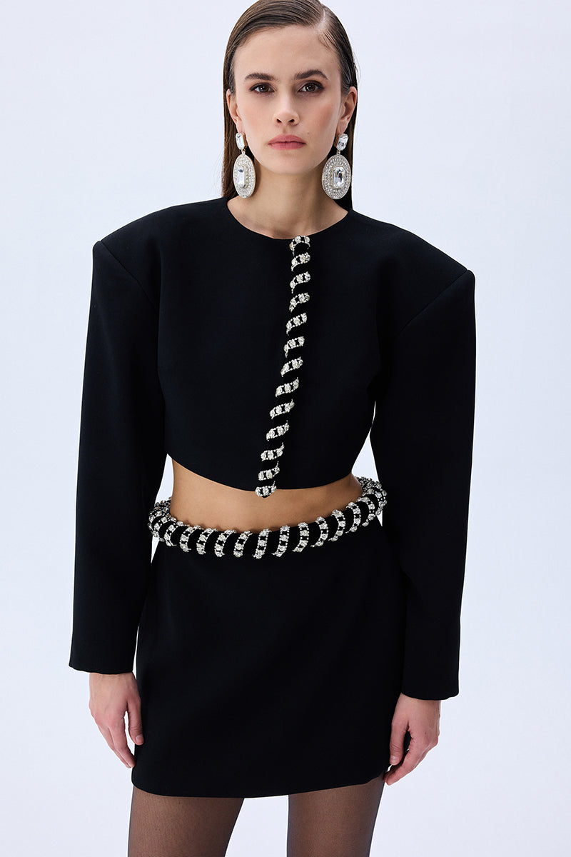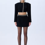 A sleek silhouette crafted from black crepe, the mini skirt is elevated by a crystal rope belt that contours the waist with bold elegance. The minimal design meets statement sparkle, offering a refined balance of structure and allure.