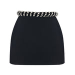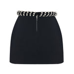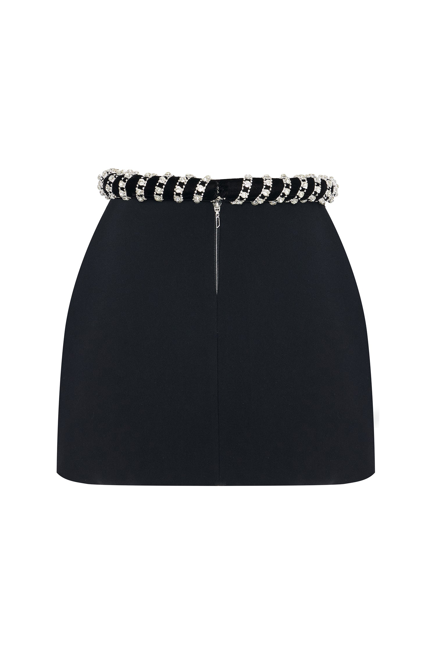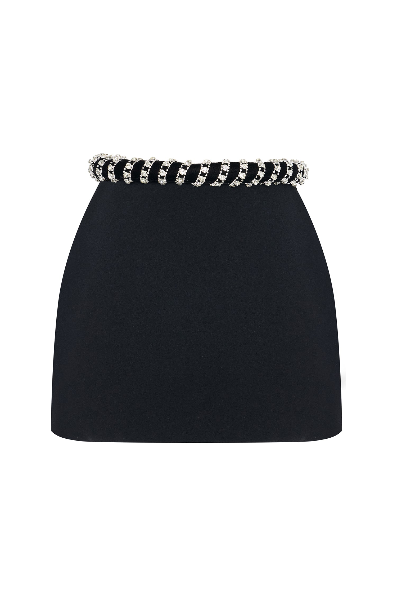 Black Crepe Mini Skirt With Crystal Rope Belt