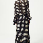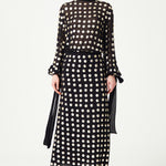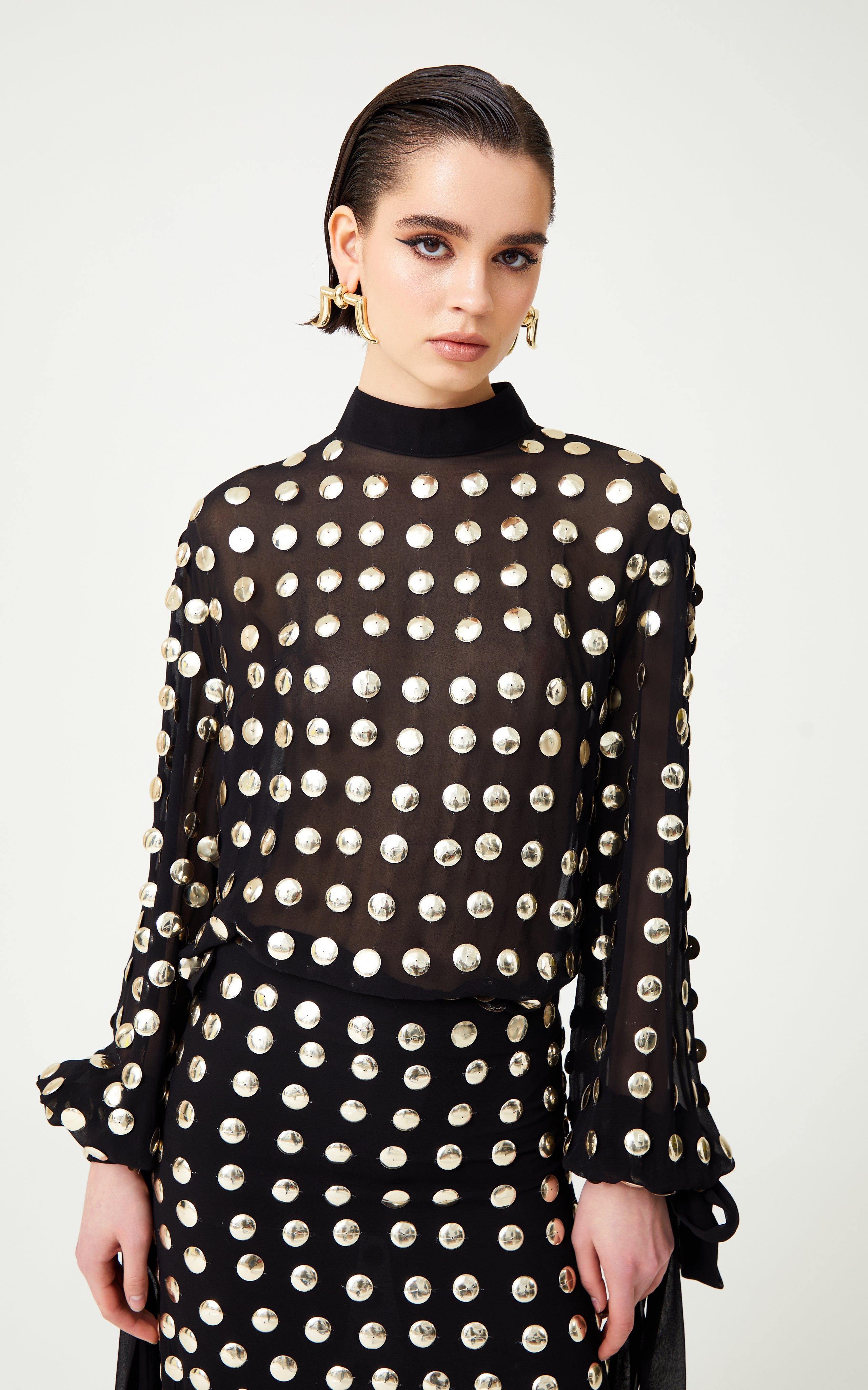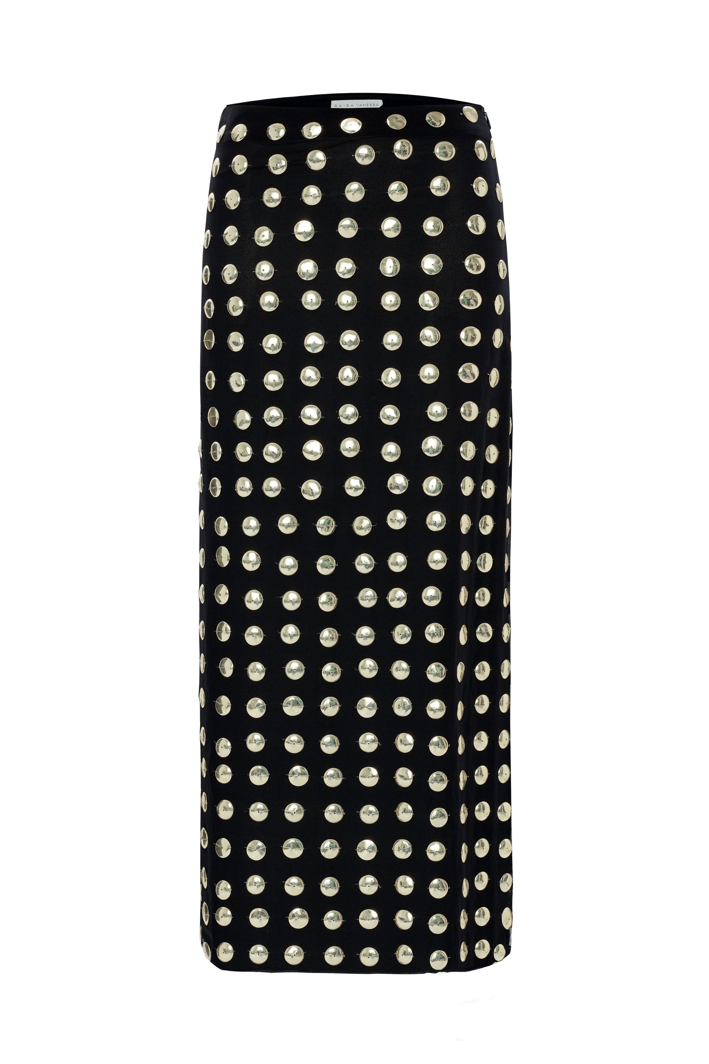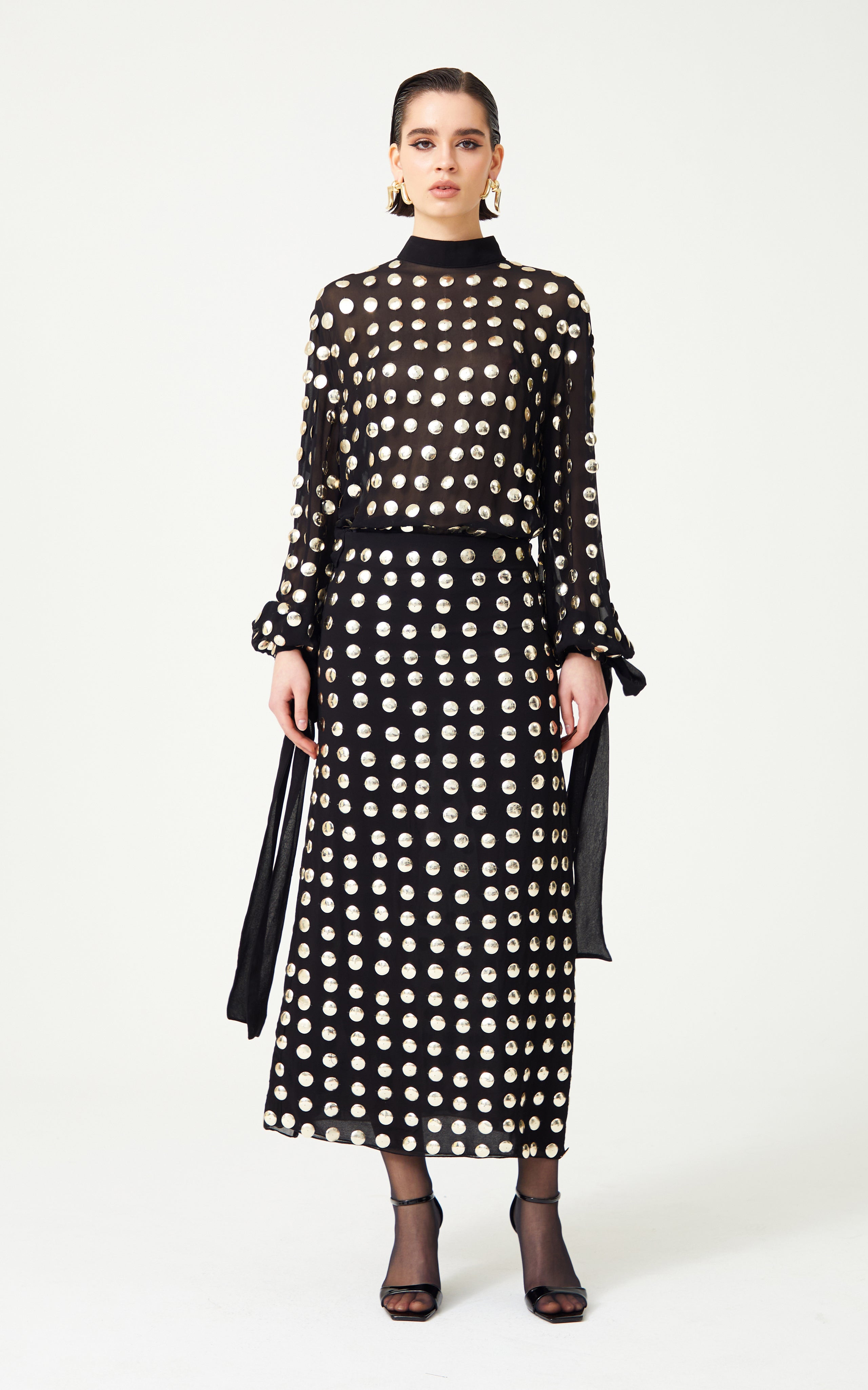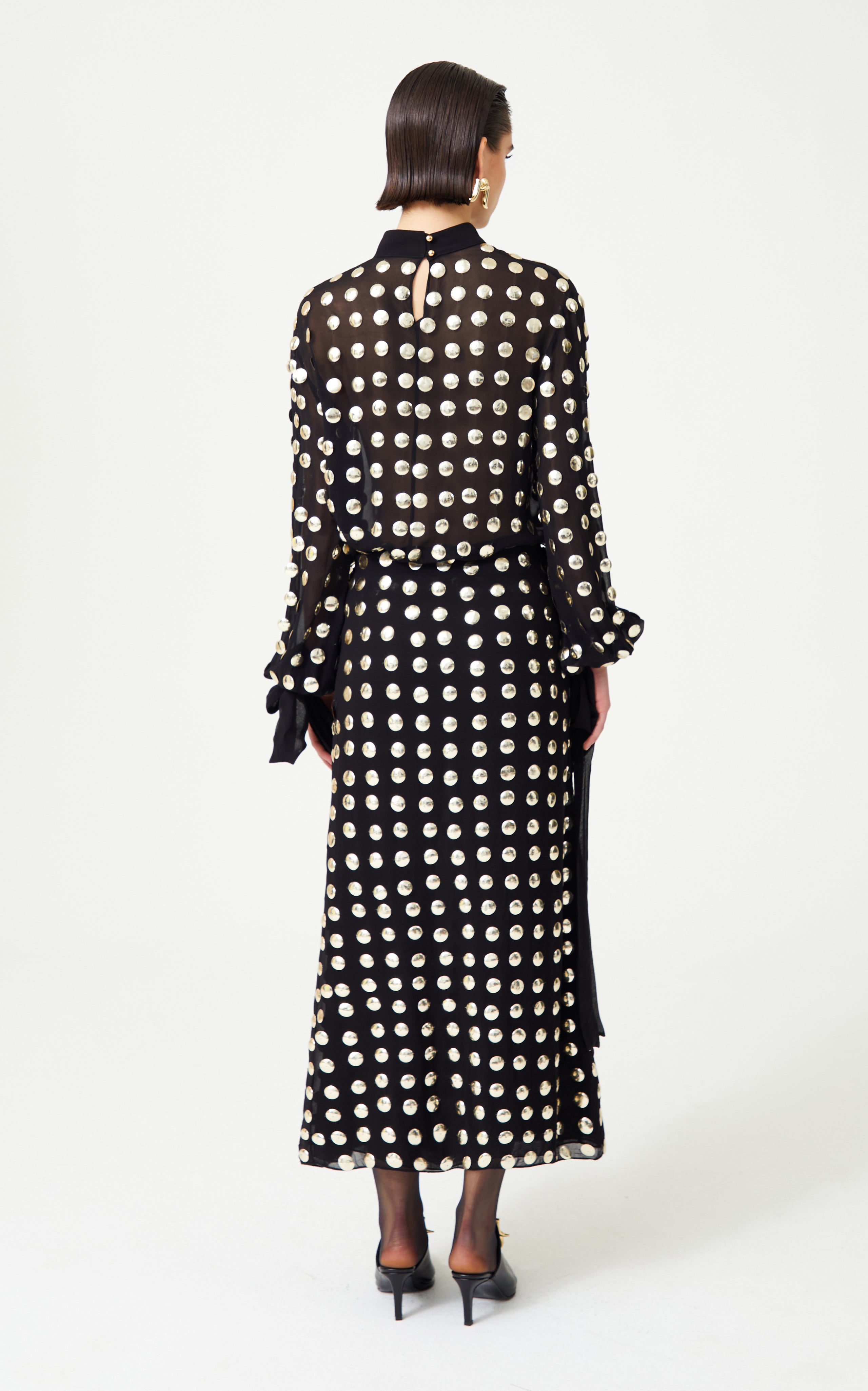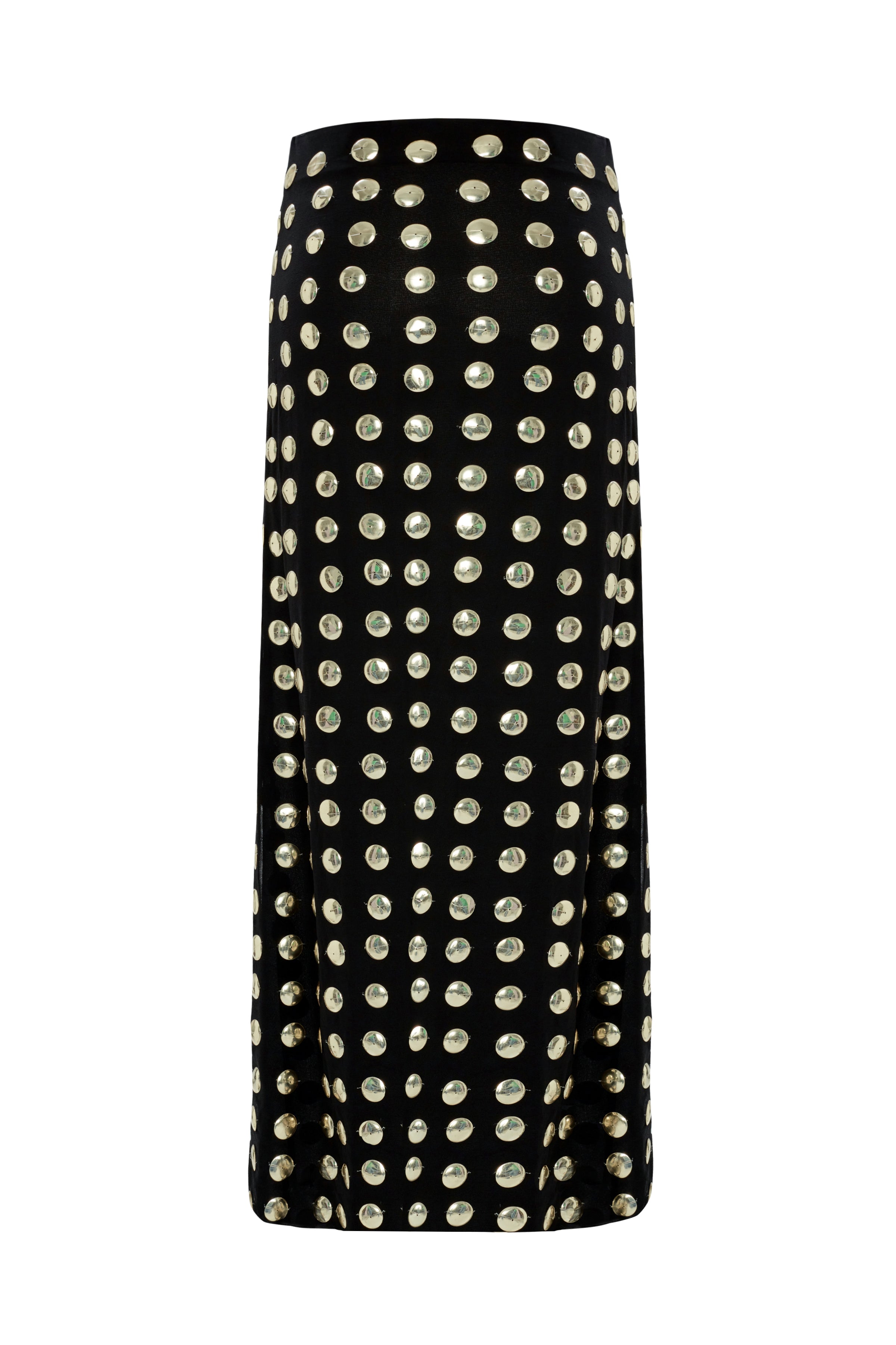 The Black Handmade Gold Polka Dot Detailed Silk Chiffon Ankle Length Skirt exudes luxury with its intricate gold polka dot detailing, offering a perfect balance of sophistication and whimsy for any occasion.