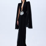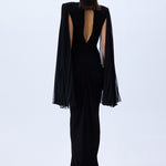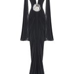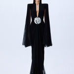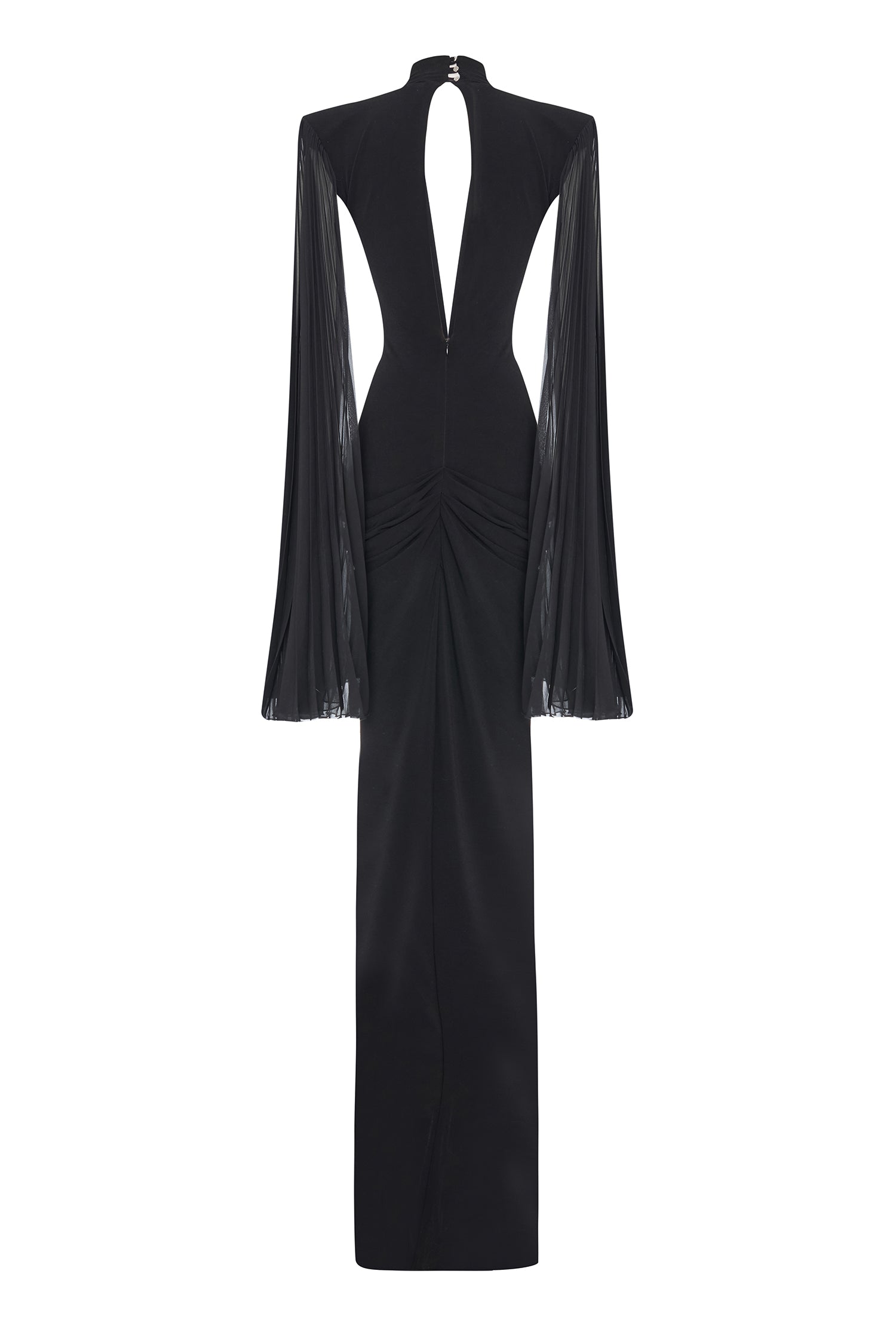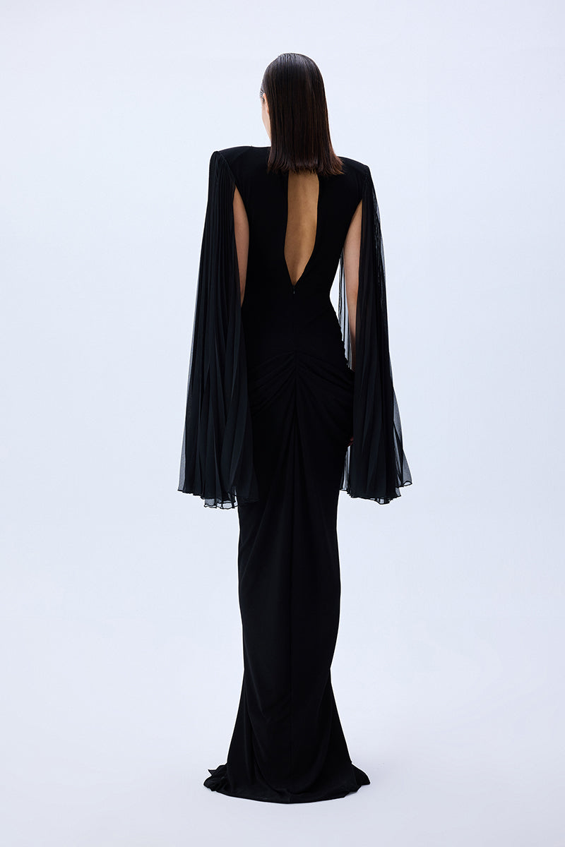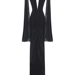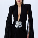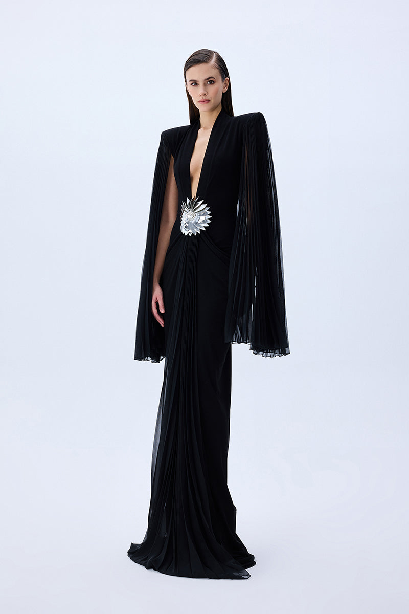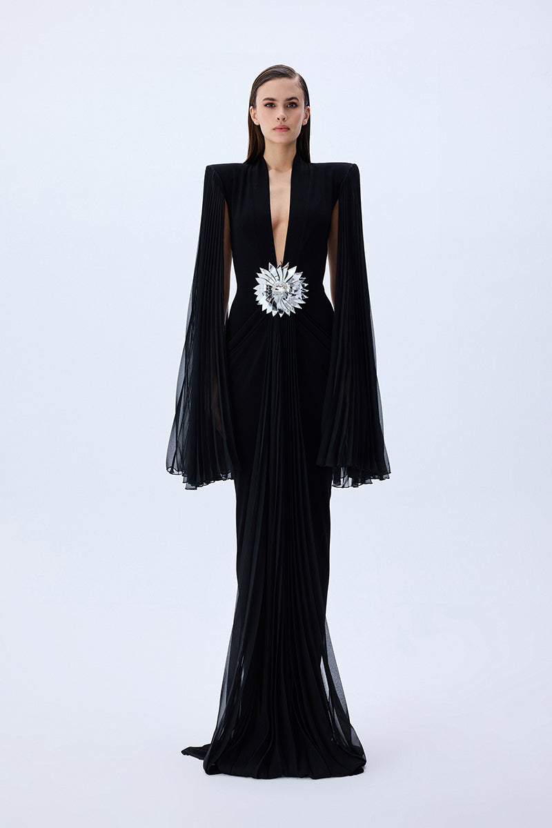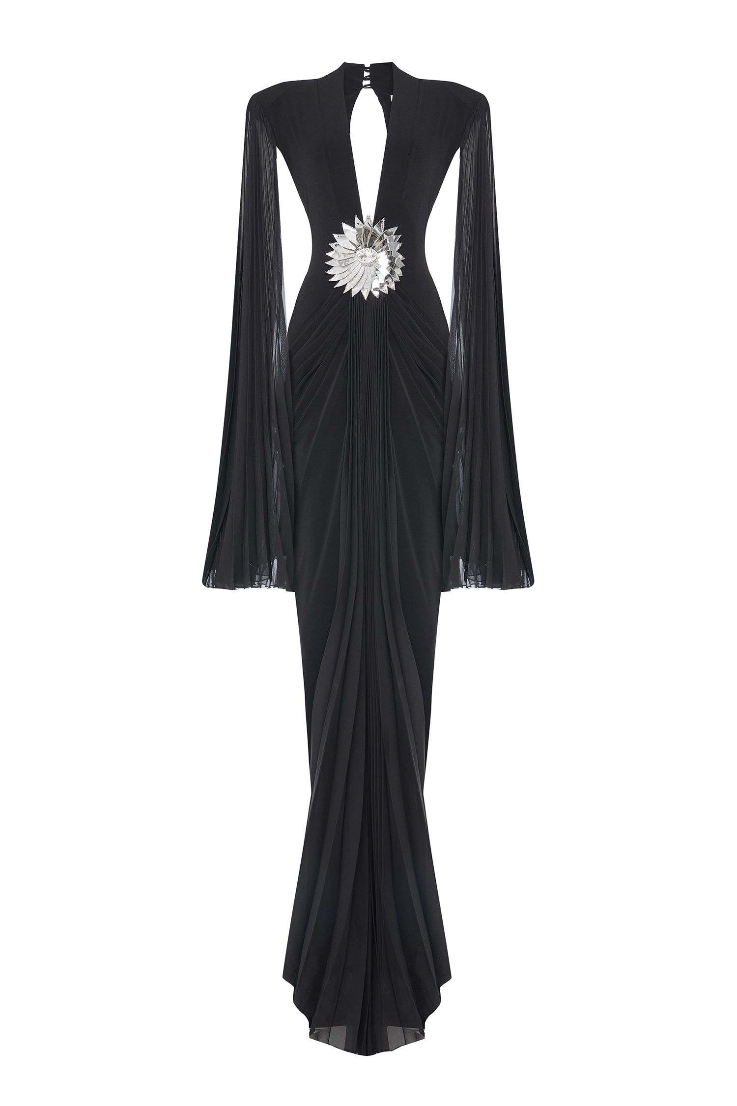 Black jersey dress makes a commanding entrance with pleated chiffon sleeves and a plunging neckline that flows into a sculpted silhouette. The patent flower belt draws focus to the waist, adding a bold, architectural accent to this fluid and fiercely elegant design.