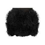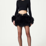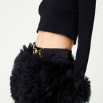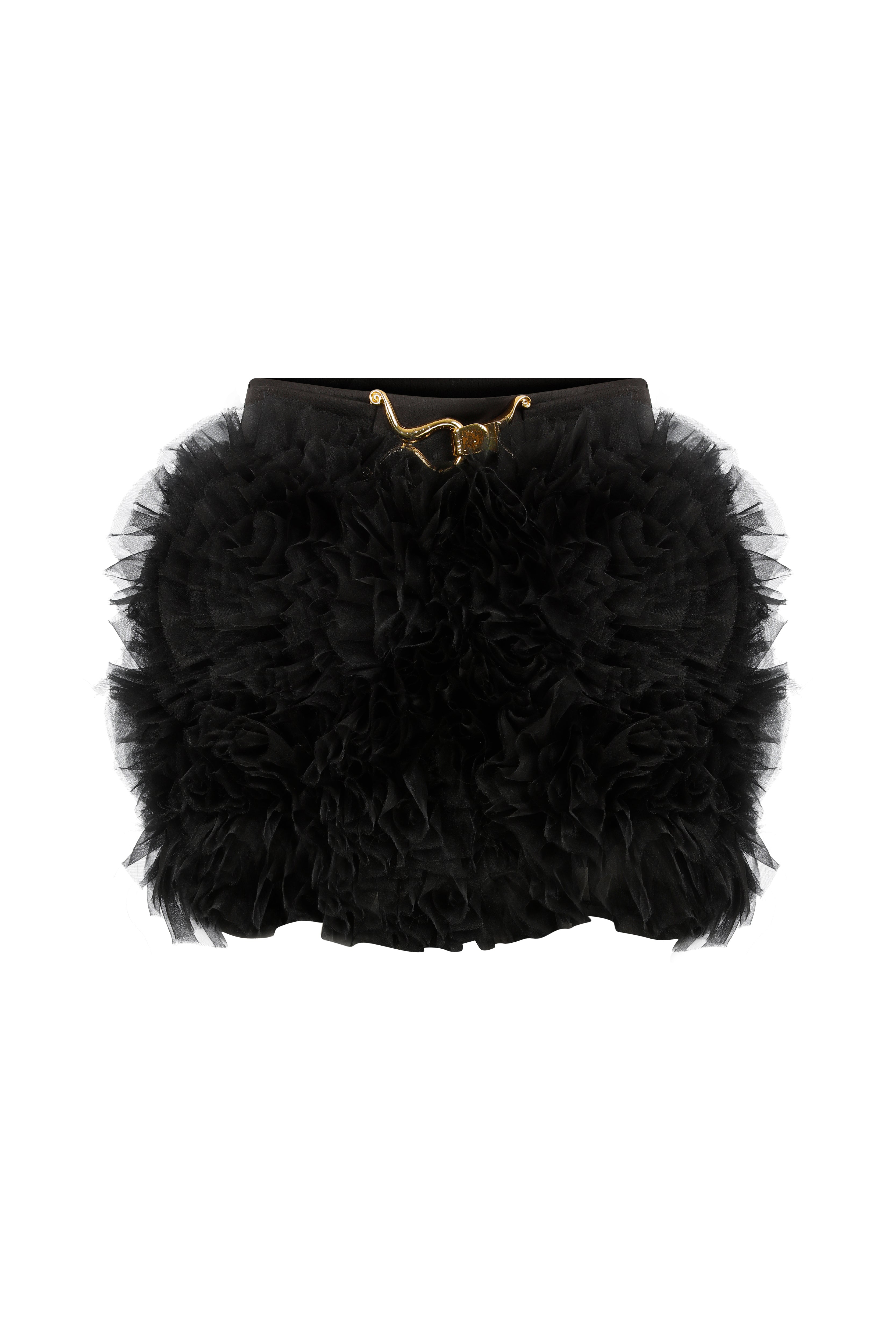 The Black Knit Mini Skirt showcases delightful organza puffy flower details, adding a touch of playful sophistication to this wardrobe essential.