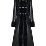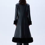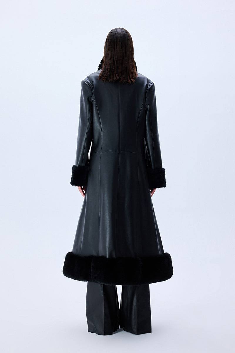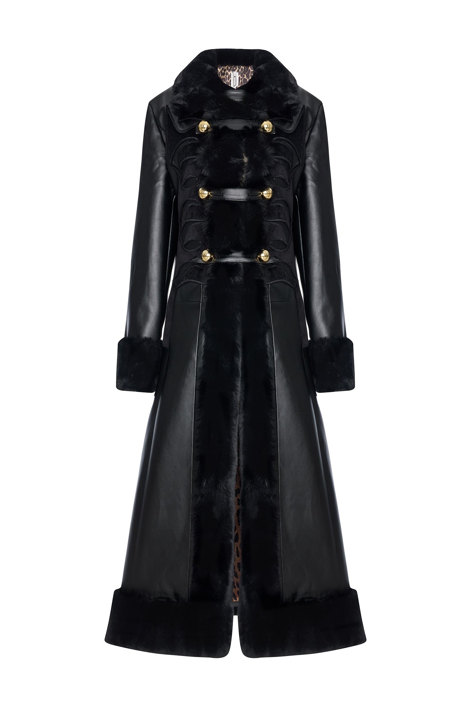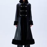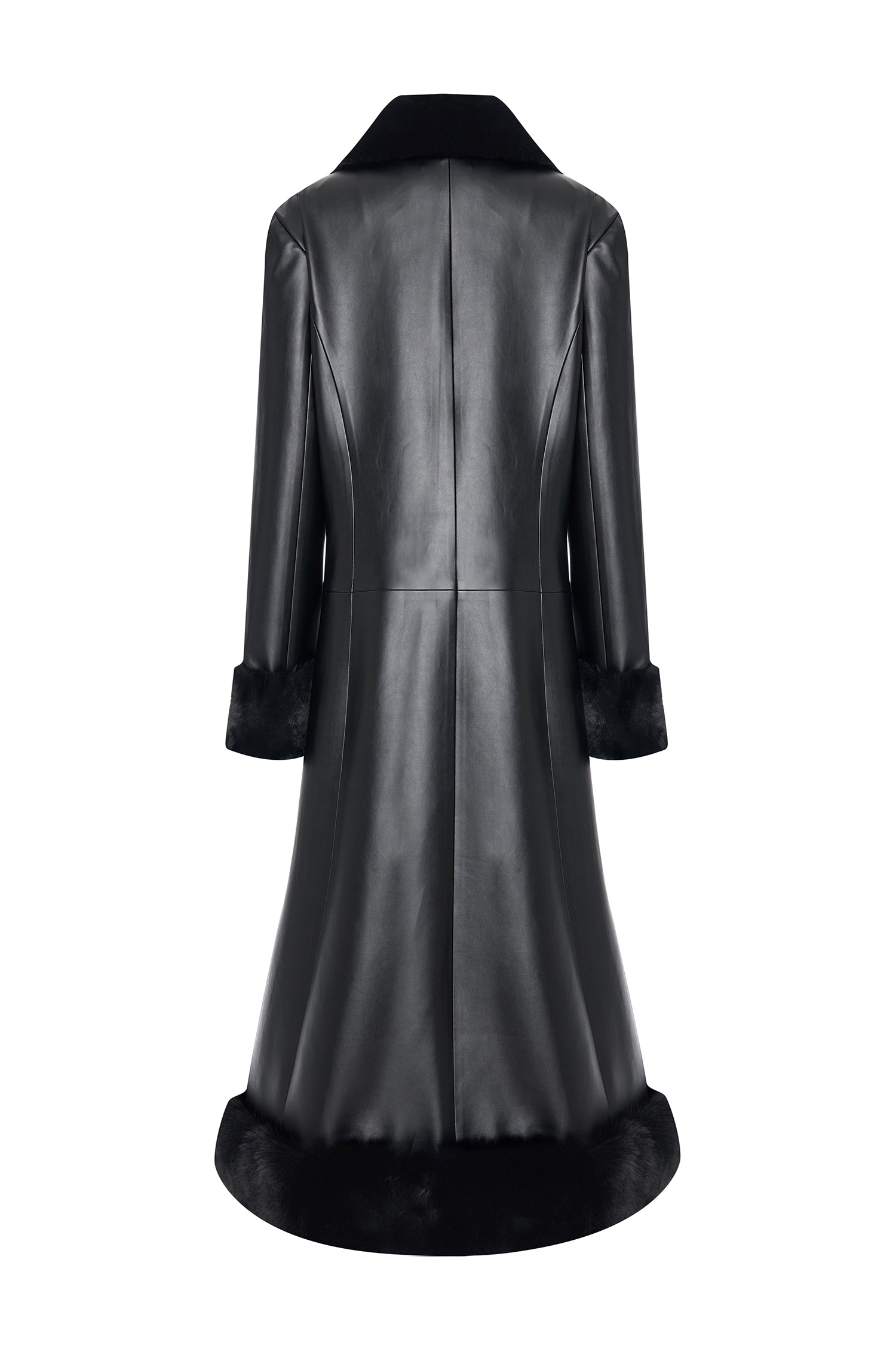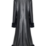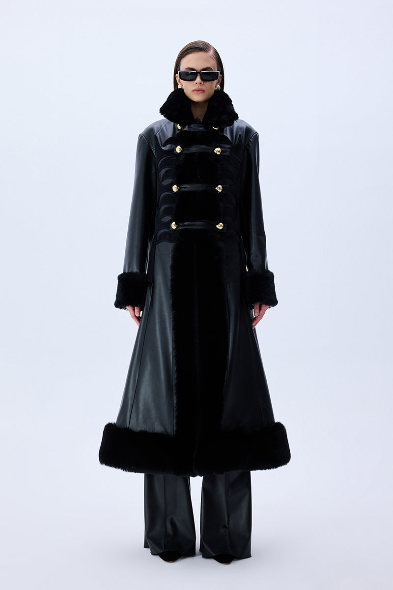Black leather coat blends dramatic volume with textural richness through tonal velvet embroidery and plush fur trims. Defined by a cinched waist, flared hem, and sculpted collar, this full-length silhouette is a statement of bold sophistication and winter opulence.