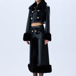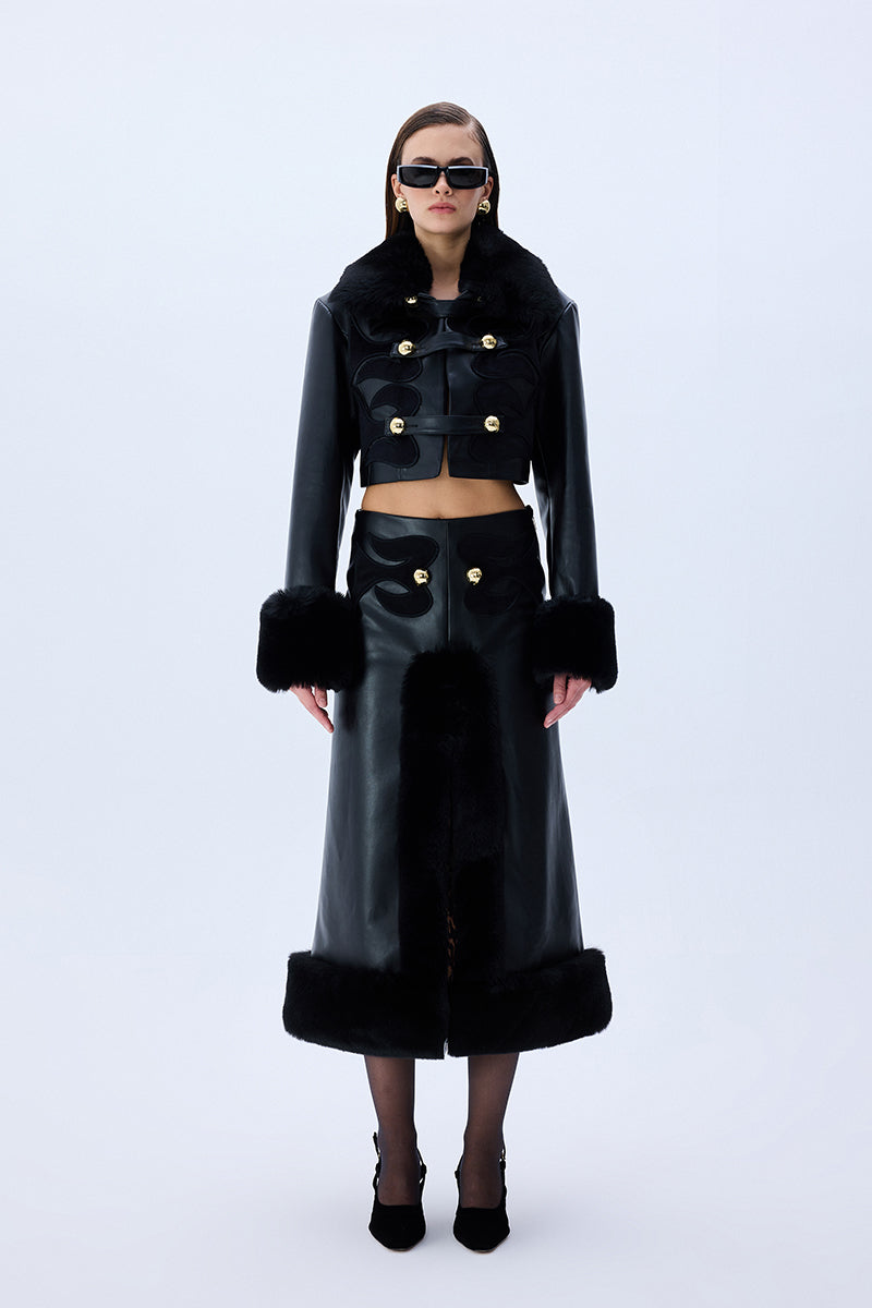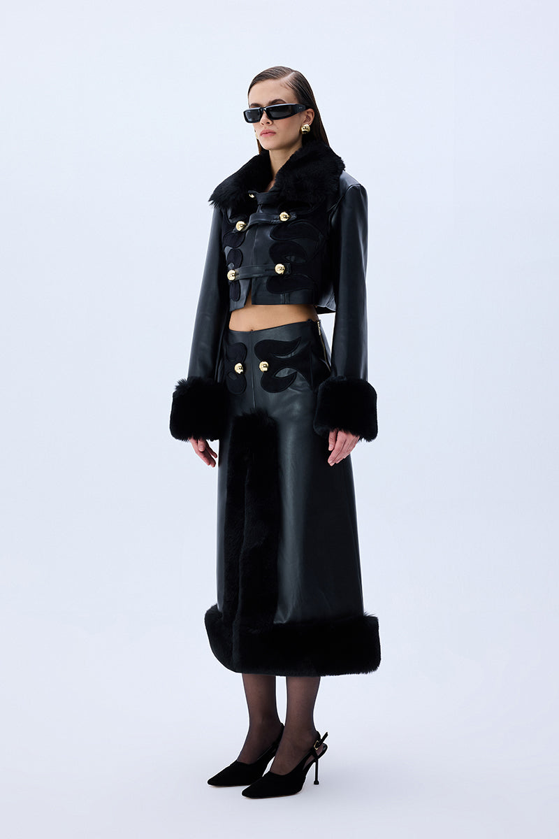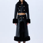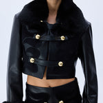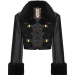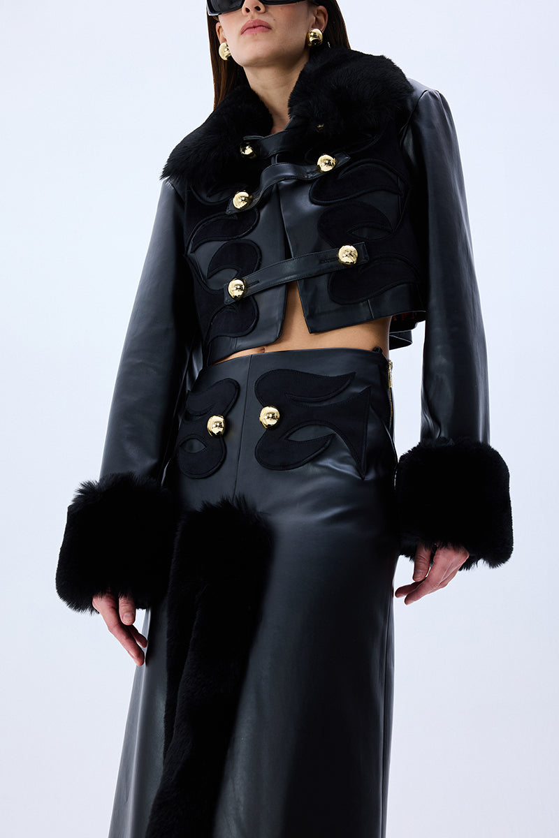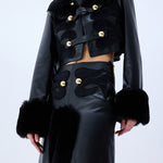 Black leather crop jacket fuses bold tailoring with tactile richness through fur-trimmed cuffs, a sculpted collar, and tonal velvet embroidery. Accented by gleaming gold buttons, the silhouette delivers a confident, statement-making balance of structure and sensuality.