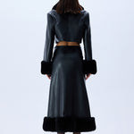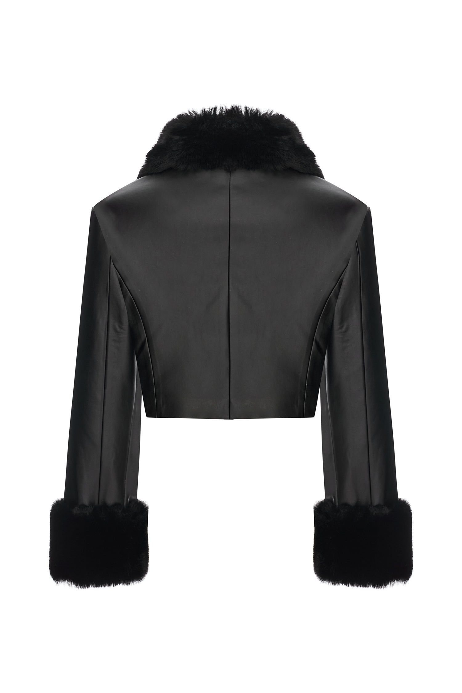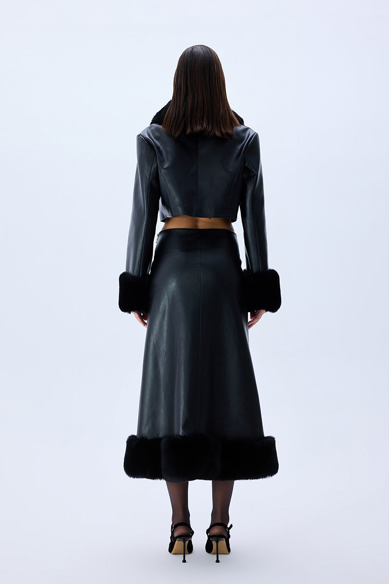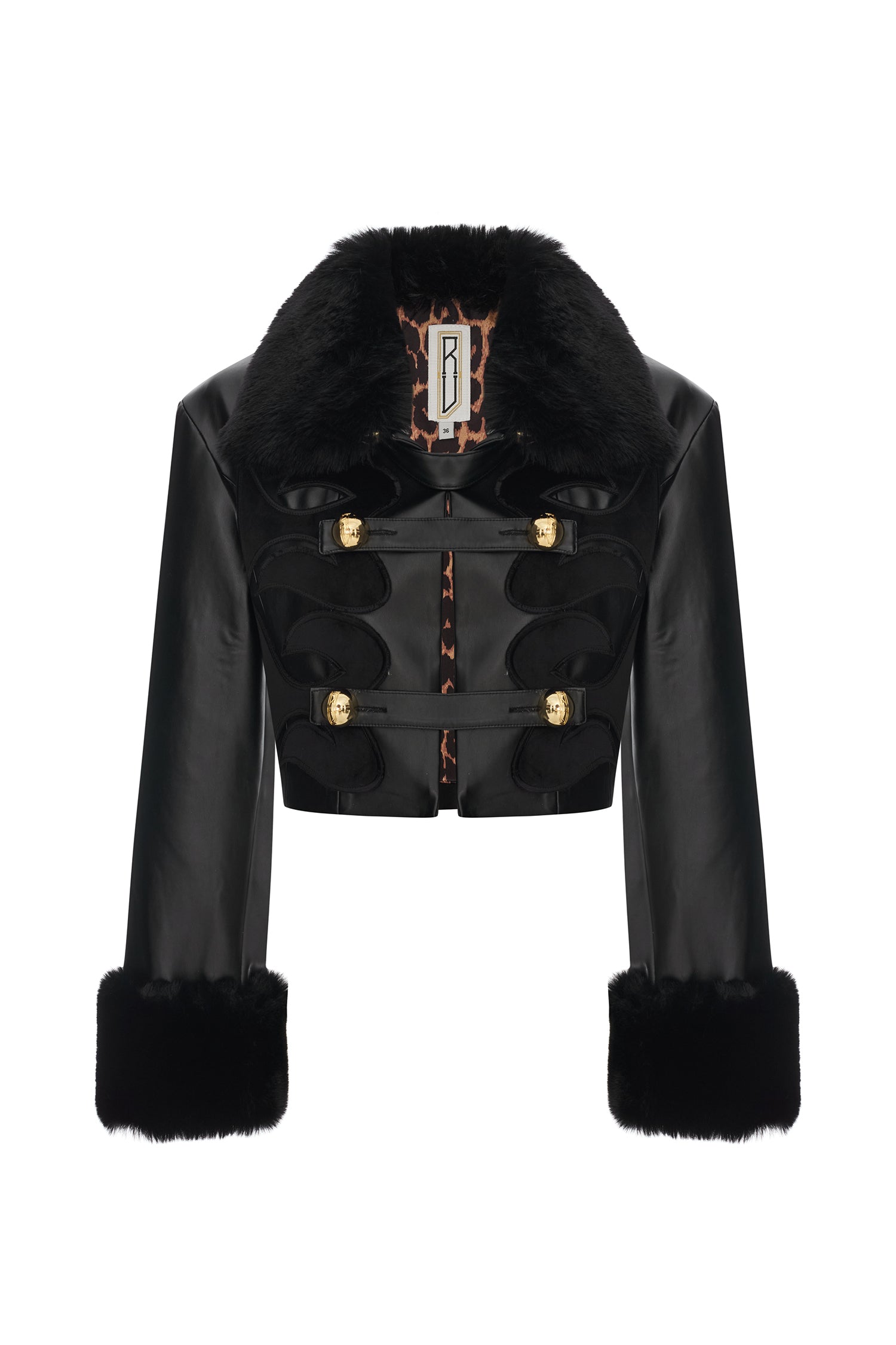 Black leather crop jacket fuses bold tailoring with tactile richness through fur-trimmed cuffs, a sculpted collar, and tonal velvet embroidery. Accented by gleaming gold buttons, the silhouette delivers a confident, statement-making balance of structure and sensuality.