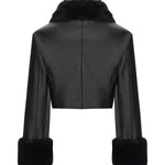 Black Leather Crop Jacket With Fur Finishing And Black Velvet Embroidery