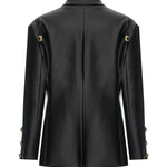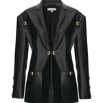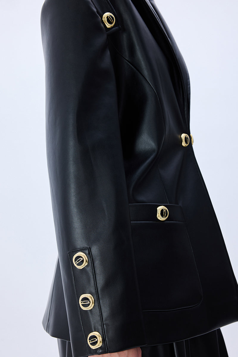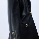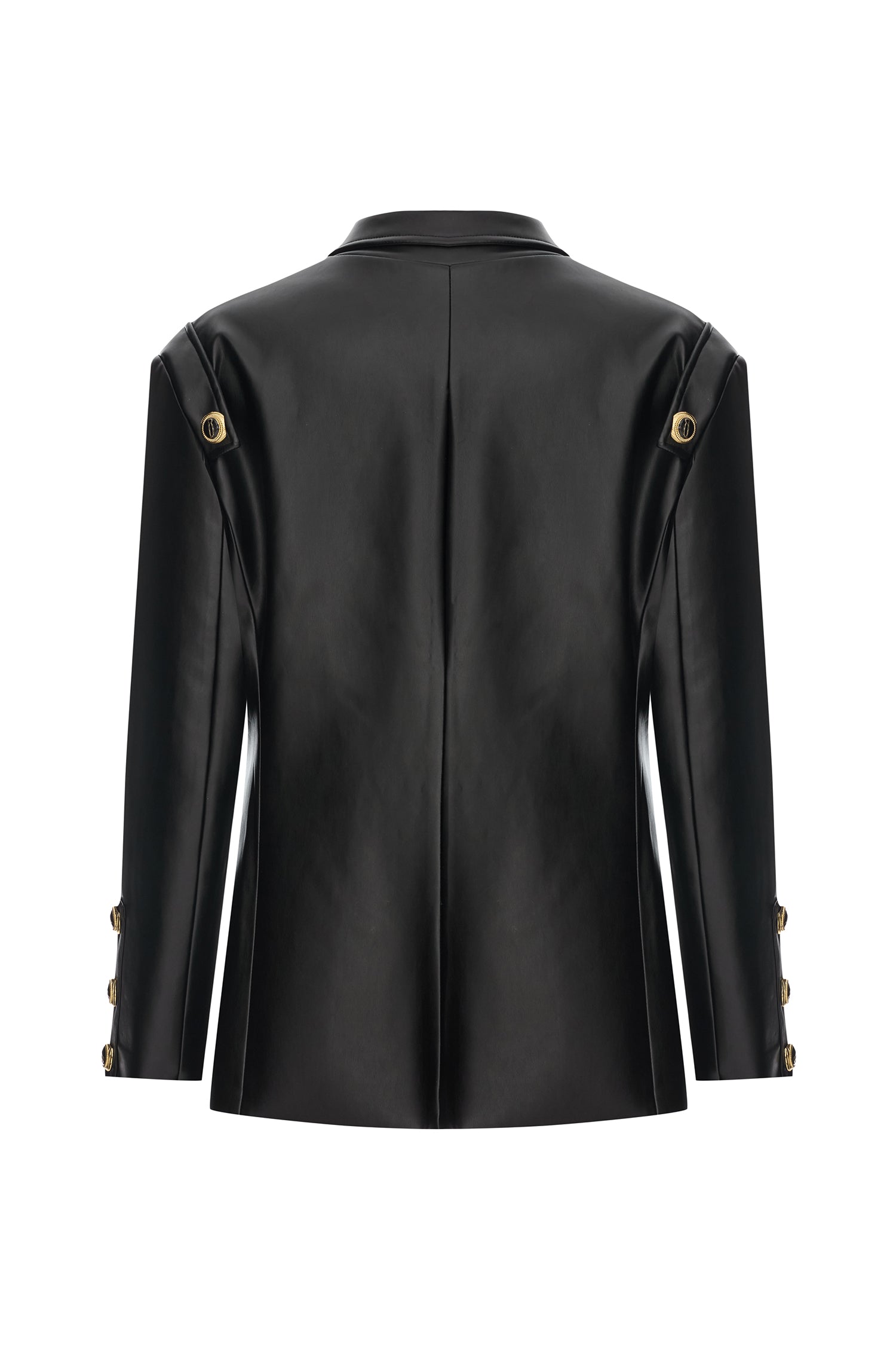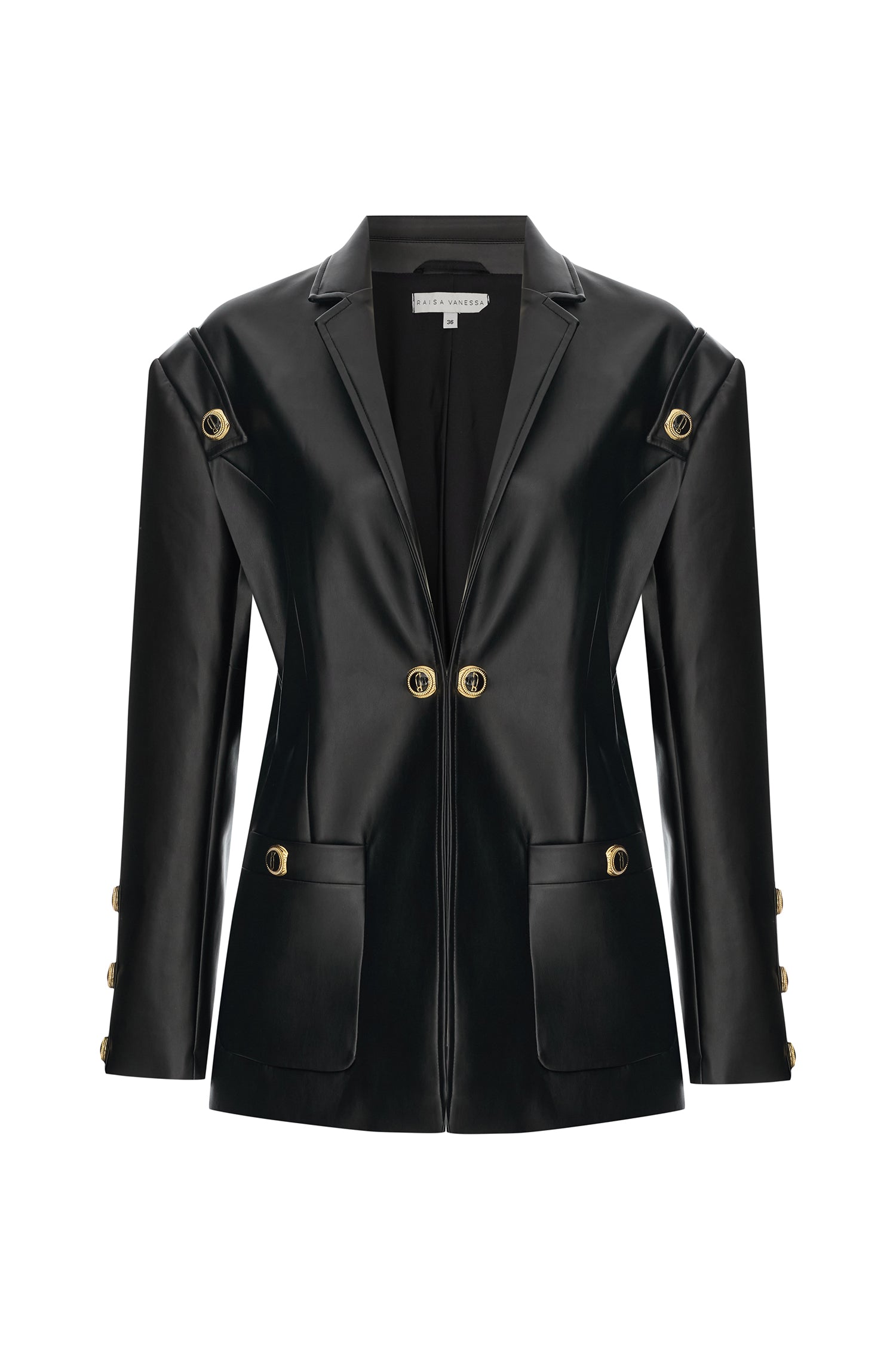 Black leather jacket commands attention with strong shoulders, precise tailoring, and gleaming RV-stamped buttons. The elongated silhouette and epaulette detailing evoke refined authority and contemporary elegance with an unapologetic attitude.