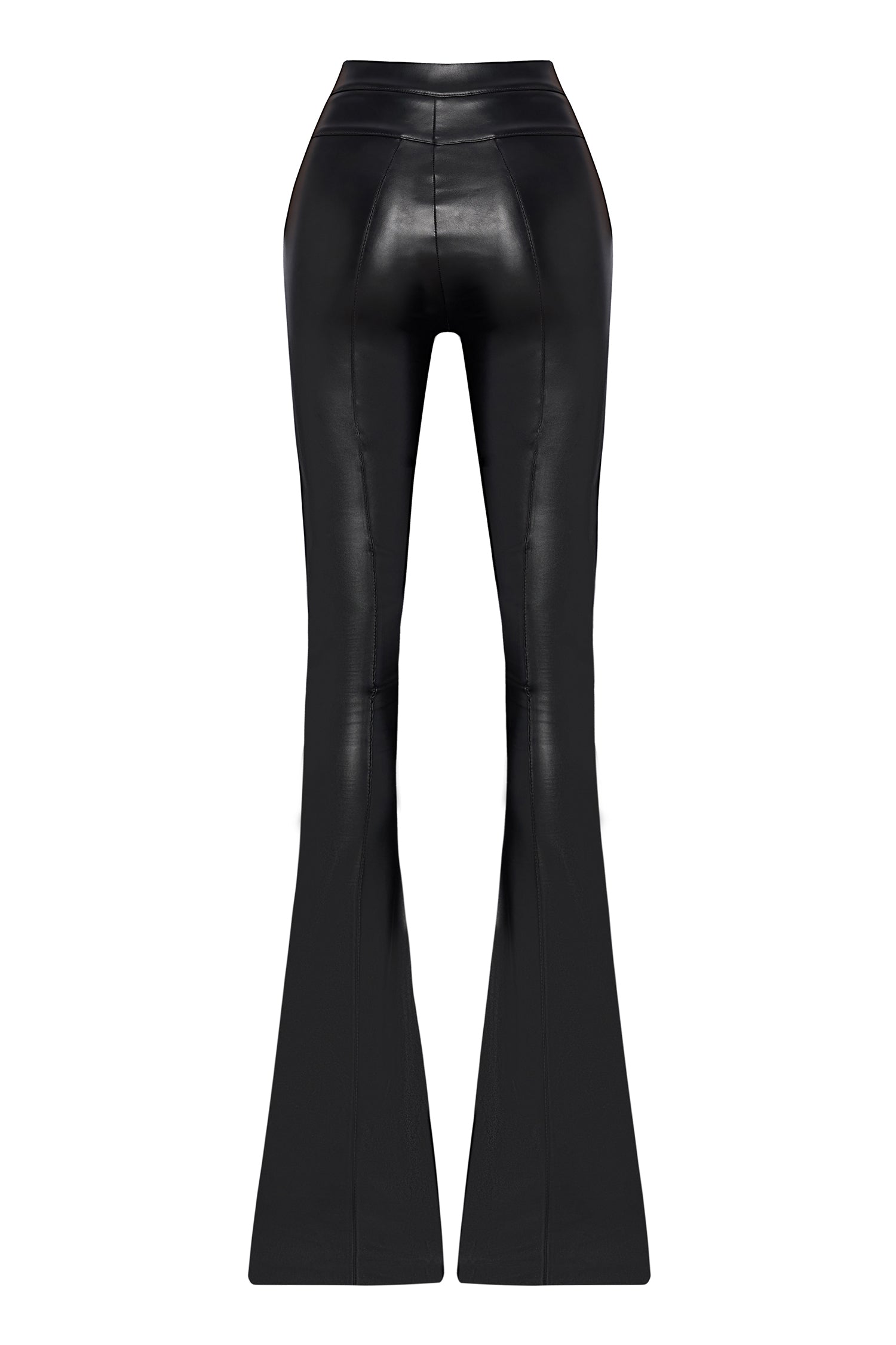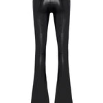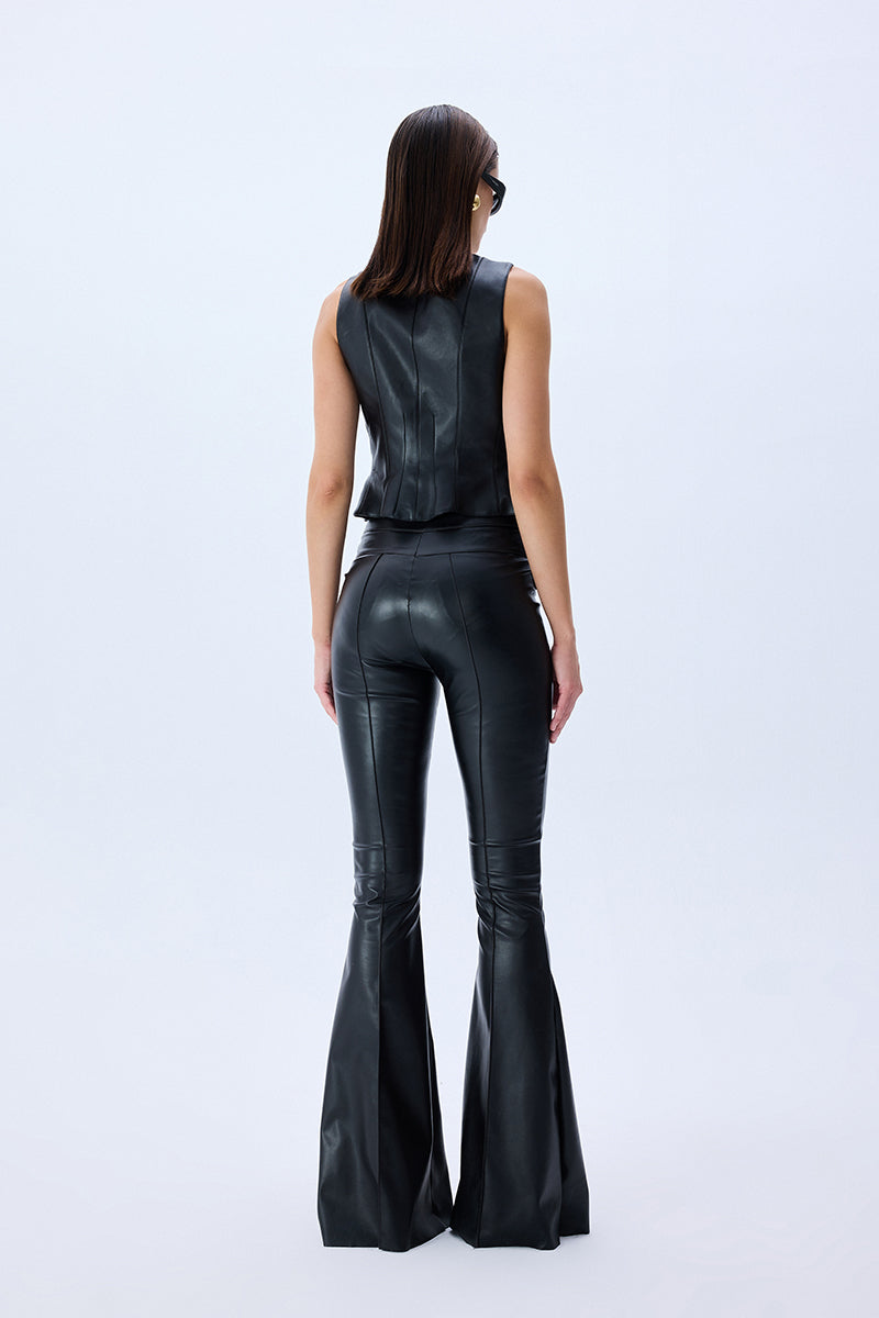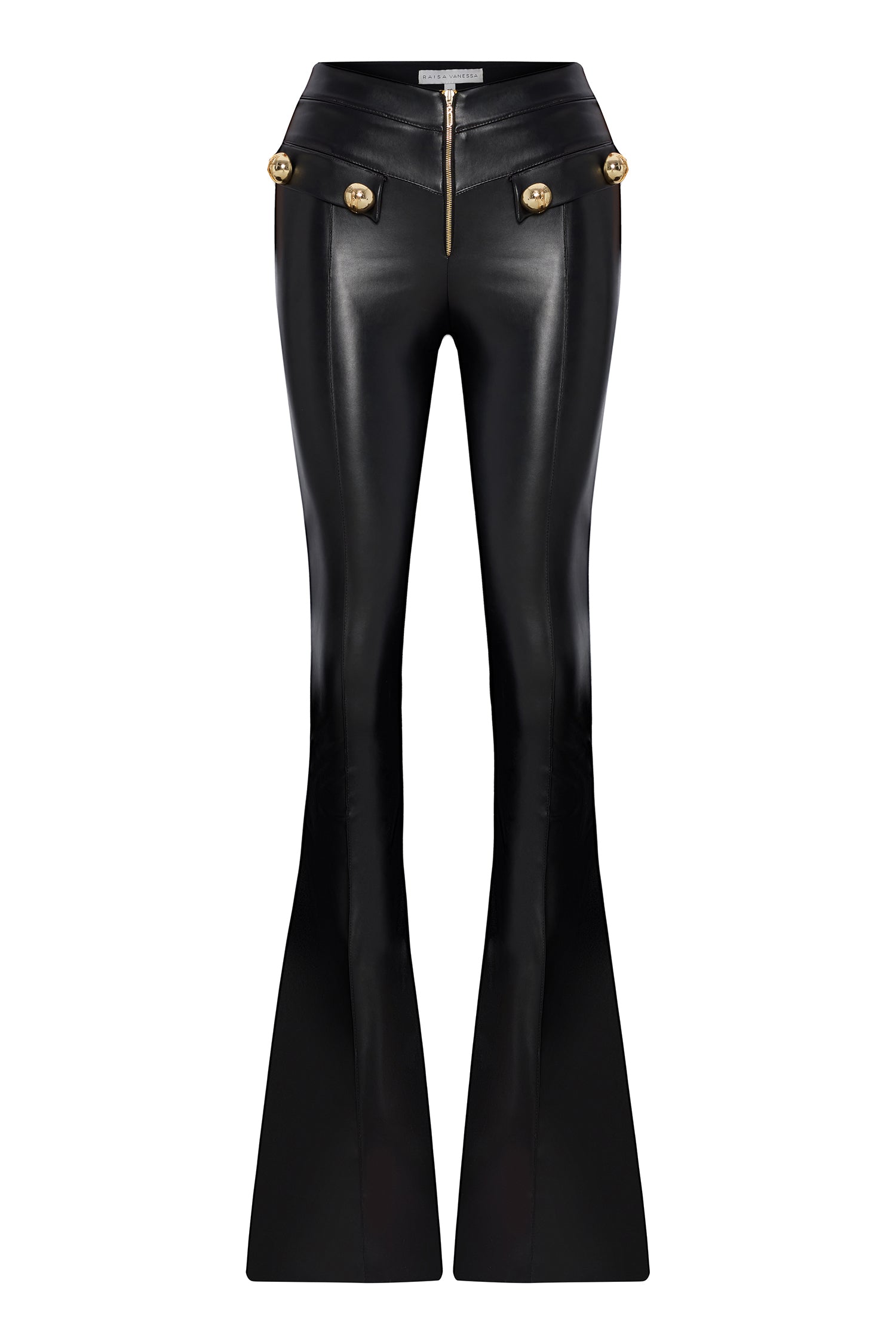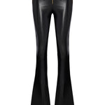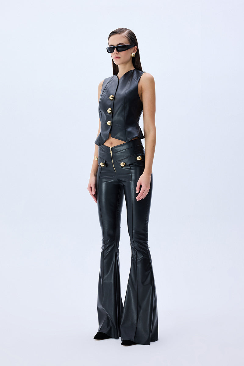 Black leather stretchy flare pants combine a sleek silhouette with high-impact detailing. Designed with a figure-hugging fit and flared leg, the style is finished with gold button accents that bring a touch of polished edge to this modern classic.