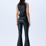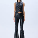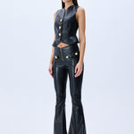Black Leather Stretchy Flare Pants With Gold Buttons