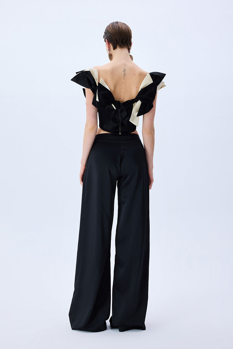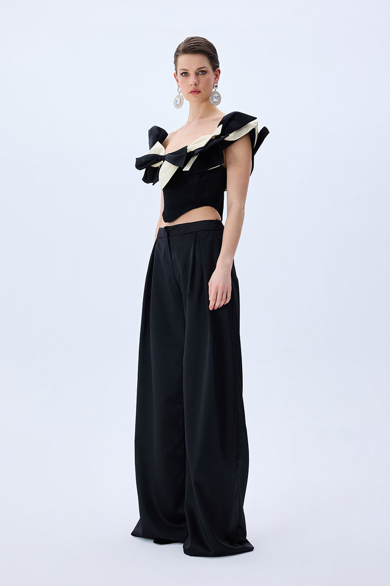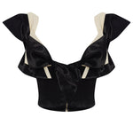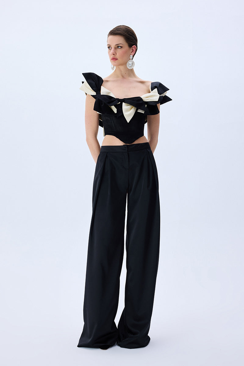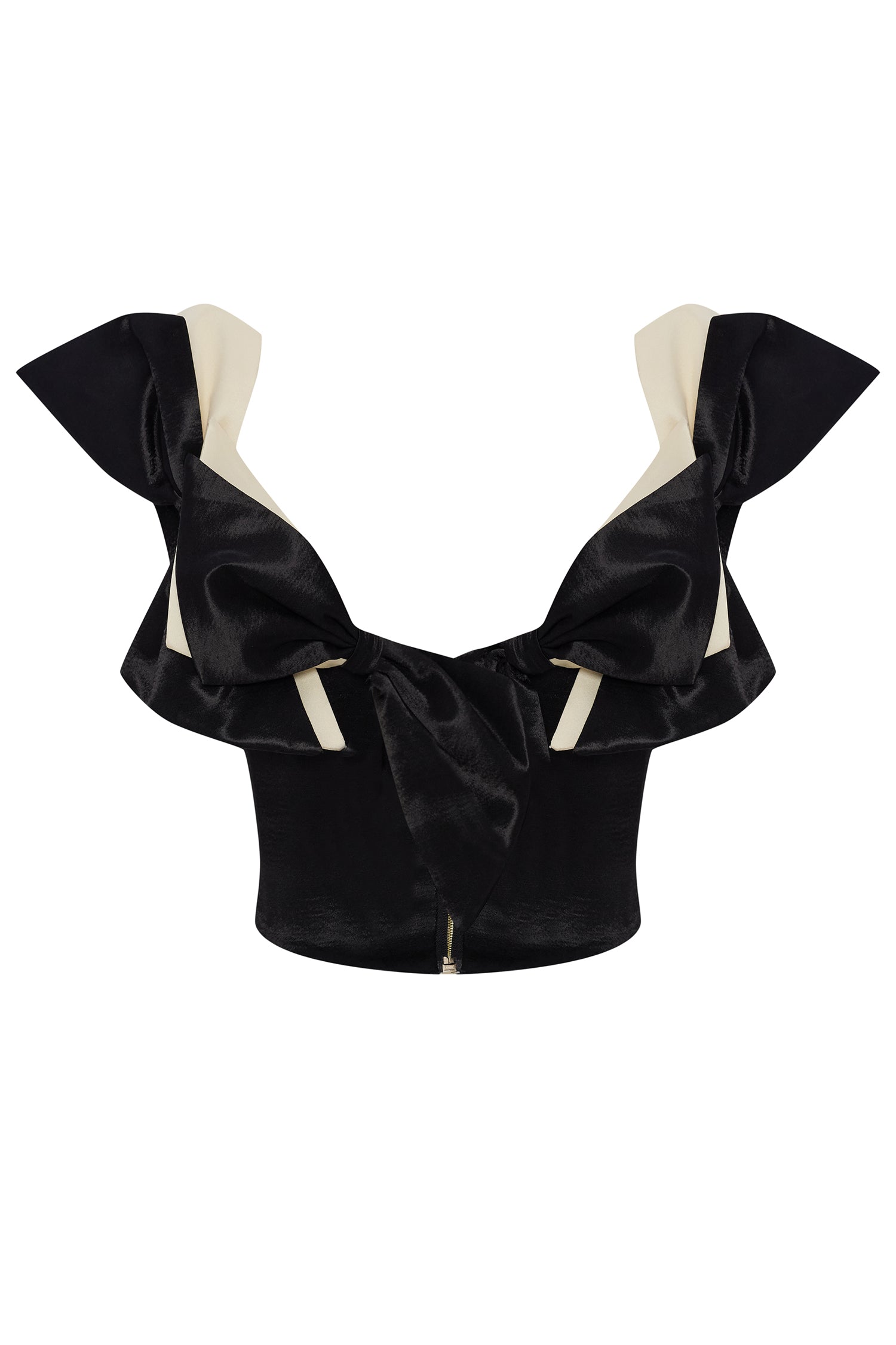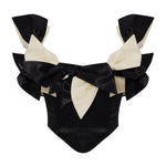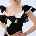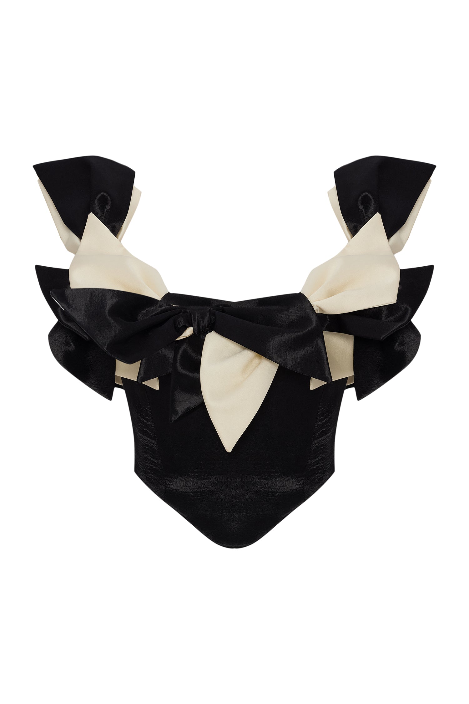 Elegance meets edge in a sculpted corset silhouette adorned with cascading black and ivory bows. The sweetheart neckline flatters the décolletage, while the structured bodice defines the waist. A statement piece that balances classic romance with contemporary allure.