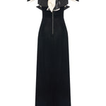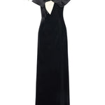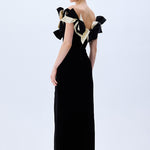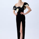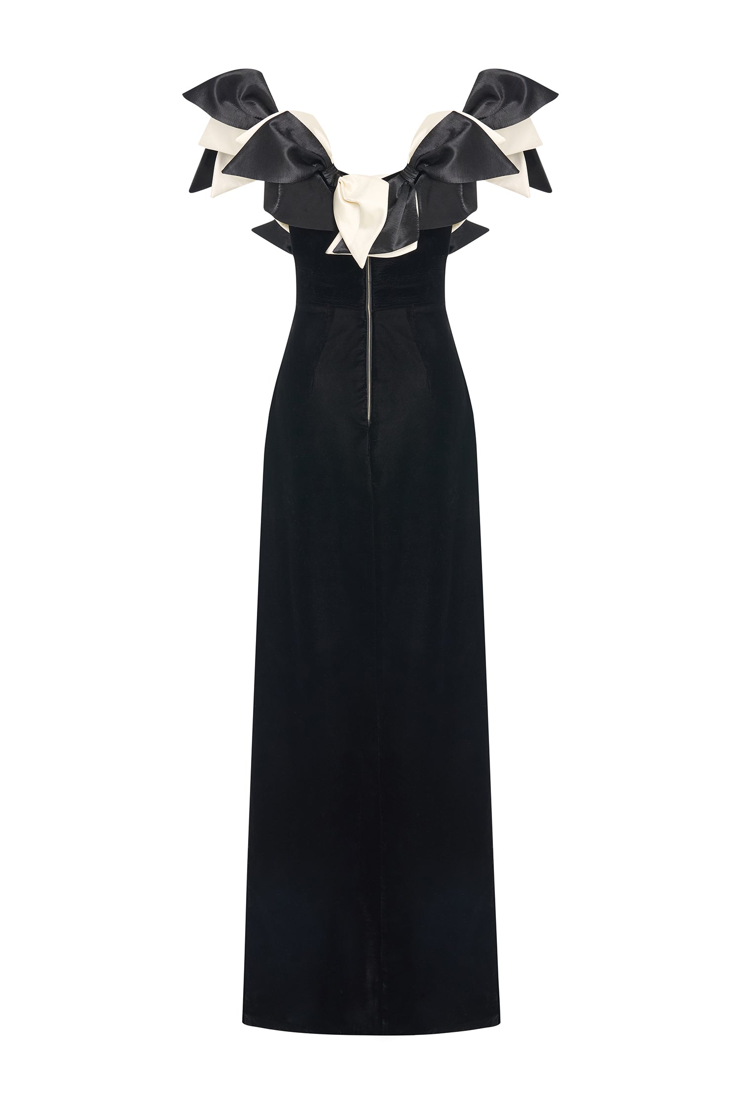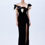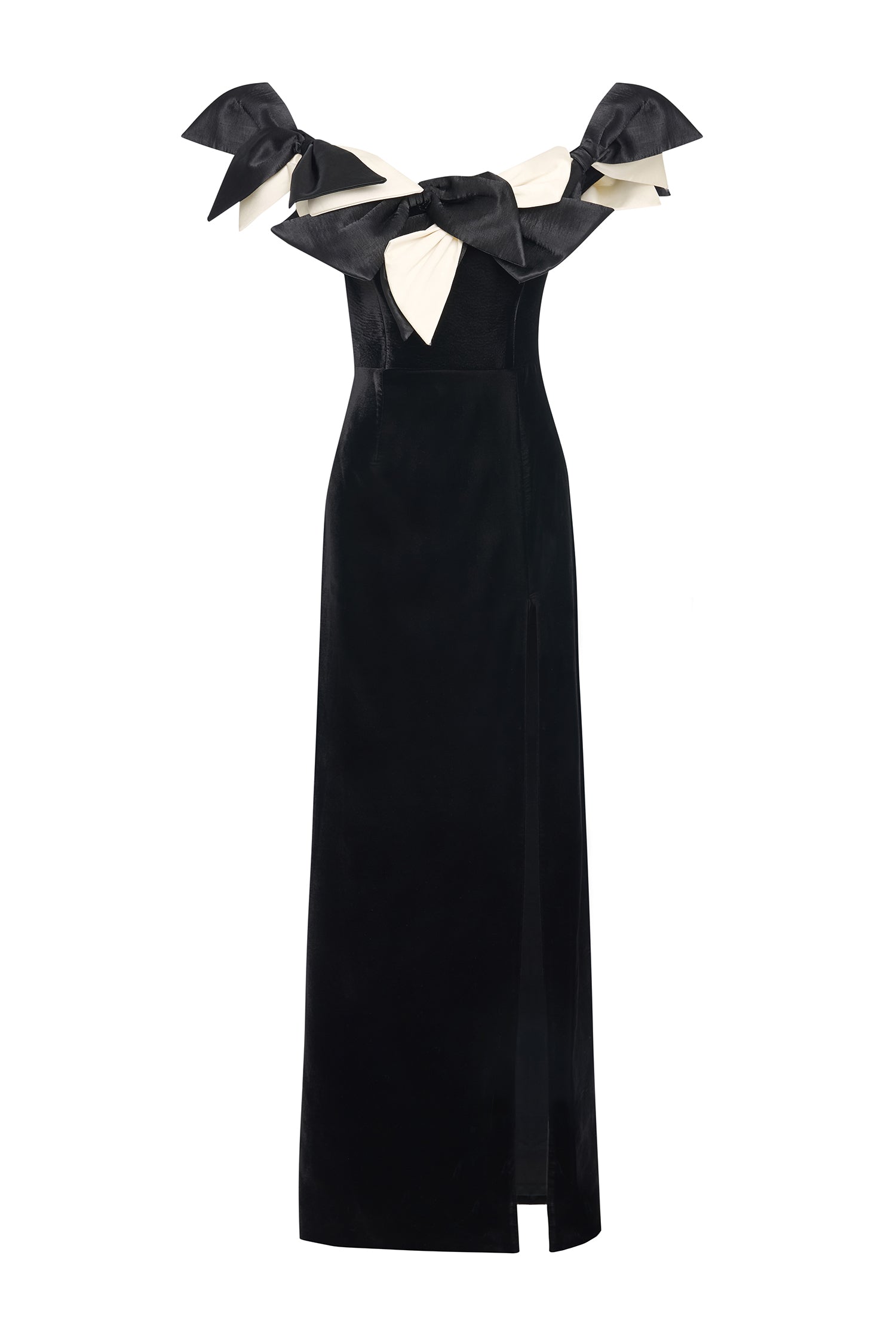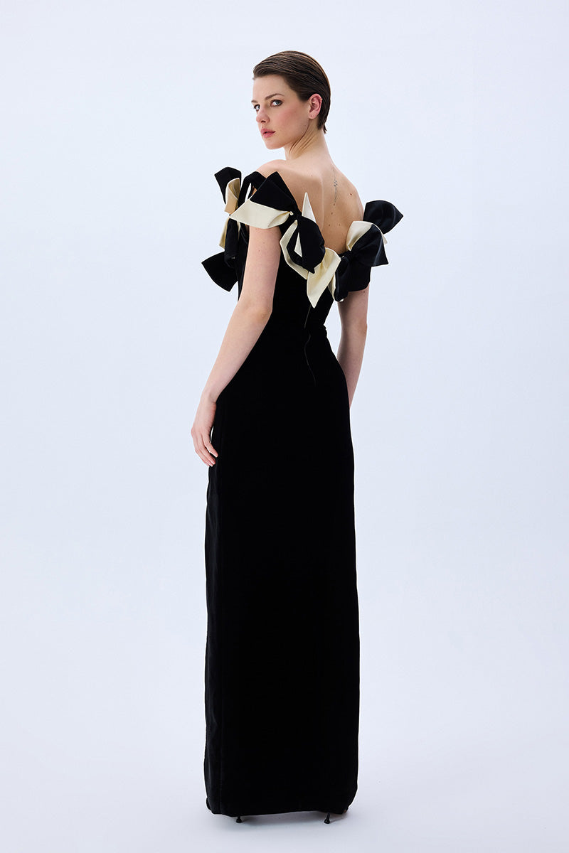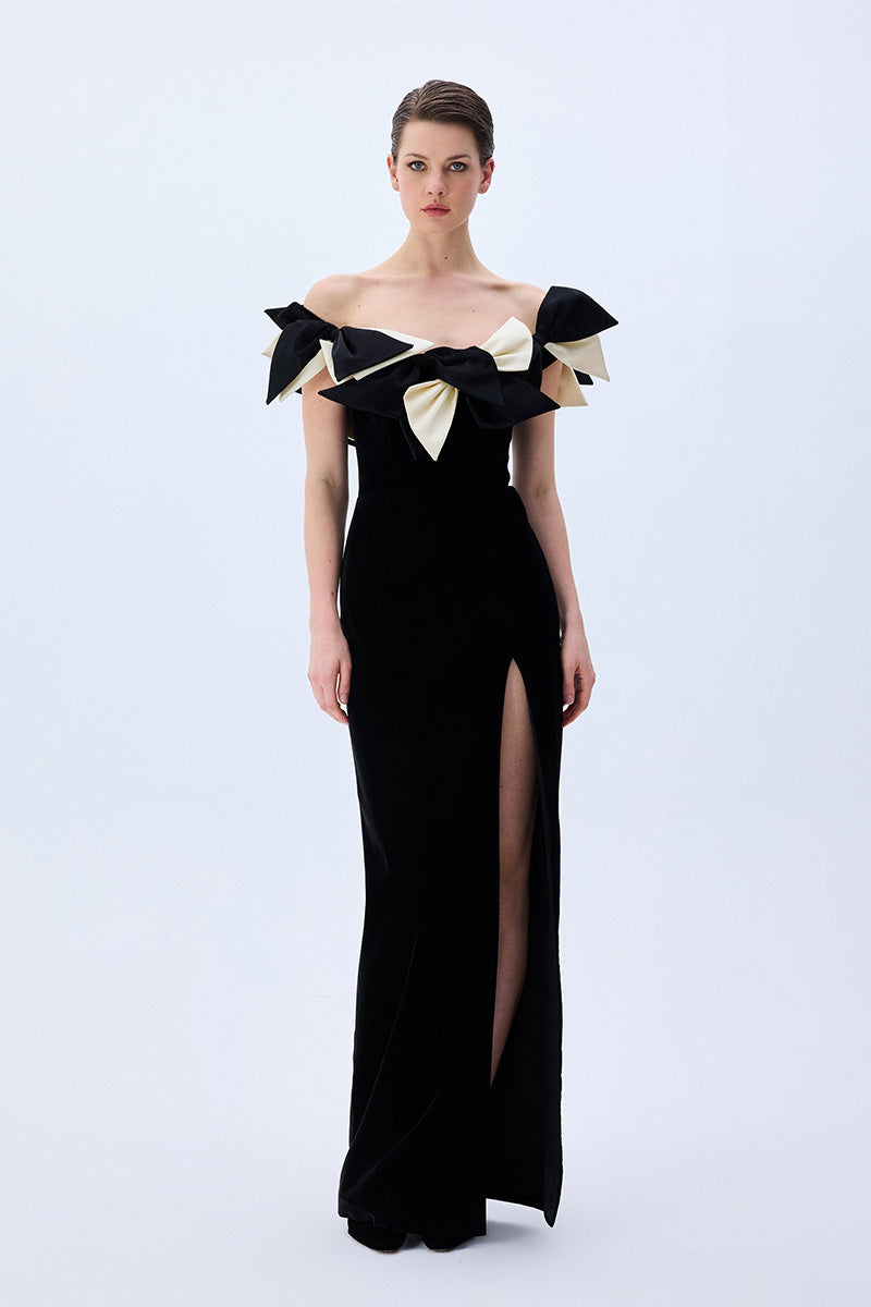 A romantic silhouette in fluid black satin, adorned with sculptural bows in contrasting ivory. The off-shoulder neckline frames the collarbone gracefully, while the thigh-high slit adds an alluring finish. A perfect harmony of playfulness and timeless sophistication.