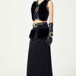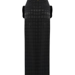 The Black Satin Maxi Skirt exudes elegance with its sleek satin fabric and striking gold buckle detail, making it a sophisticated choice for any formal occasion.