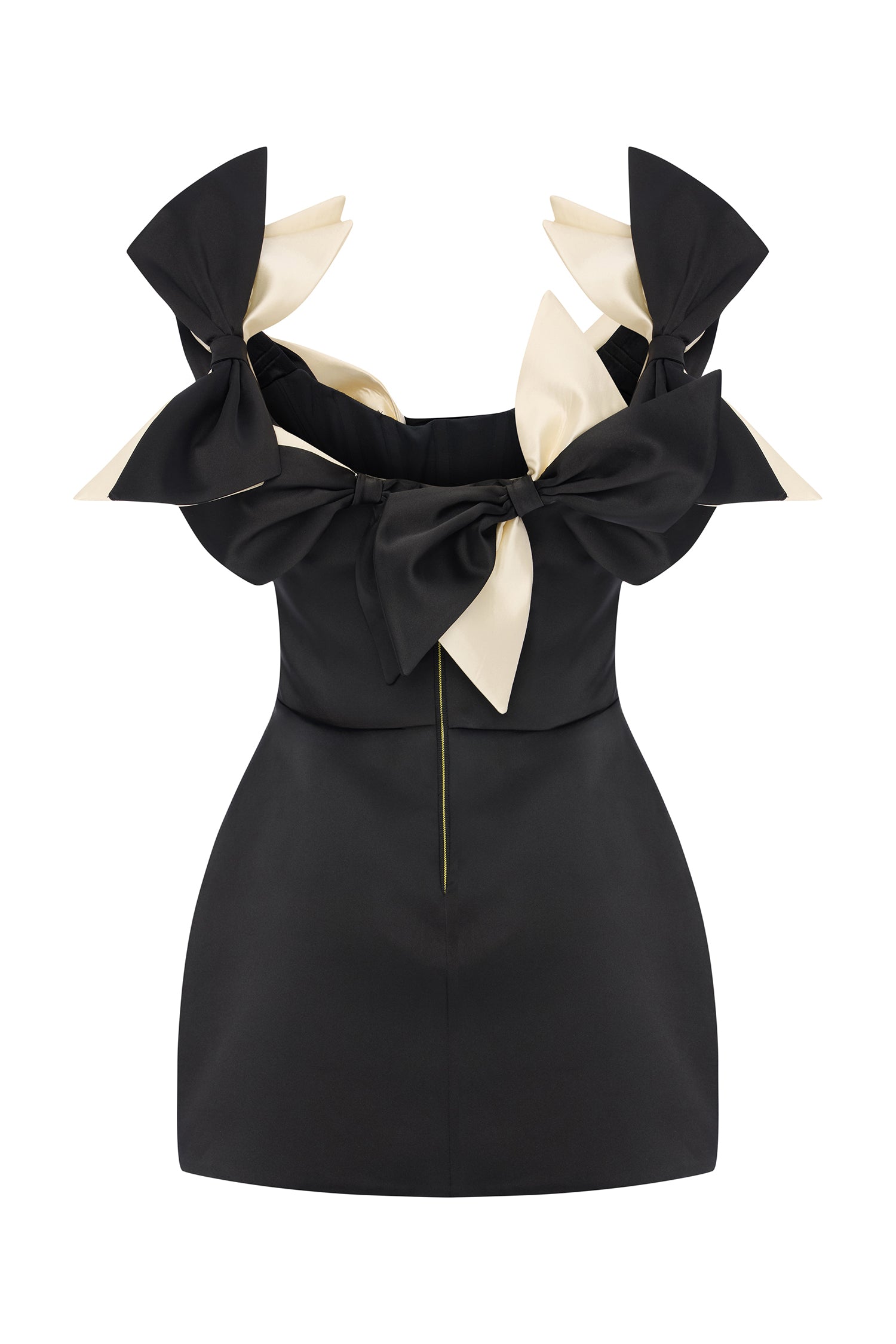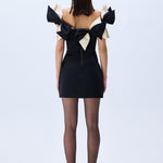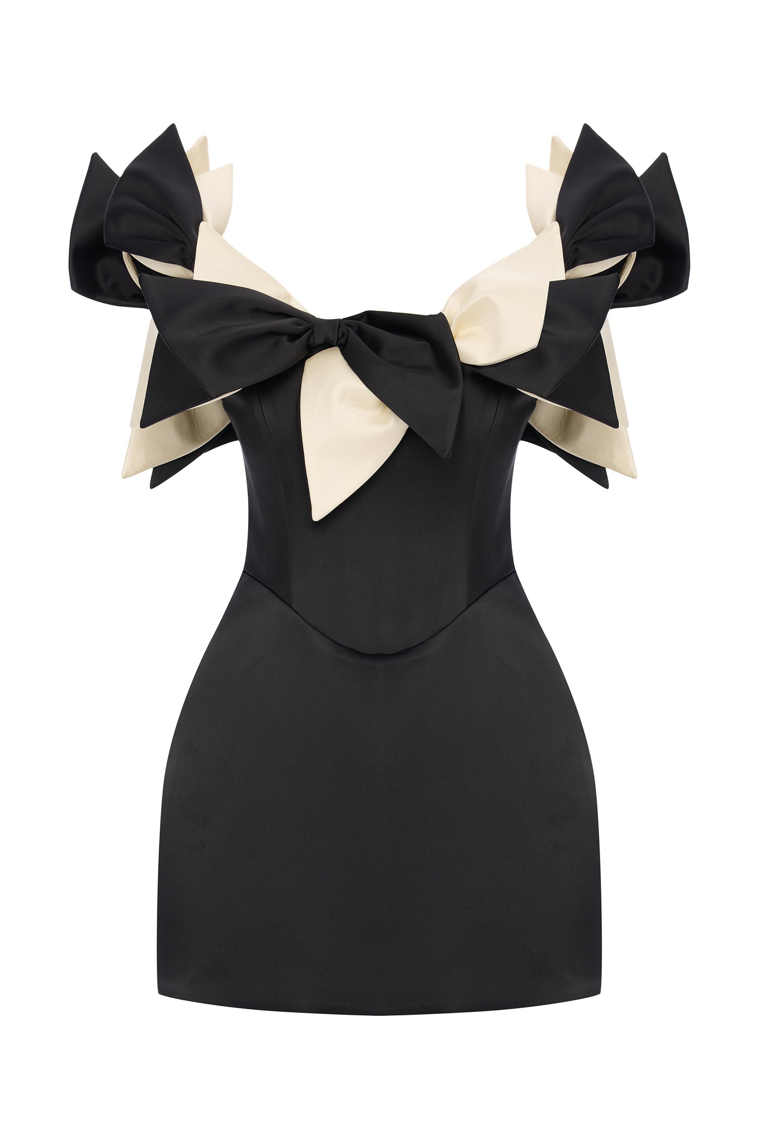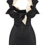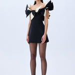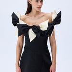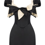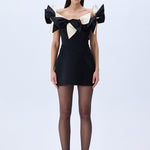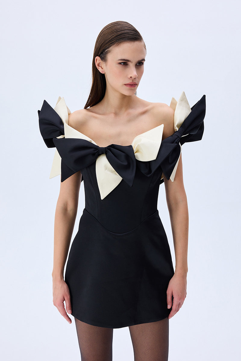 A playful yet refined silhouette, crafted from structured black satin and crowned with oversized ivory and black bows. The off-shoulder neckline adds a romantic charm, while the mini length offers a bold, modern attitude. A standout piece for unforgettable evenings.
