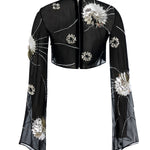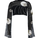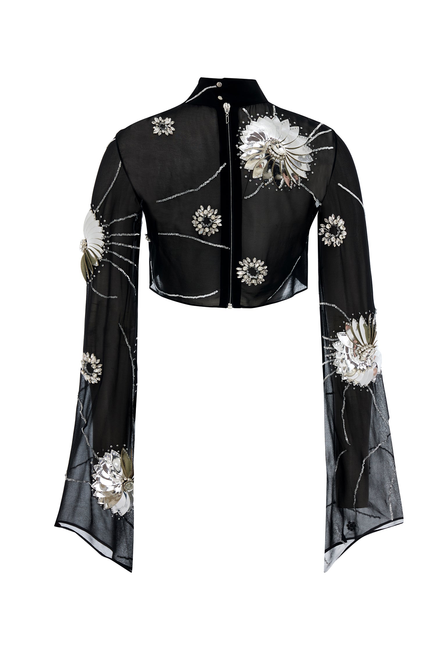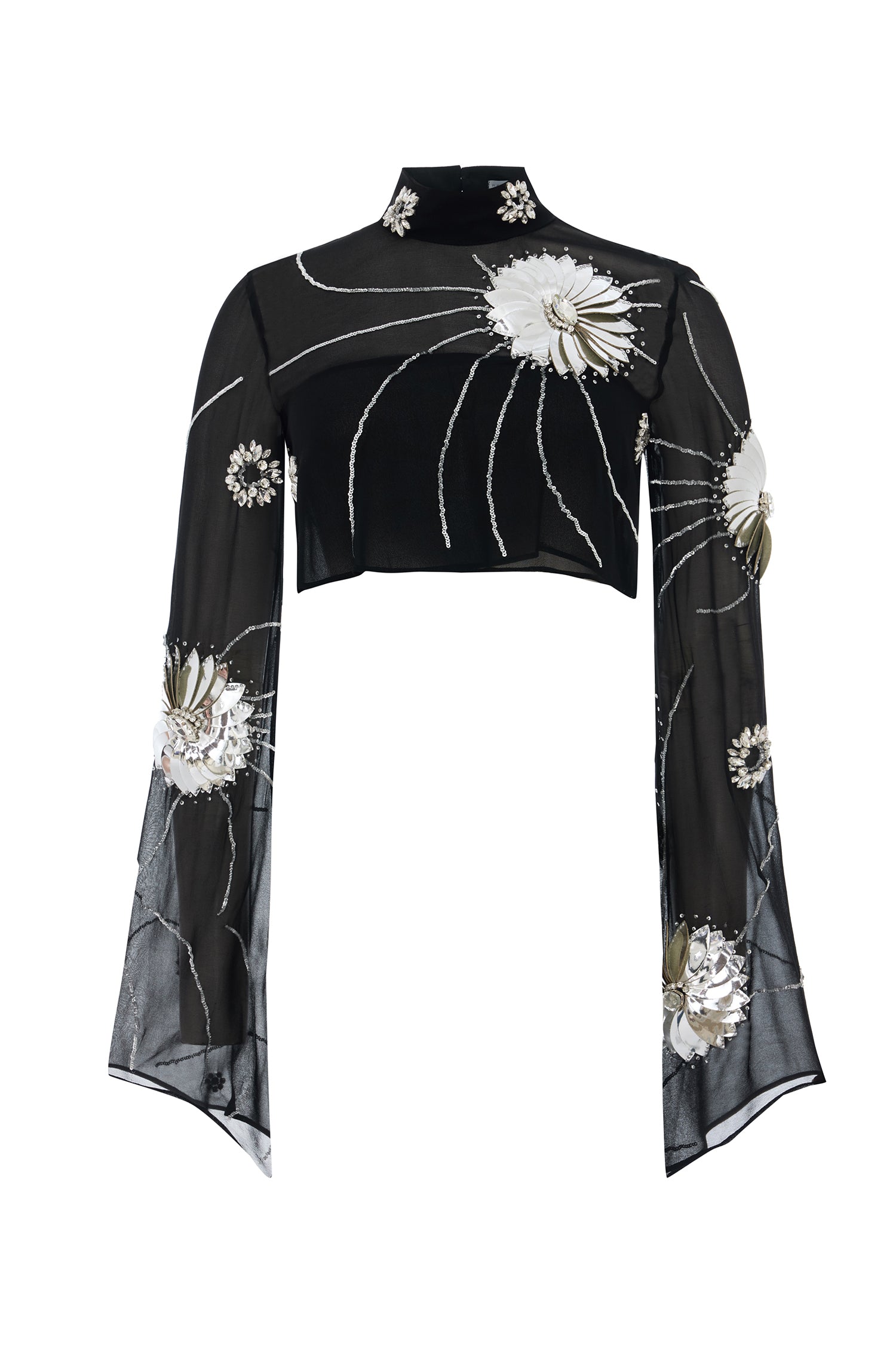 Crafted from sheer black chiffon, this sculptural crop top features shimmering sequin embroidery and bold patent flower appliqués. Flared sleeves add a dramatic flow to each movement, while the high neck silhouette enhances its refined elegance.