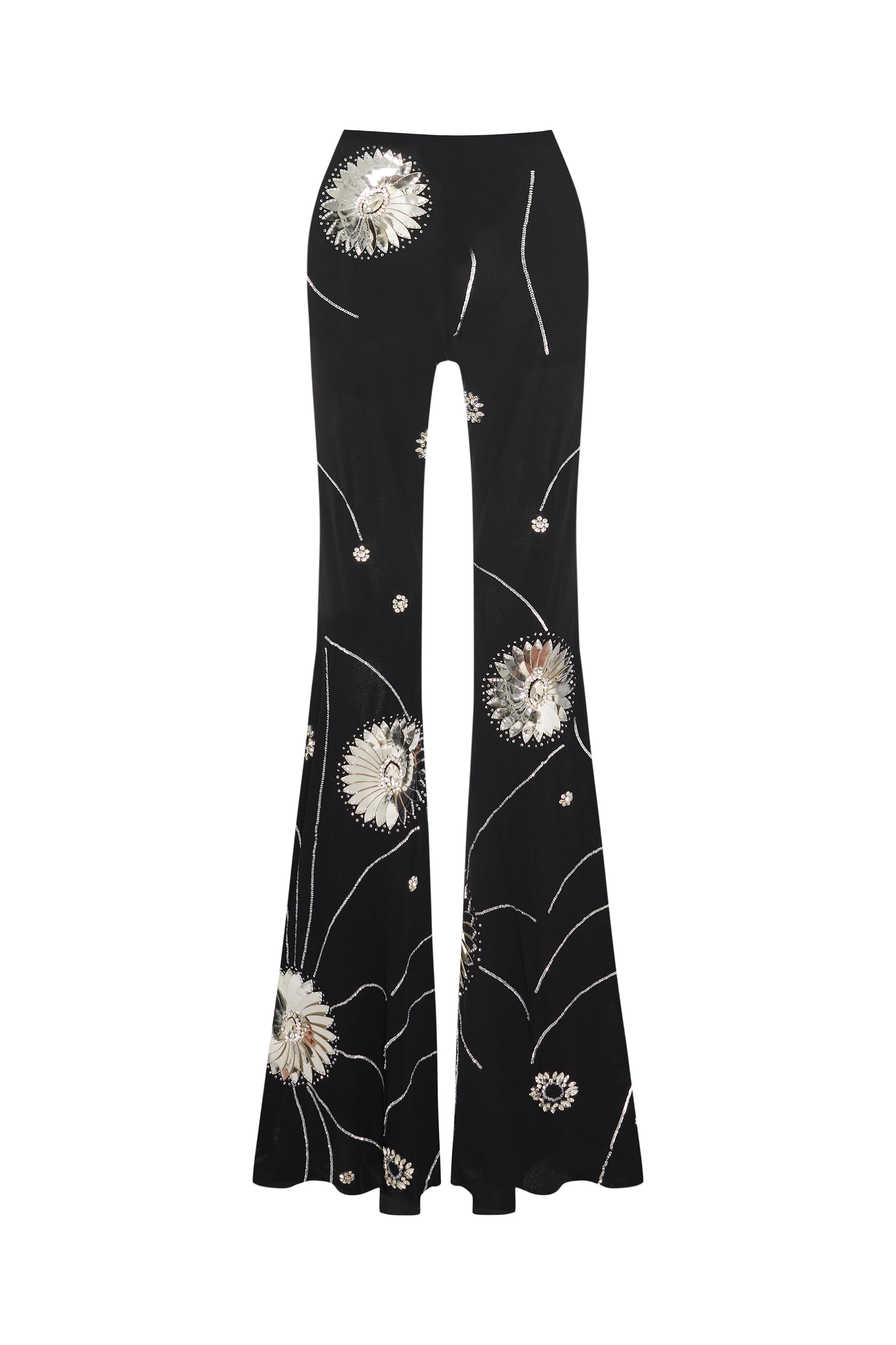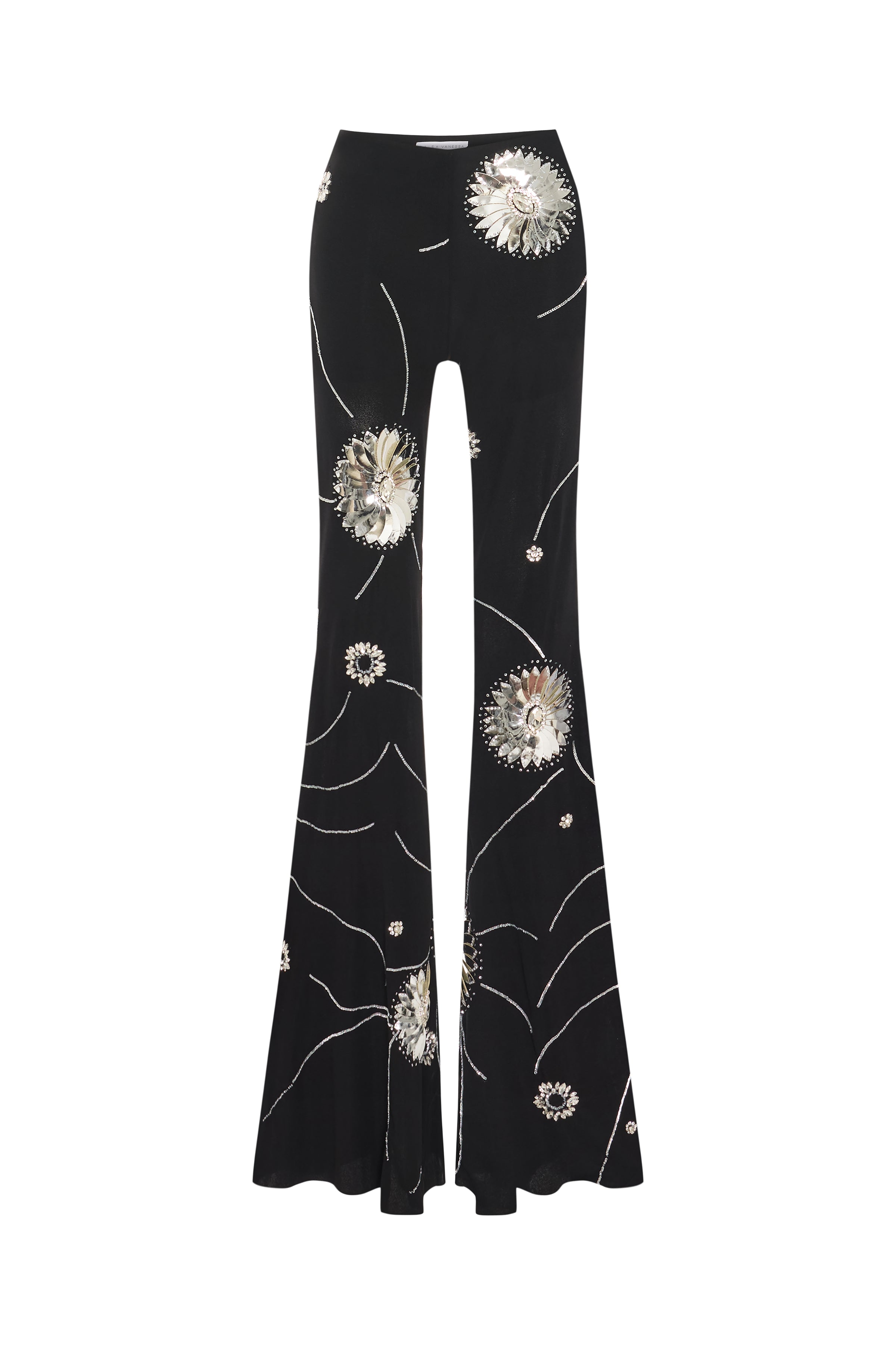 Black sequined jersey flare pants feature an elongated silhouette adorned with graphic patent flower appliqués and delicate sequin embroidery. The fluid flare and high-waisted fit evoke retro glamour with a contemporary, artful twist.