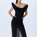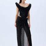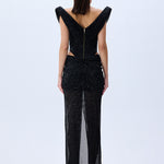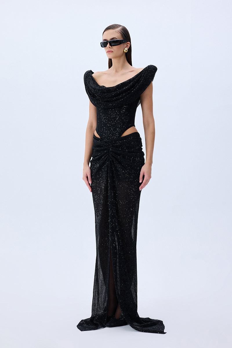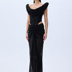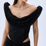 Black Sequined Tulle Cowl Neckline Corseted Sculptural Dress