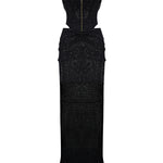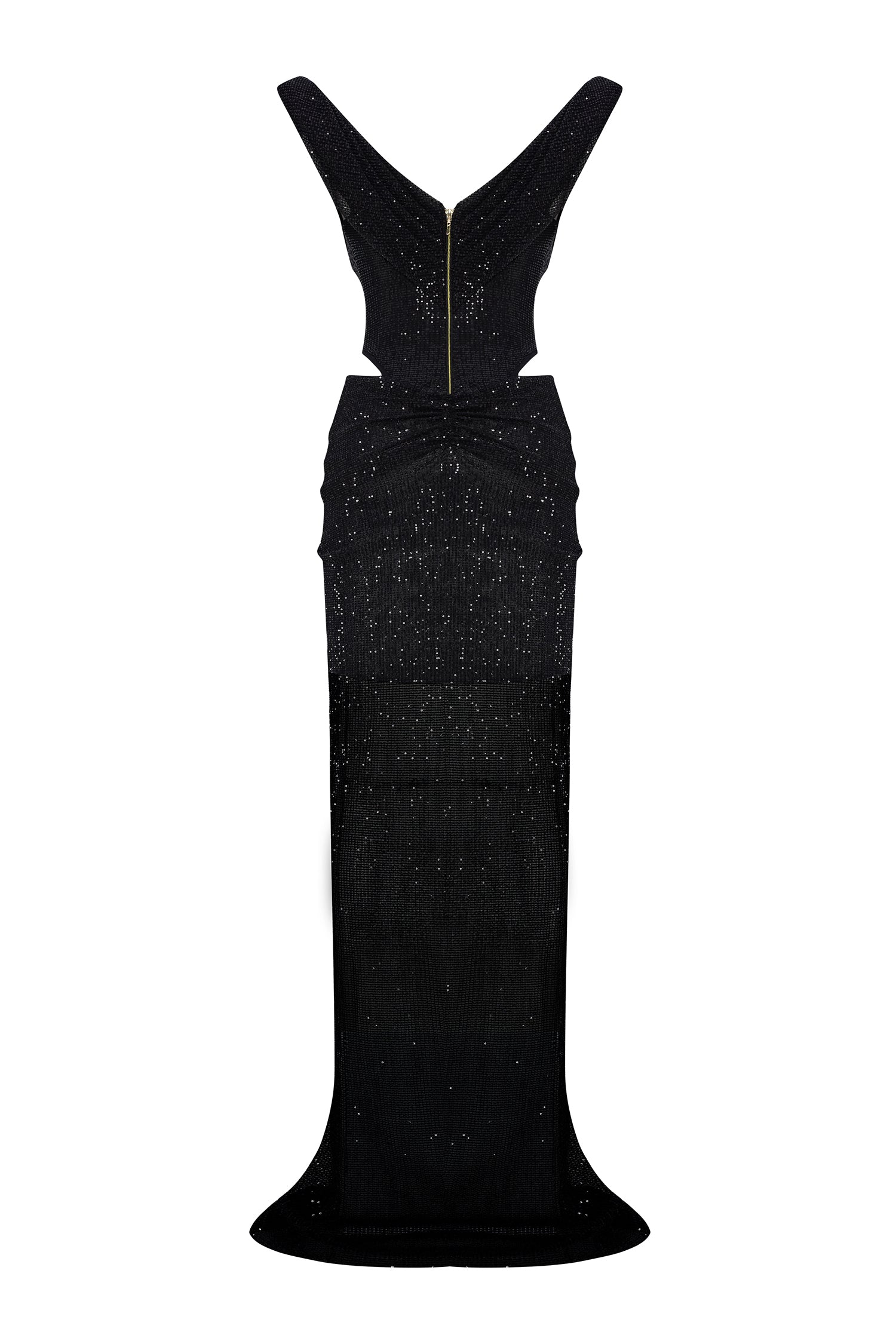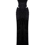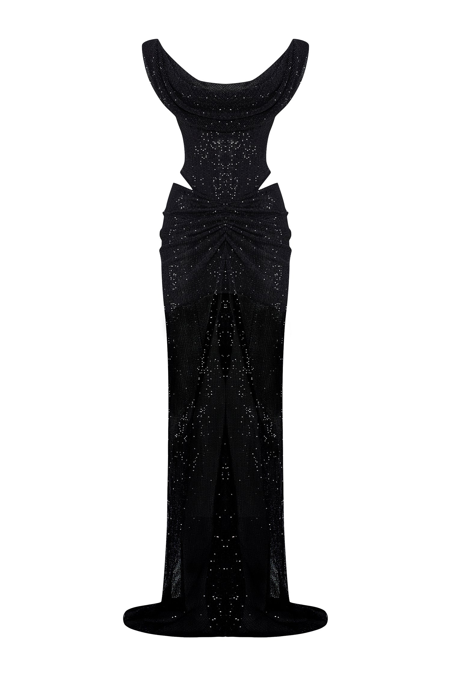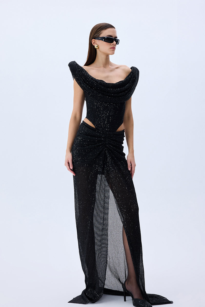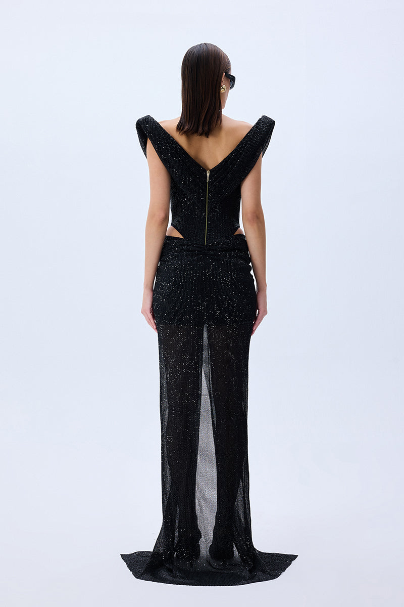 A masterstroke of seduction and structure. This cowl-neck gown, sculpted from glistening sequined tulle, unveils bold cutouts and a corseted silhouette that celebrates strength in elegance. Effortlessly commanding.