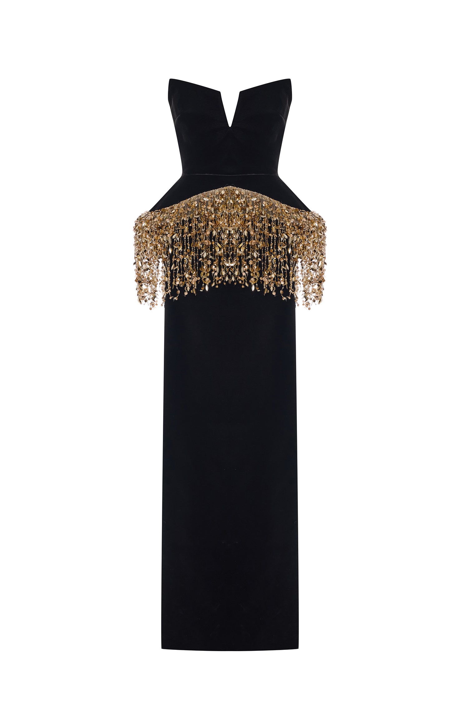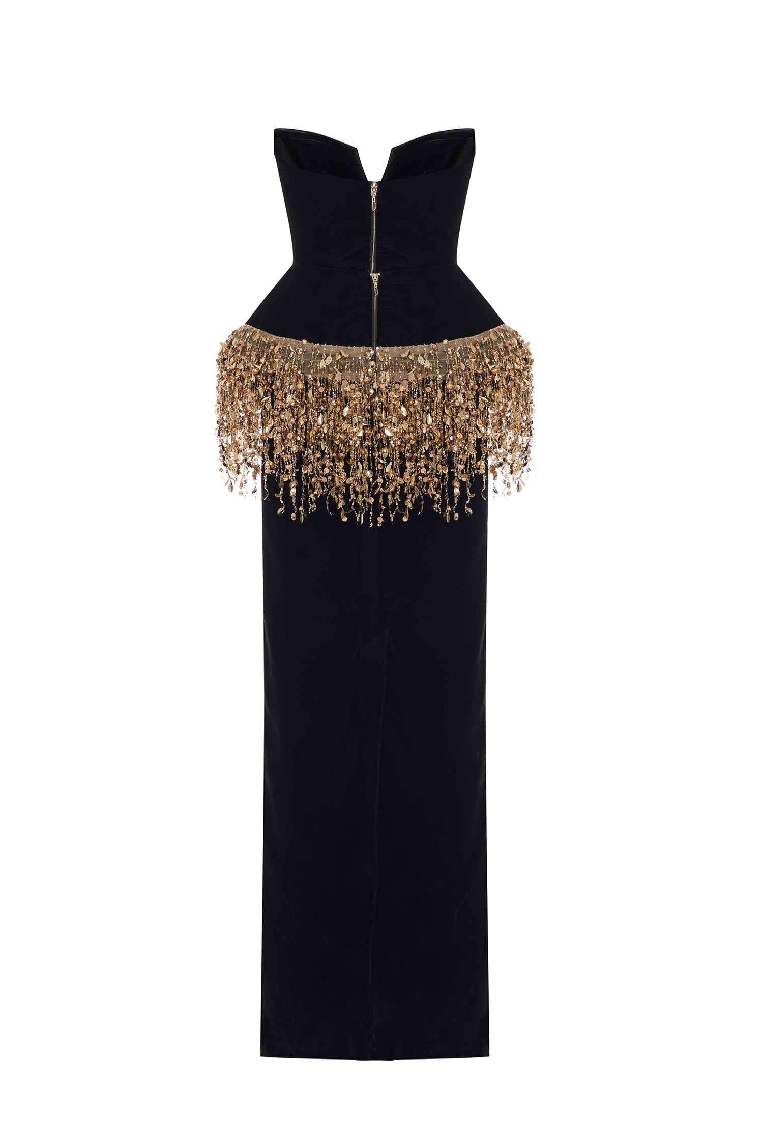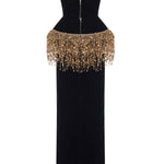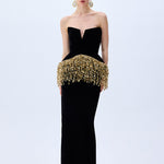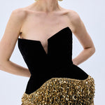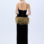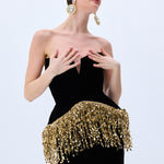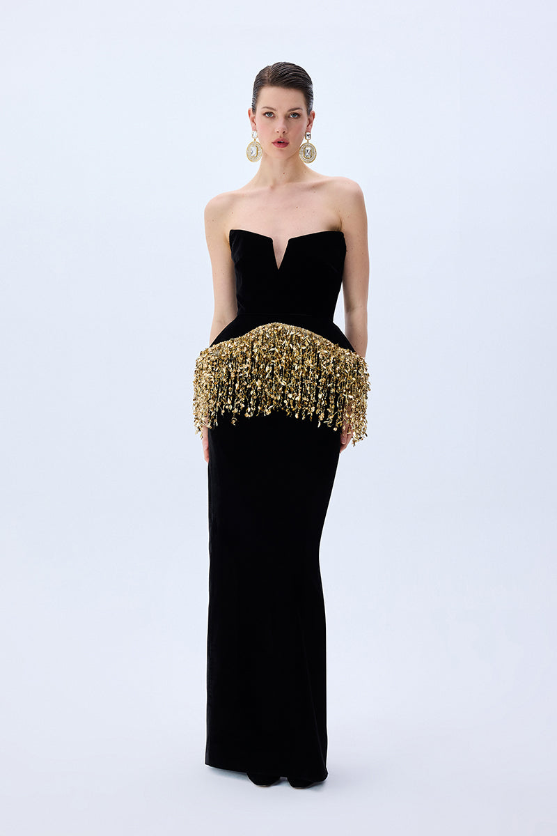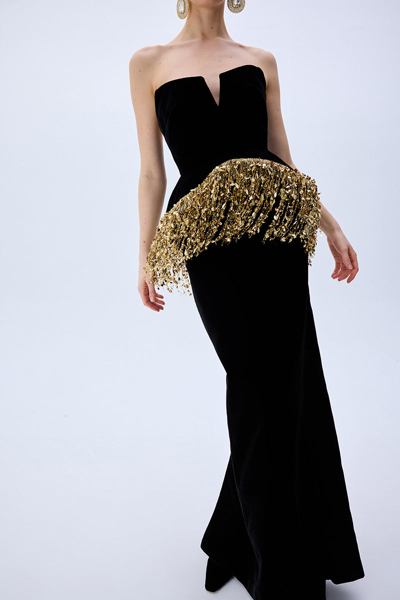 A striking interplay of structure and sparkle, this strapless black velvet gown is cinched with a sculpted corset and crowned with cascading gold paillette fringes. Regal, modern, and undeniably bold.