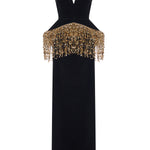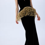 Black Silk Velvet Corseted Gown With Gold Pailette Fringes