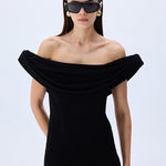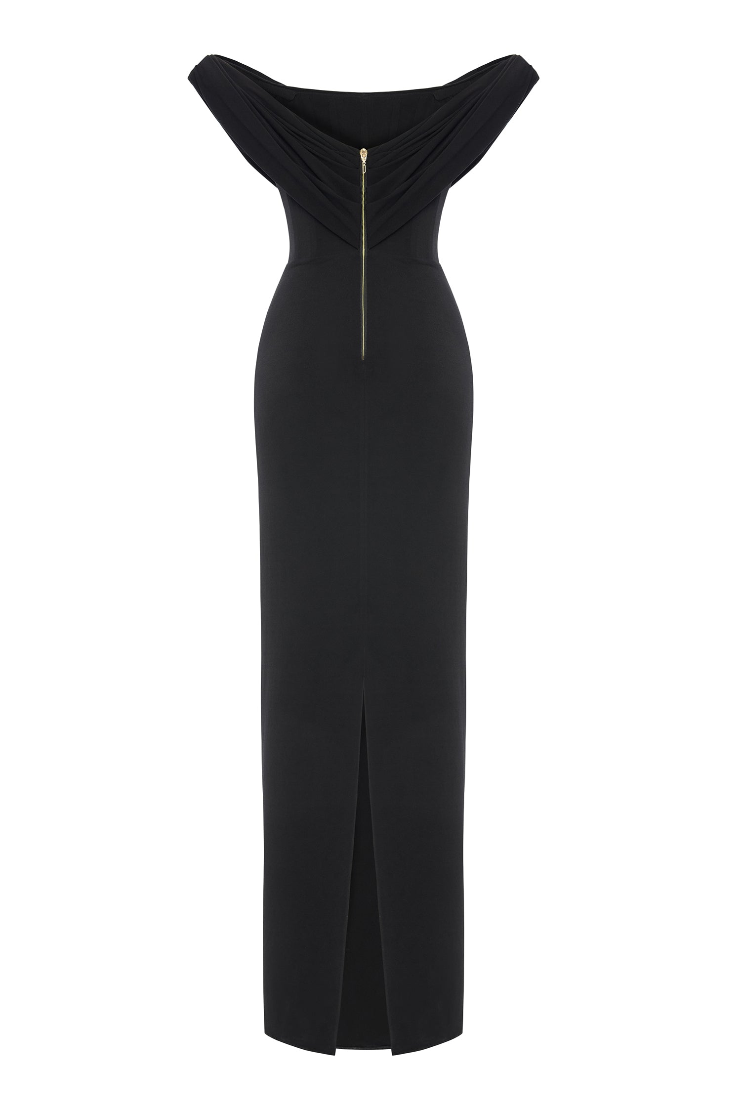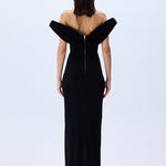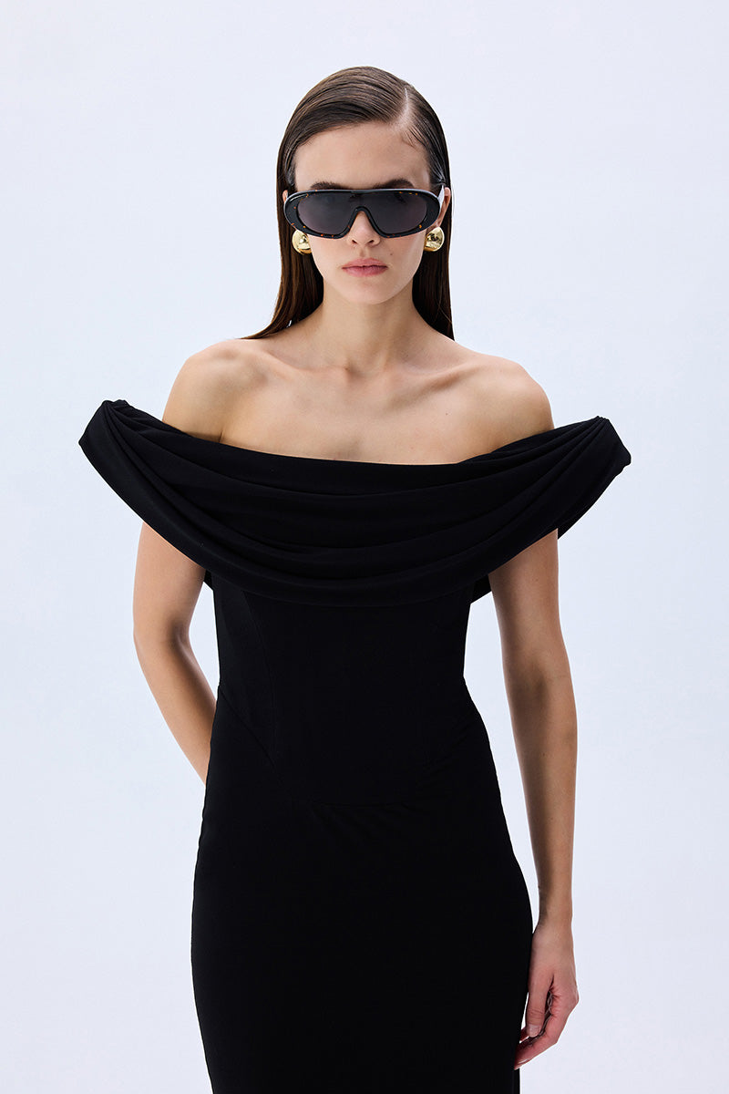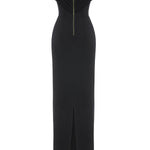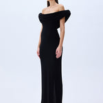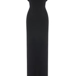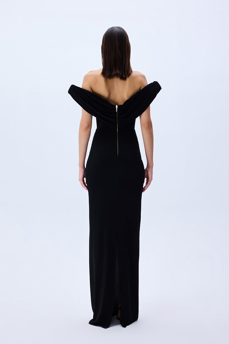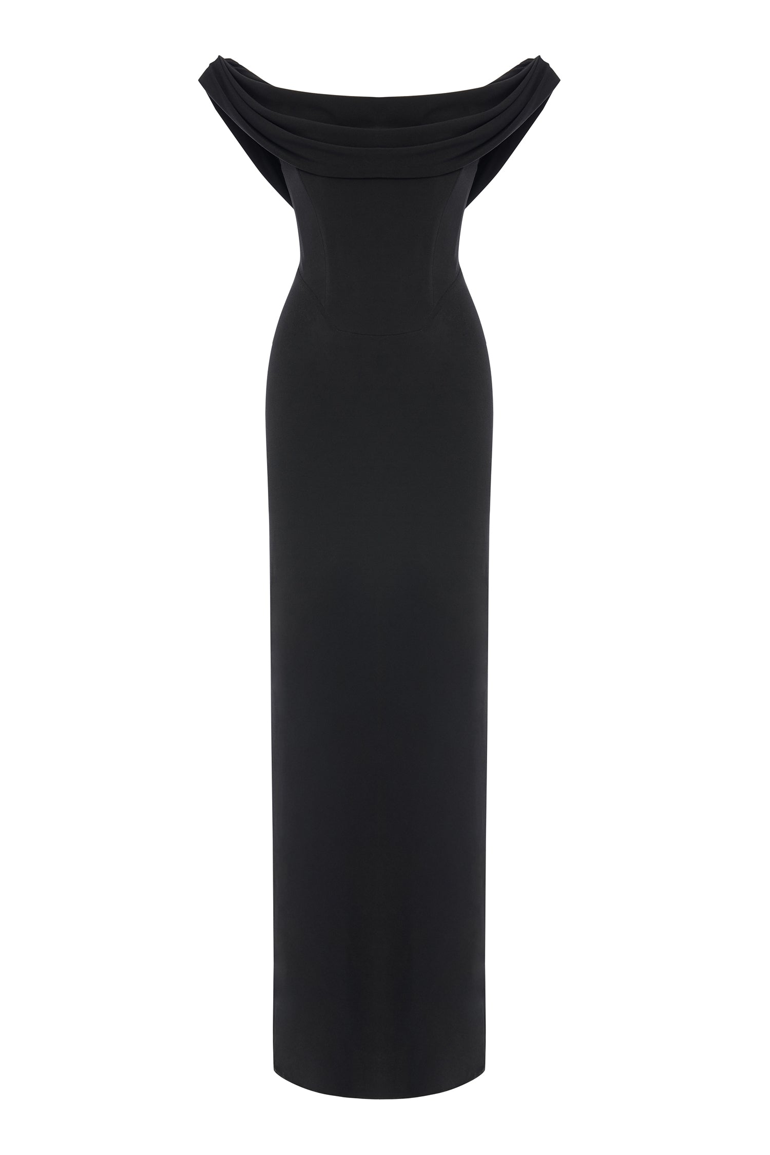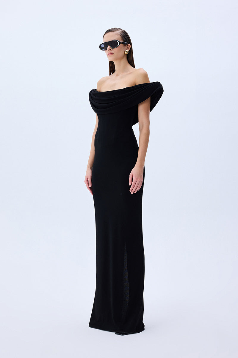 Elegance meets ease in this sculptural column of black stretch jersey. The softly draped cowl neckline floats off the shoulders, framing the décolletage with effortless allure. A corseted interior offers structure beneath the fluidity.