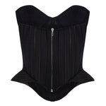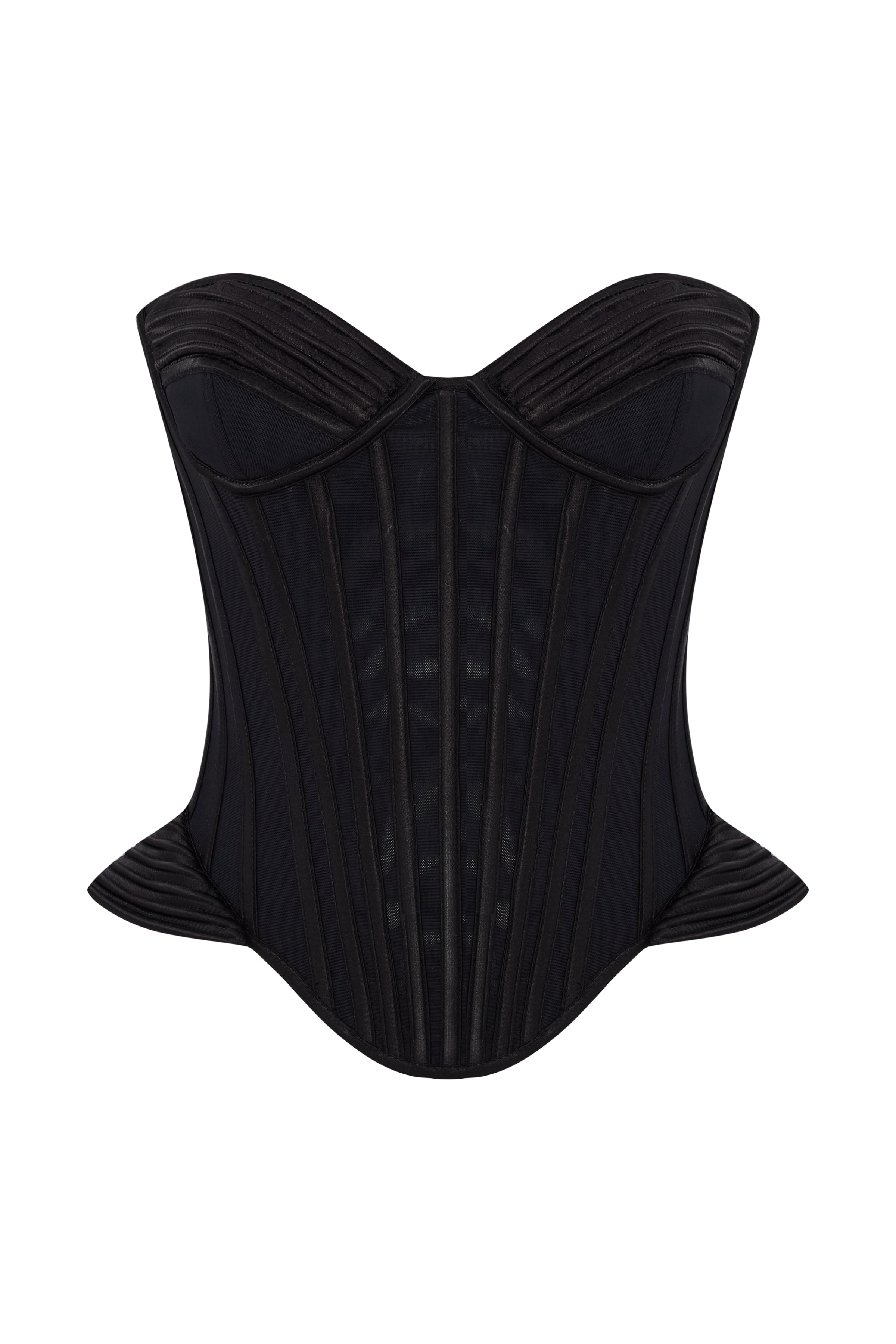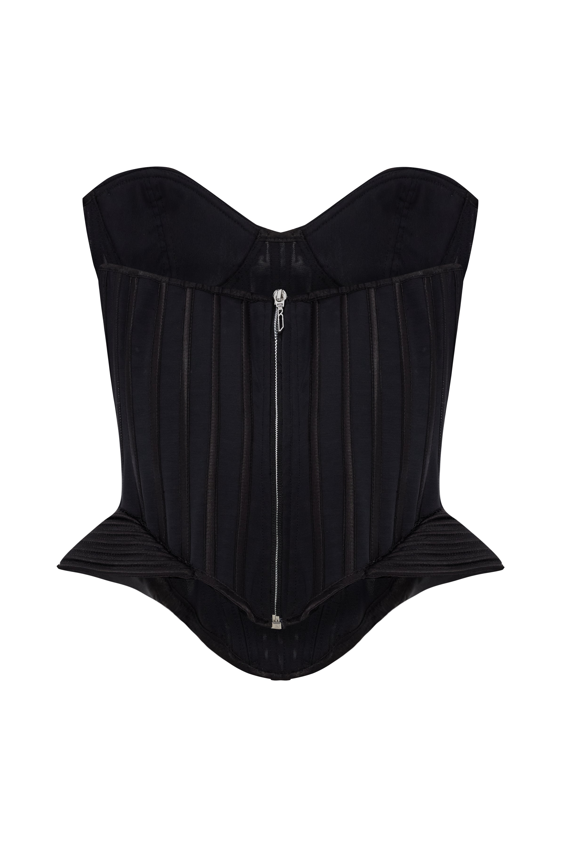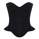Crafted in lustrous black satin, the corset draws the eye with its sculptural lines and defined silhouette. Boning details enhance the waist, while the curved edges and molded cups evoke a sense of bold femininity and timeless elegance.