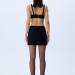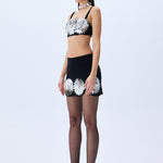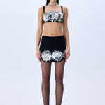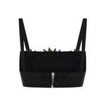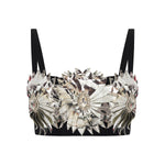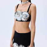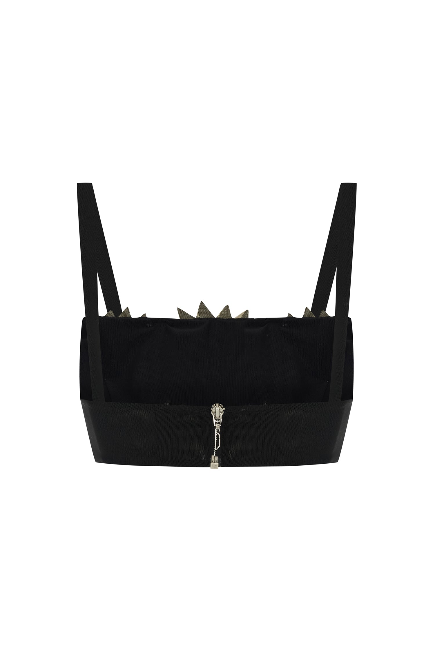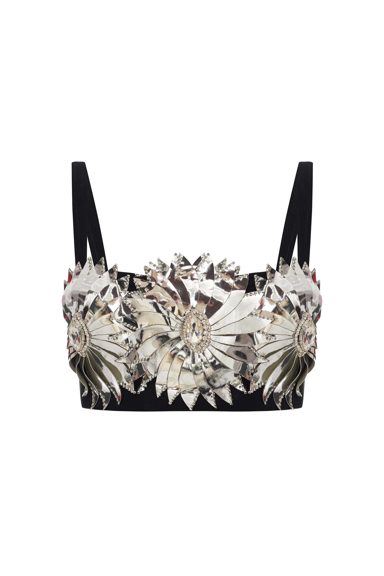 A striking black tulle bralette adorned with dimensional patent flowers in metallic tones. The sculptural embellishments create a bold contrast against the sheer base, offering a distinctive yet refined silhouette.