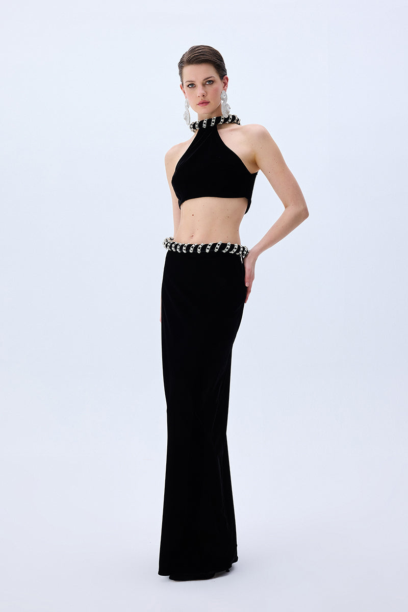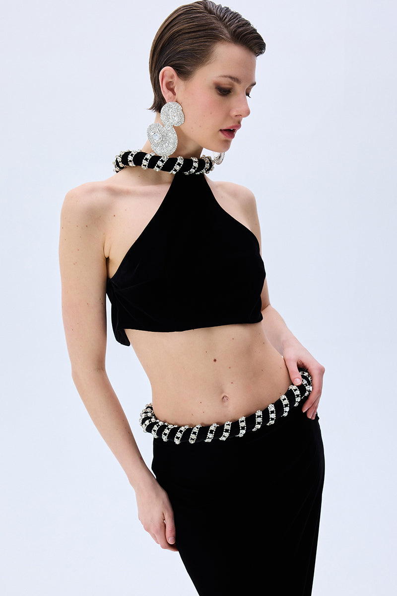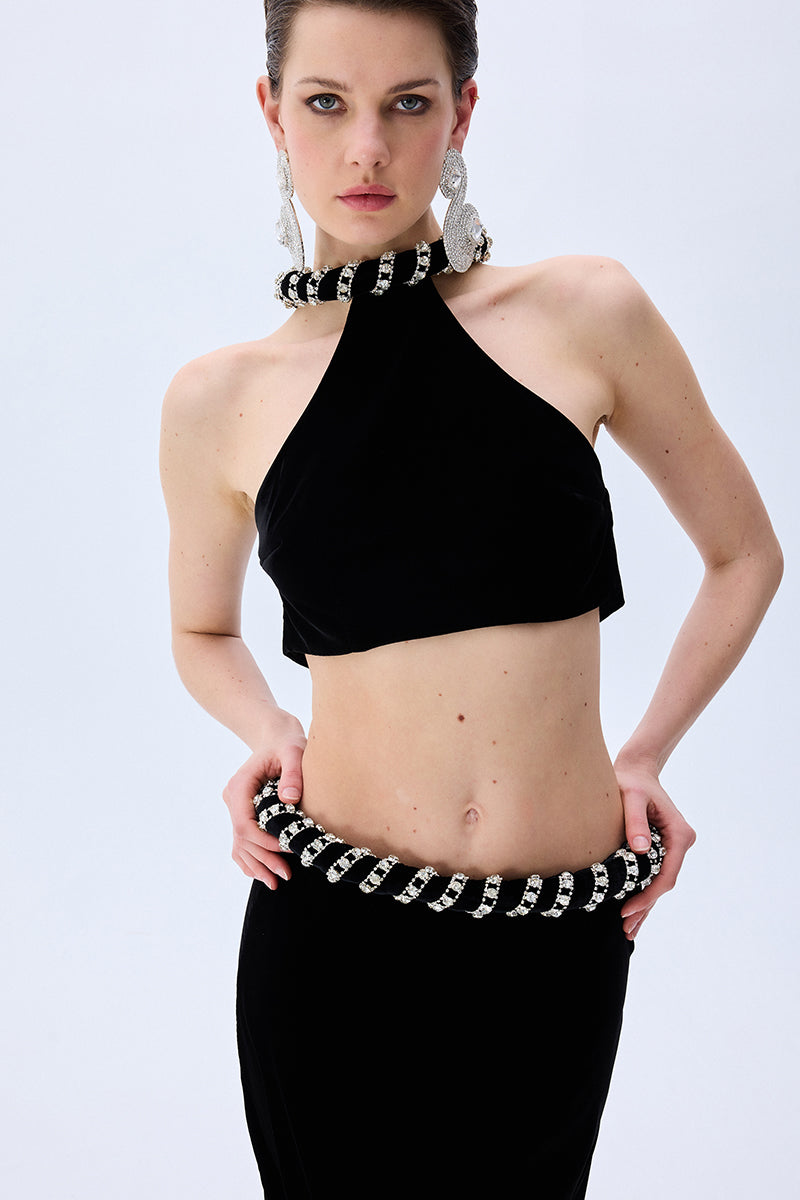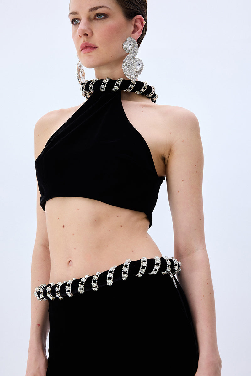 Crafted from rich velvet, the crop top features a halter silhouette elevated by a crystal rope neckline. Its open back and precise tailoring accentuate the figure, offering a refined yet daring elegance. Perfect for pairing with its coordinating skirt or styled separately for statement looks.