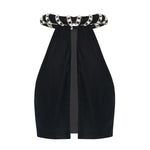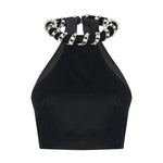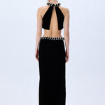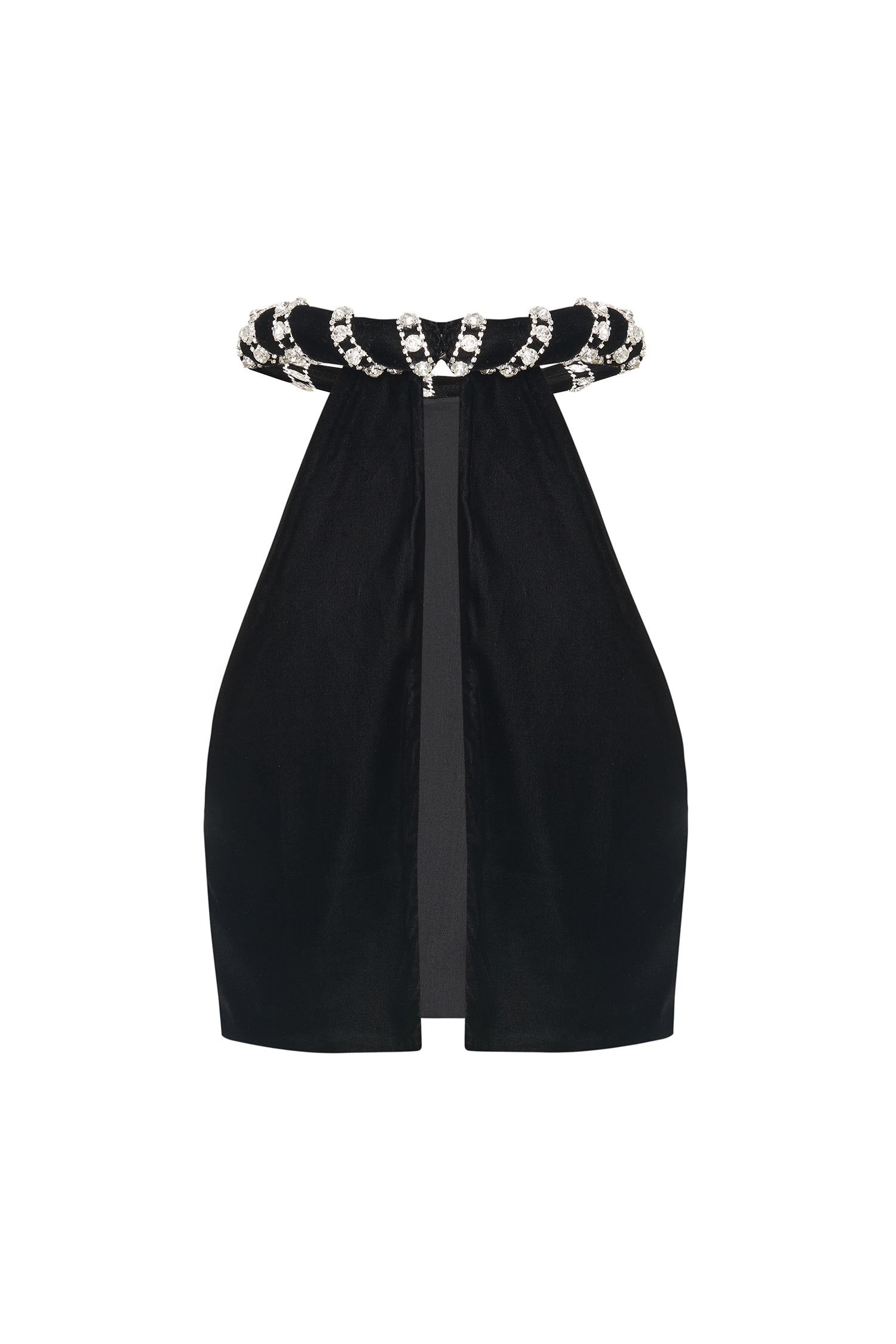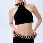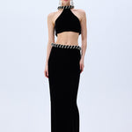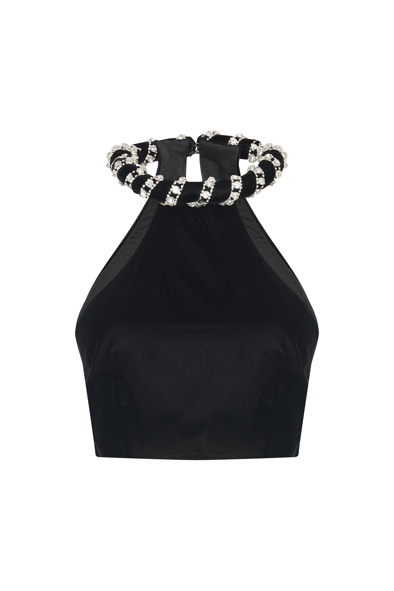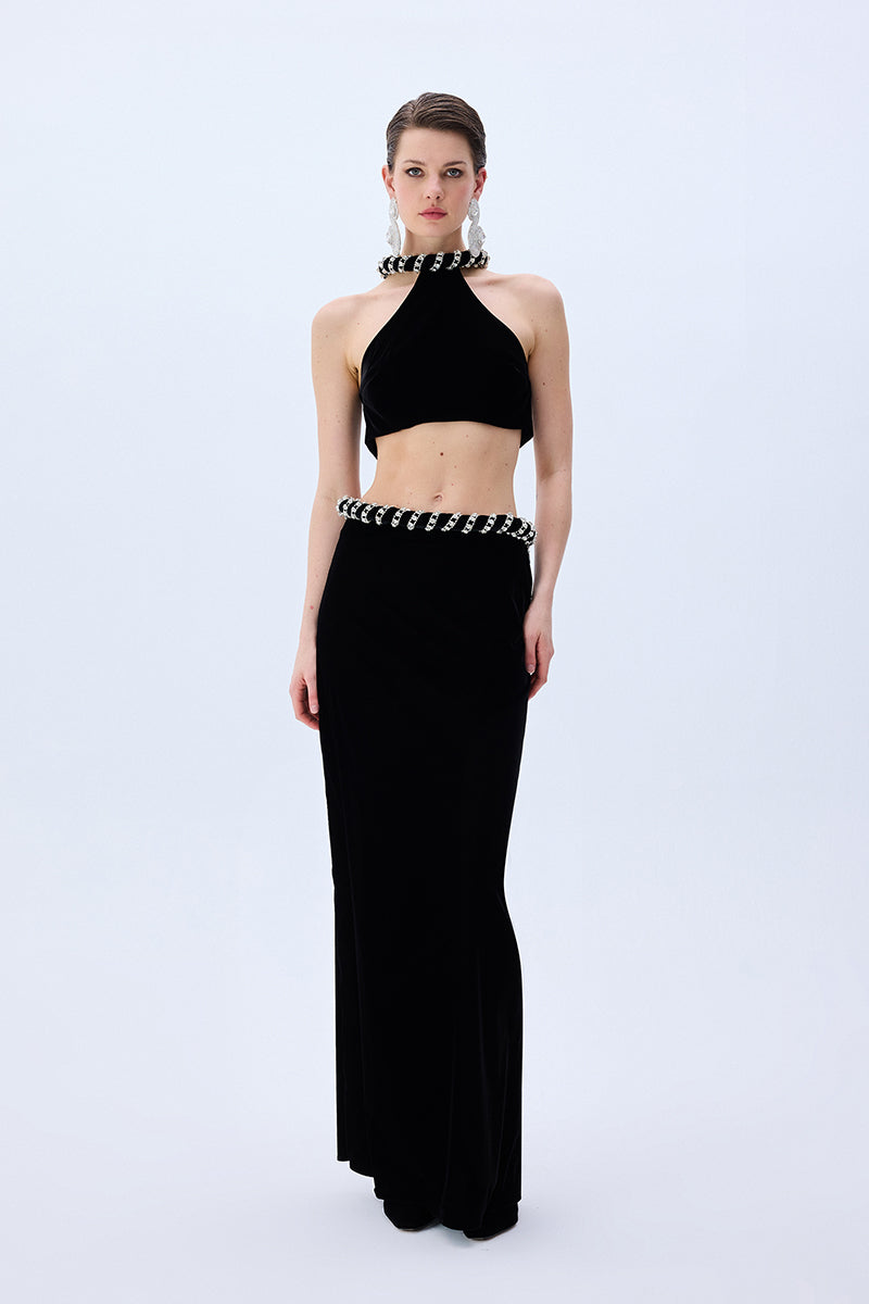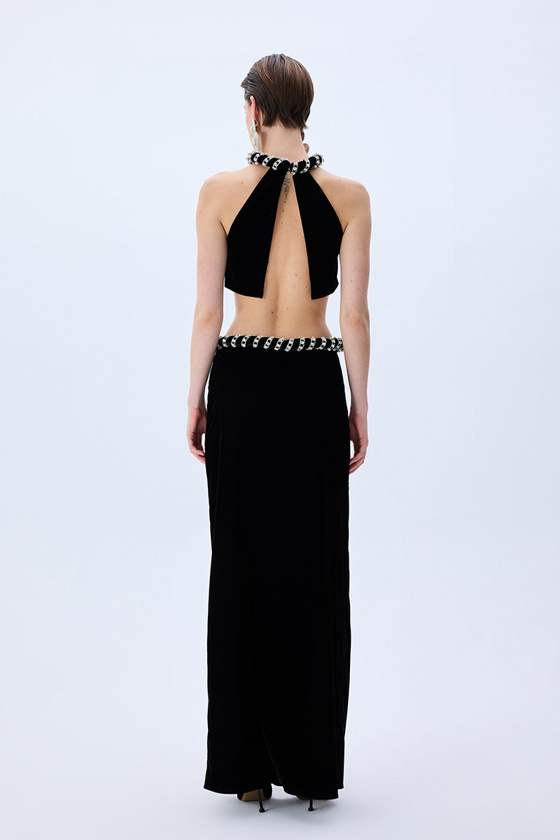 Crafted from rich velvet, the crop top features a halter silhouette elevated by a crystal rope neckline. Its open back and precise tailoring accentuate the figure, offering a refined yet daring elegance. Perfect for pairing with its coordinating skirt or styled separately for statement looks.