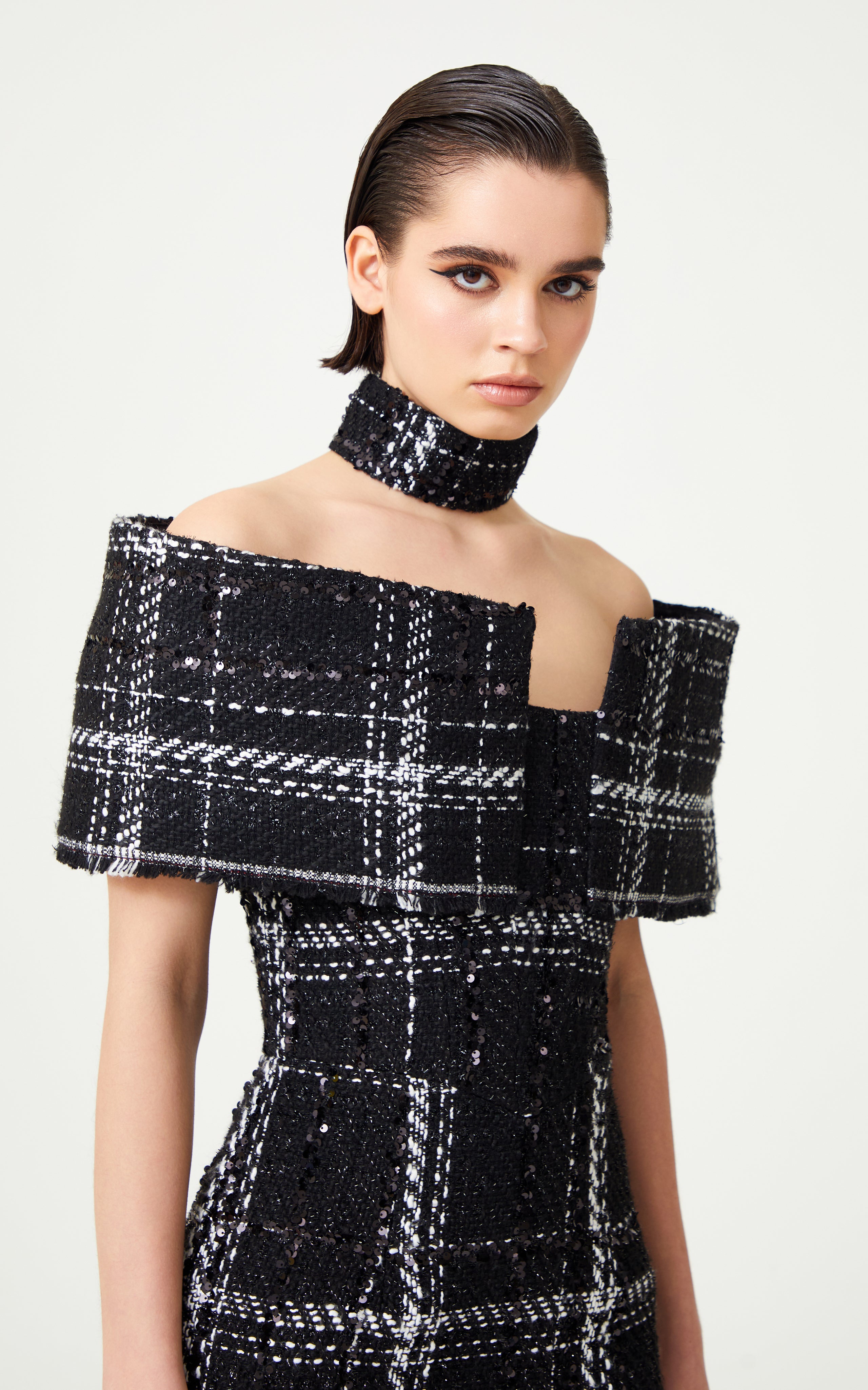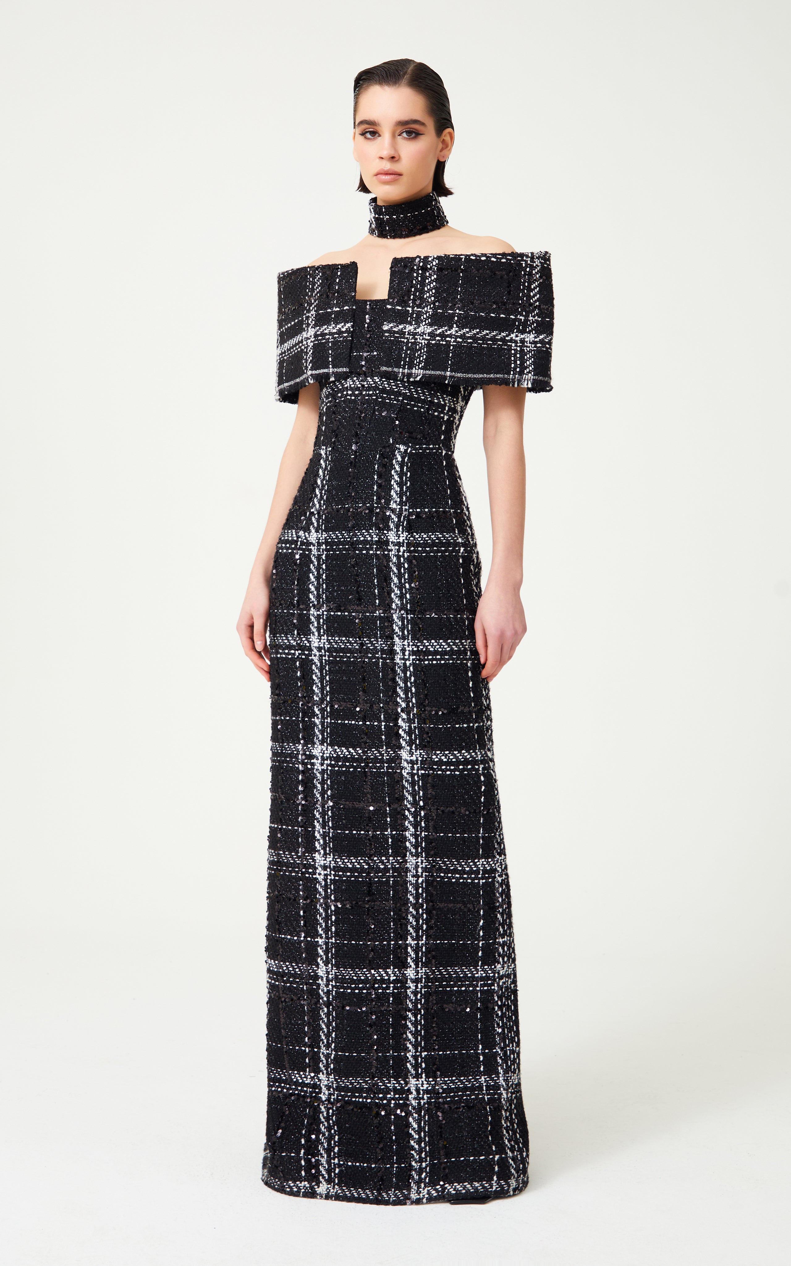 This maxi dress combines classic elegance with contemporary flair. The black and white plaid tweed fabric is adorned with sequin embellishments, adding a touch of sparkle and sophistication. Featuring a royal neckline, it offers a stylish and timeless look perfect for special occasions or evening events.