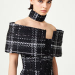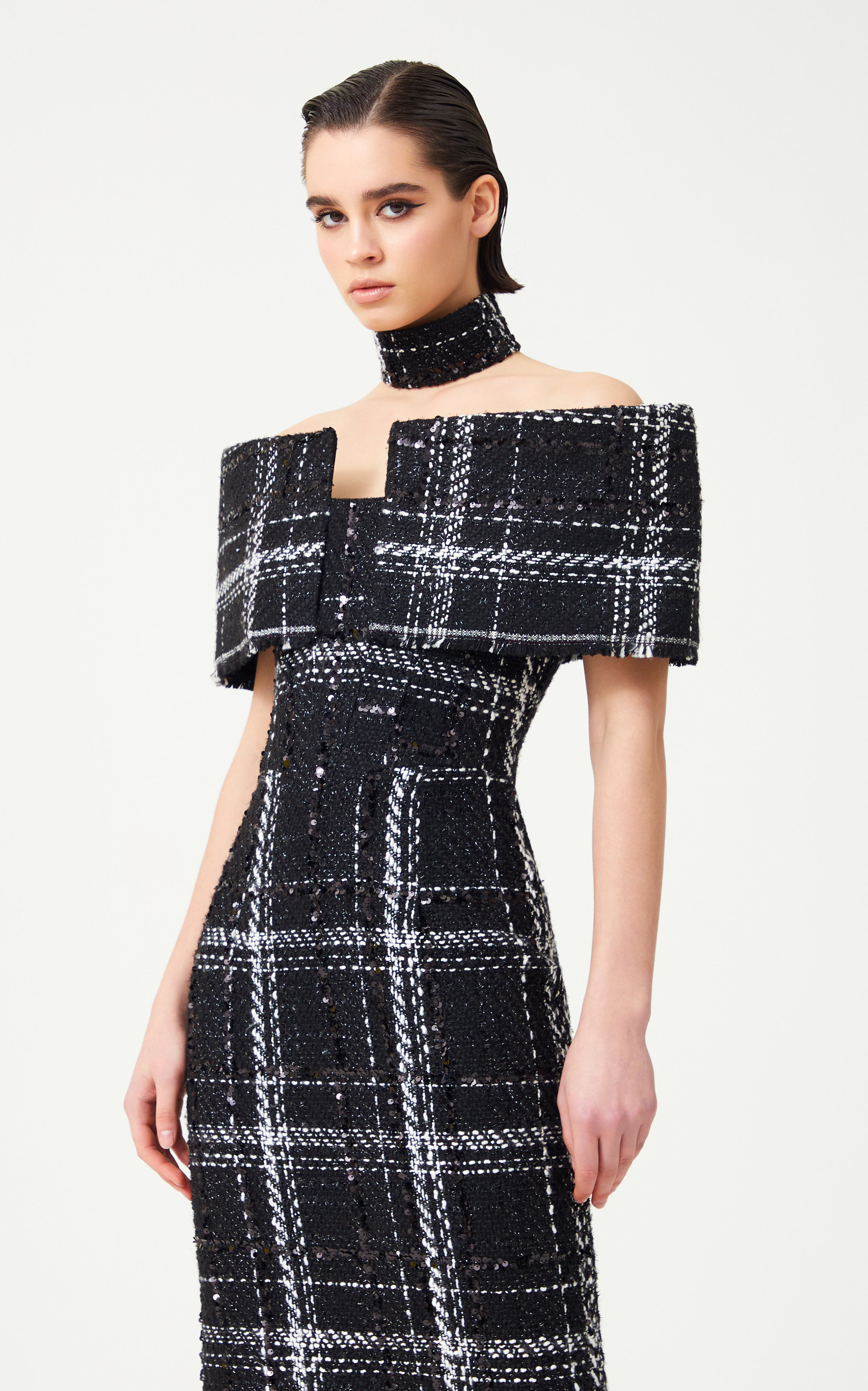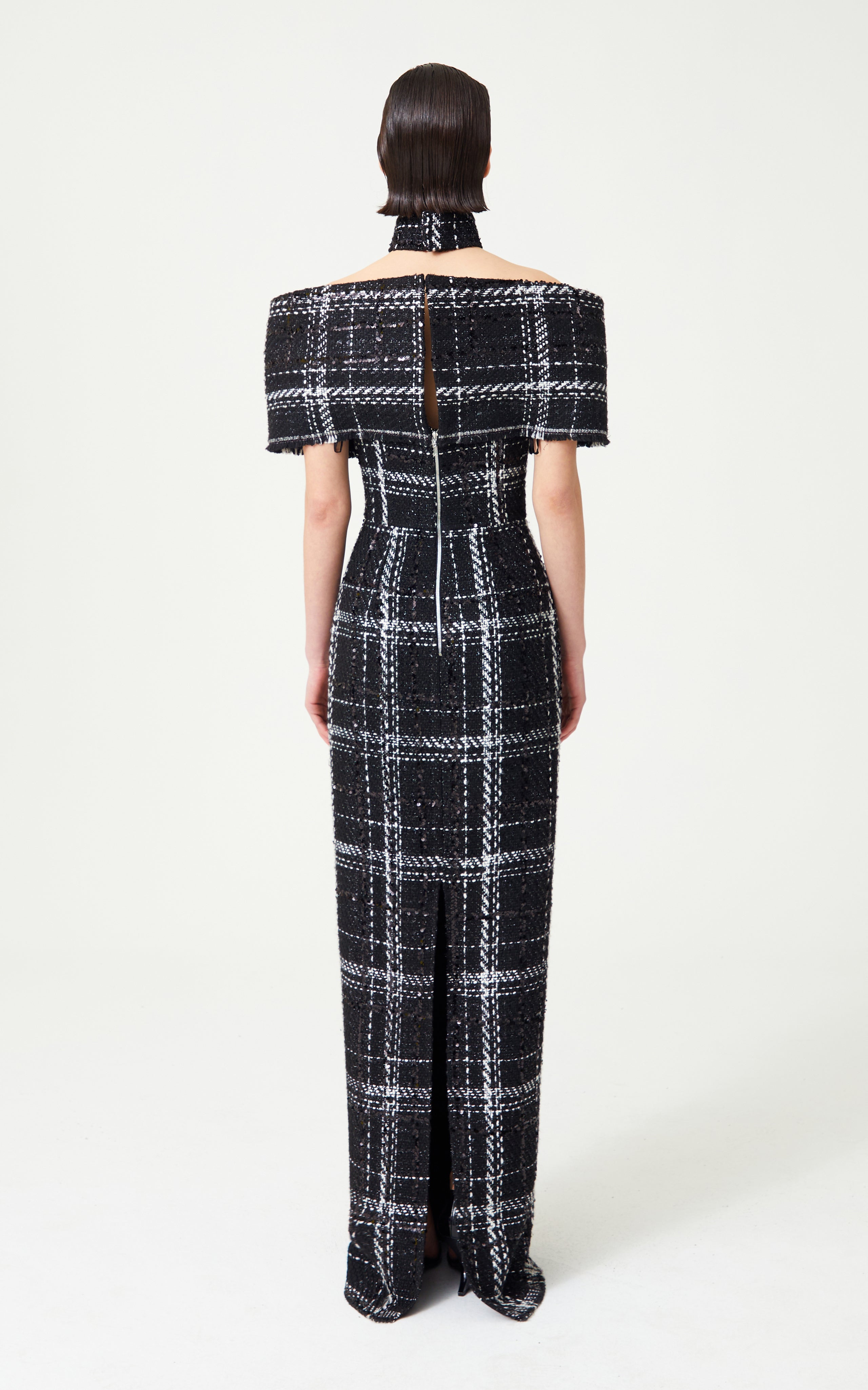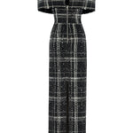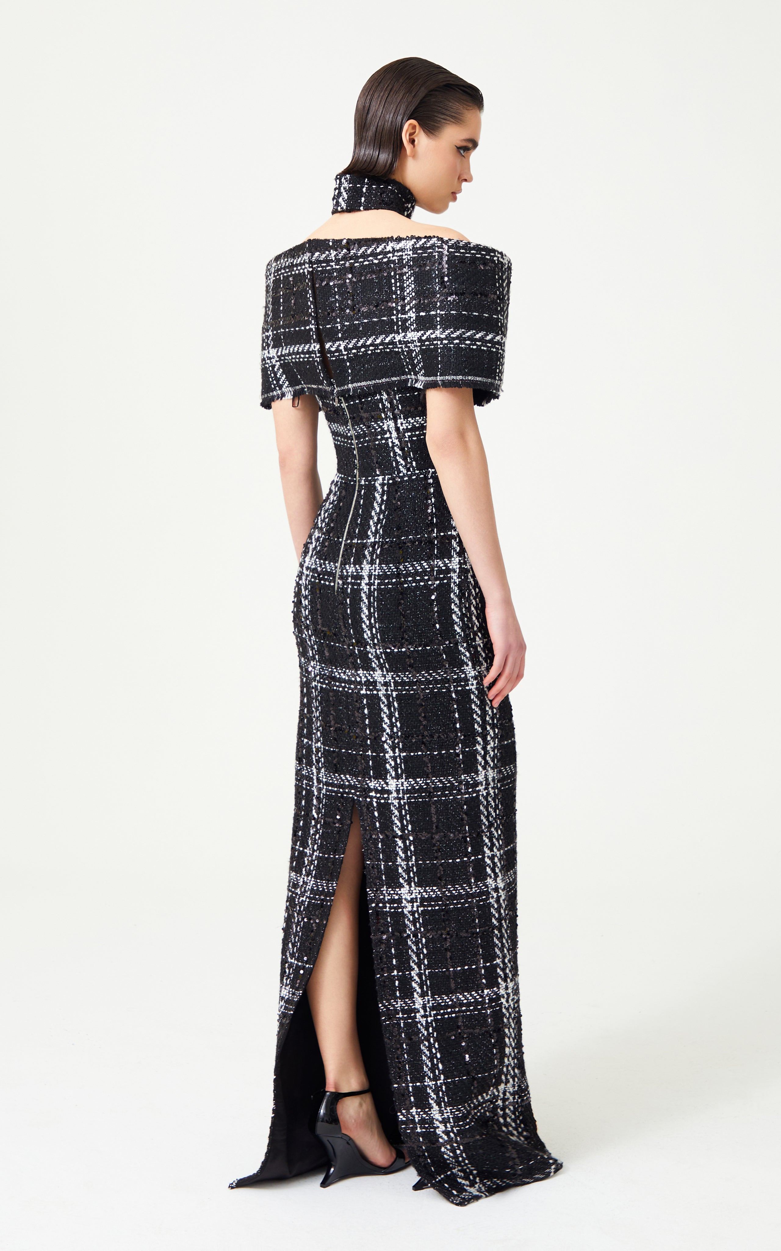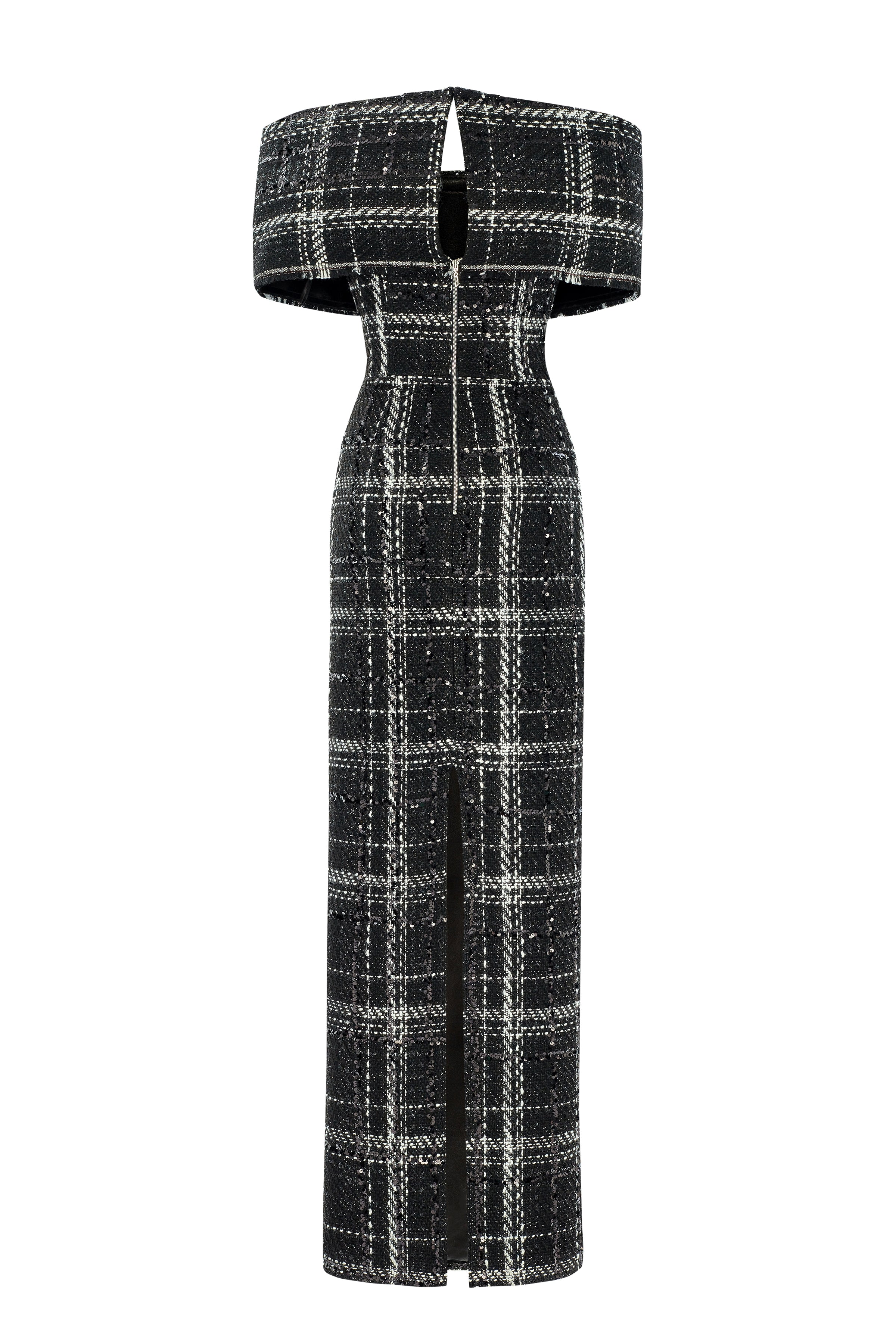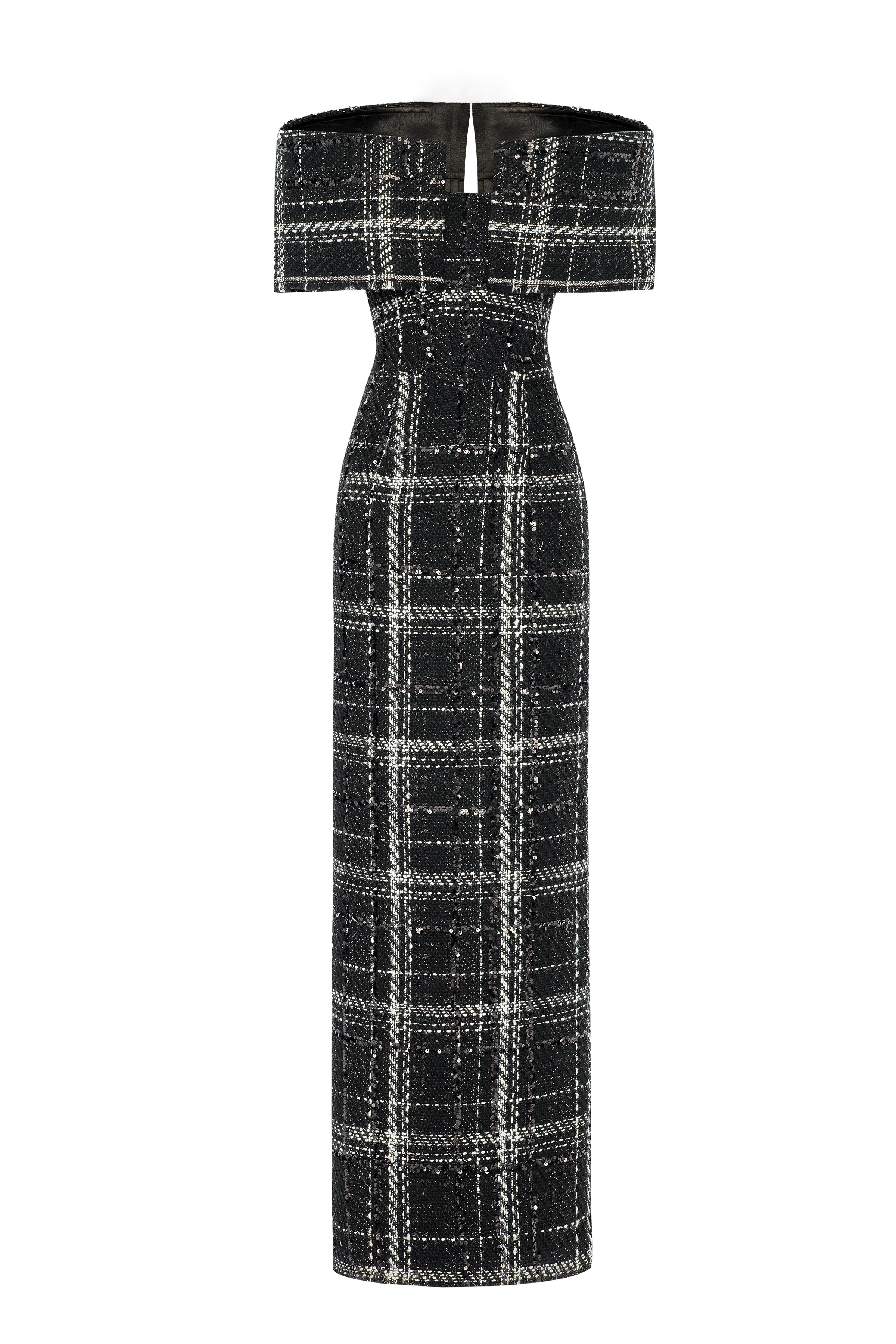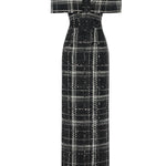 Black & White Plaid Sequin Embellished Tweed Royal Neckline Maxi Dress