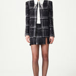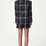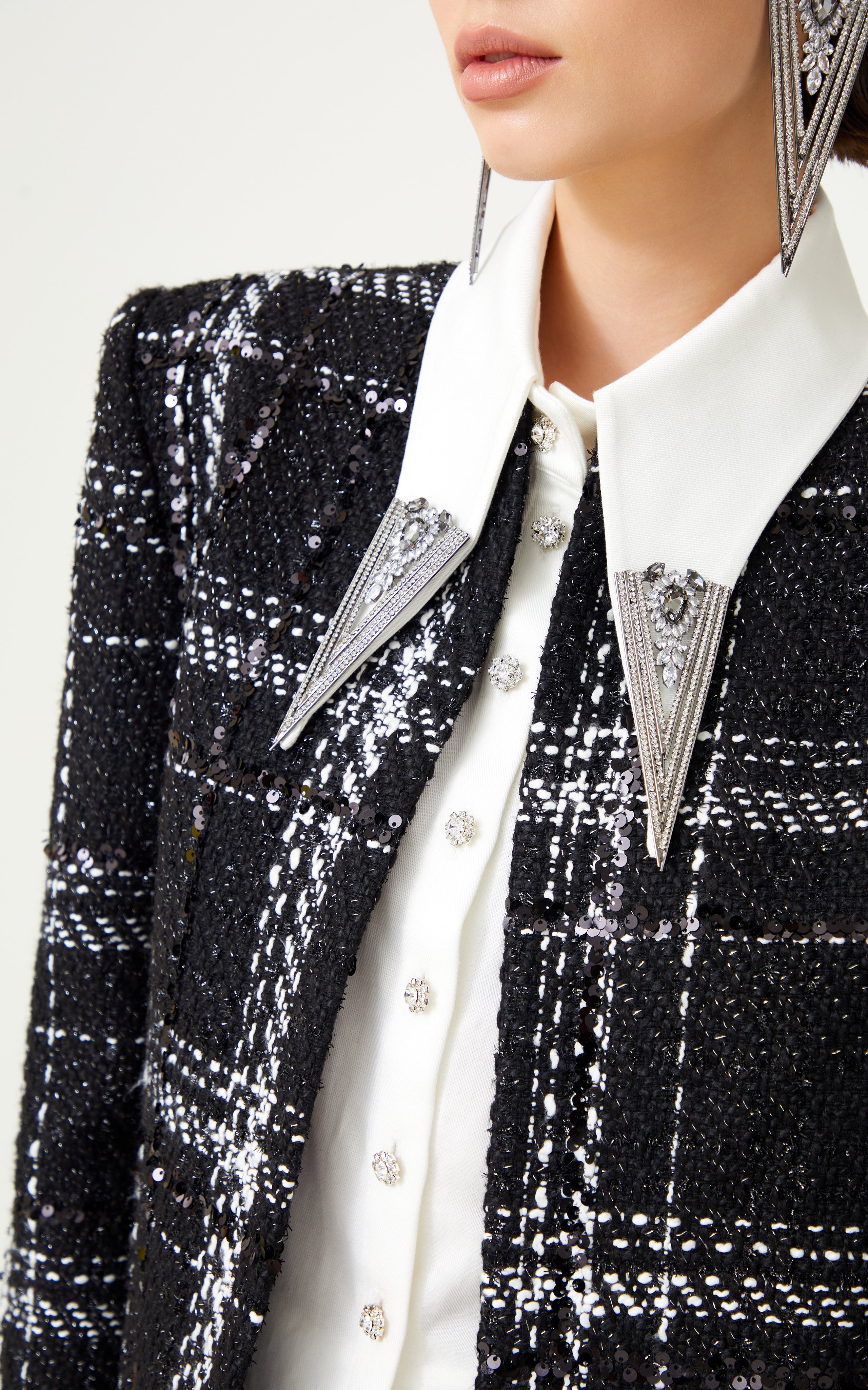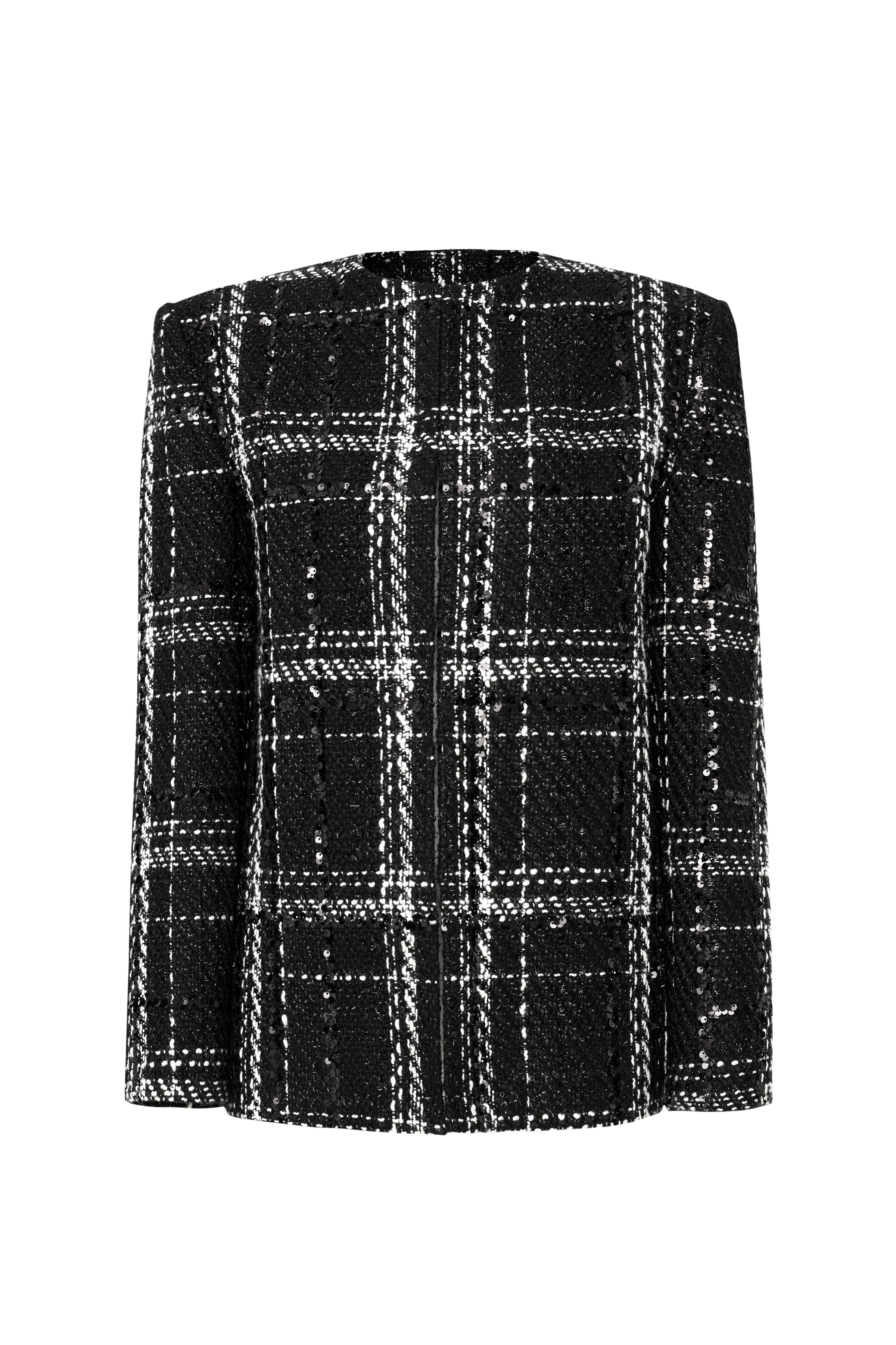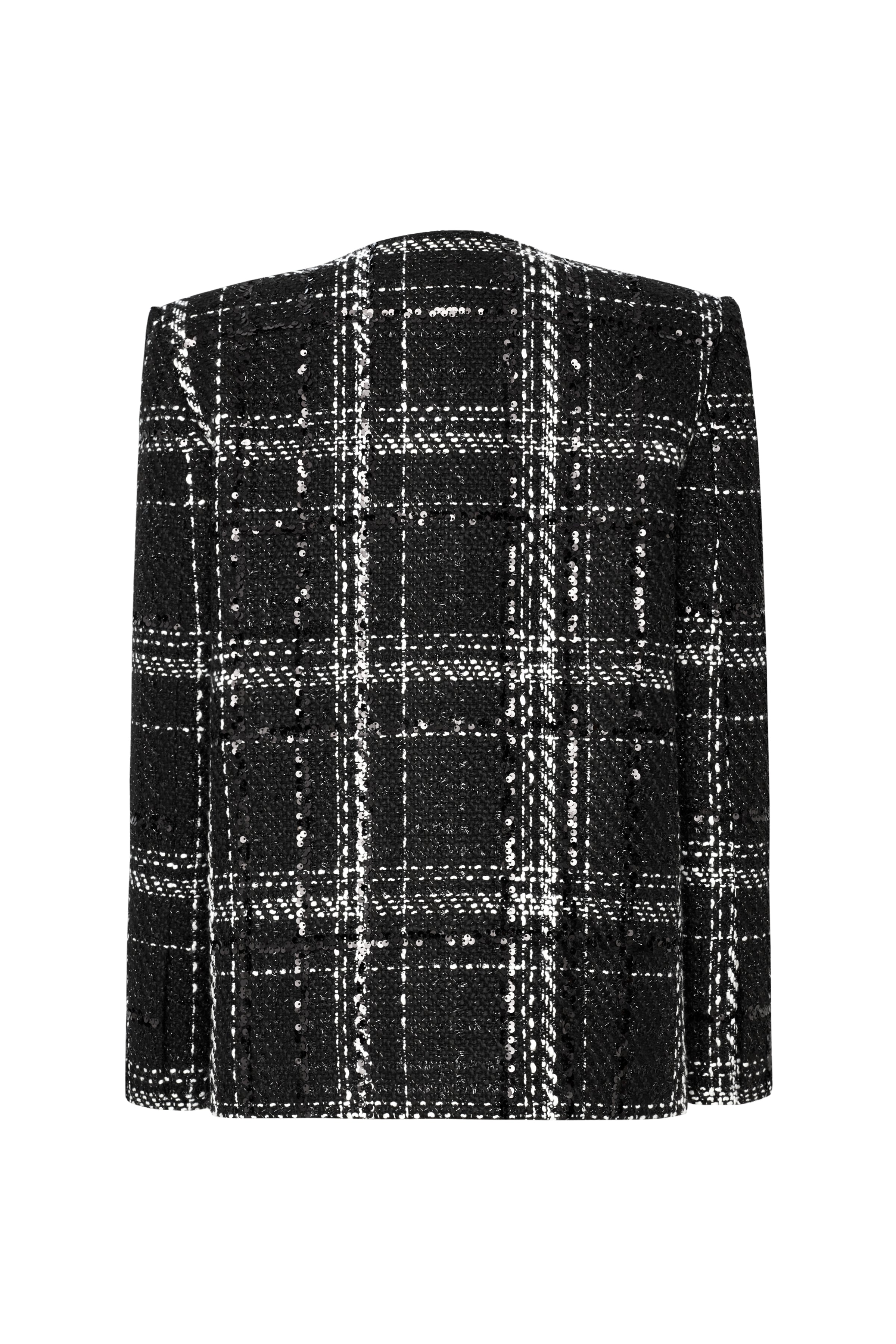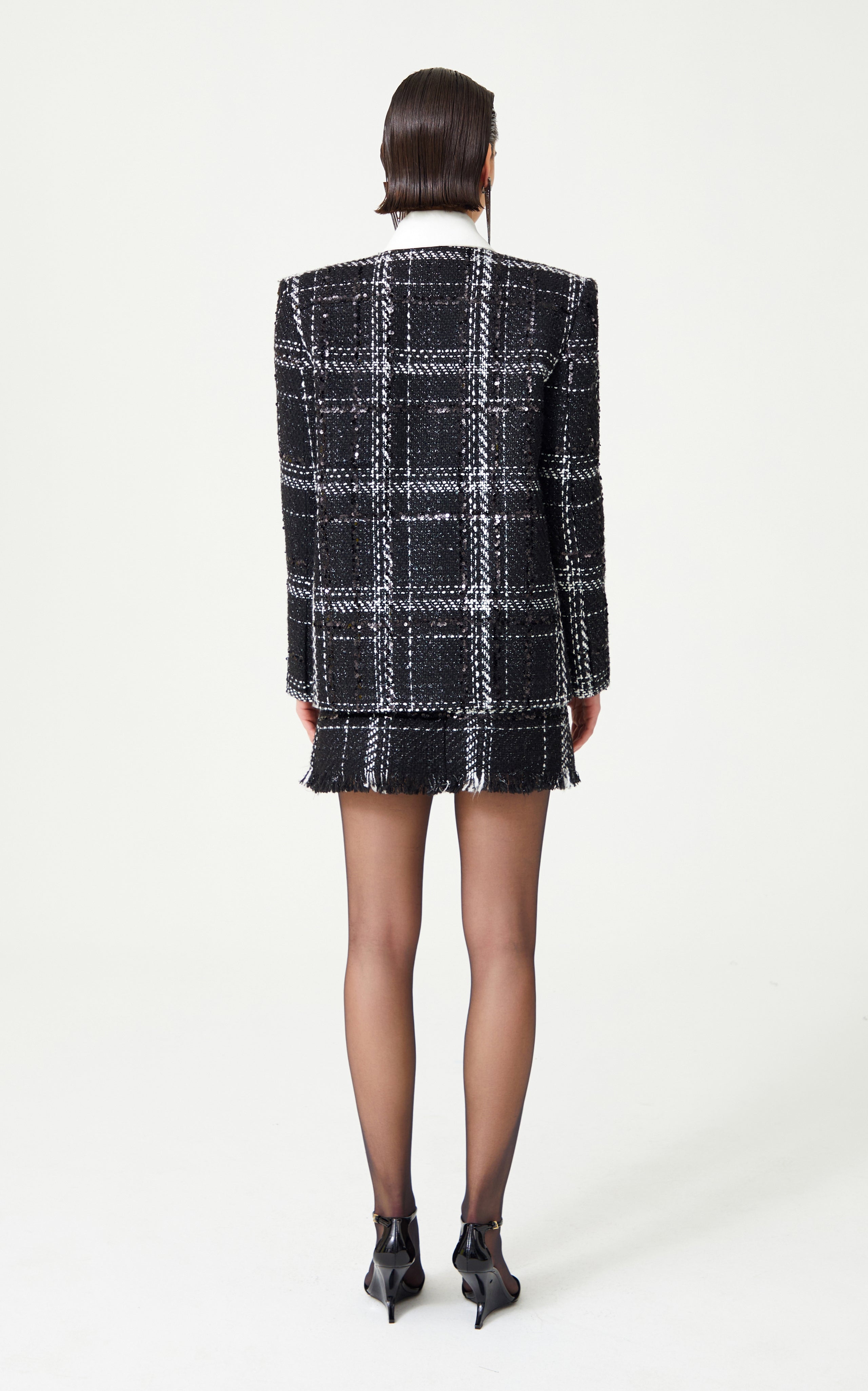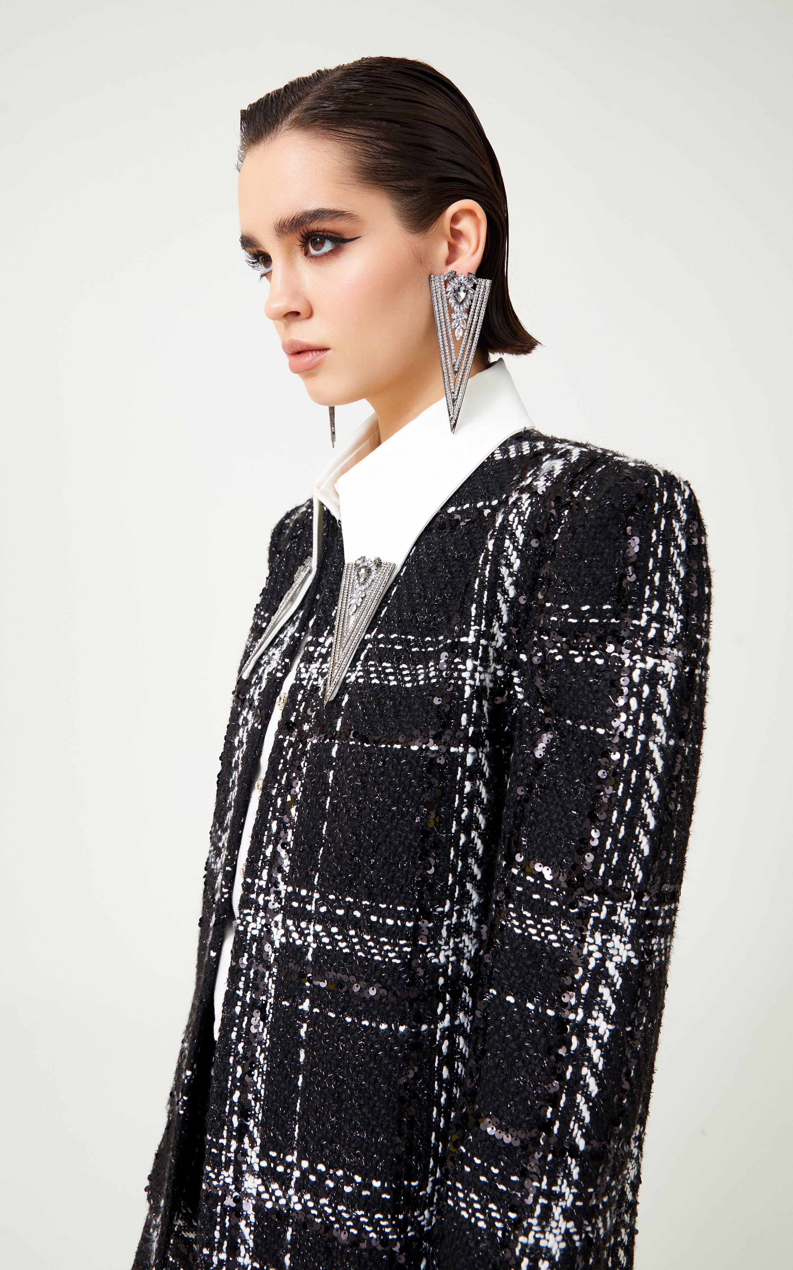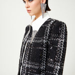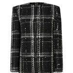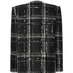 The Black & White Plaid Tweed Sequined Jacket combines timeless plaid with dazzling sequins, creating a statement piece that effortlessly blends sophistication with sparkle.