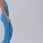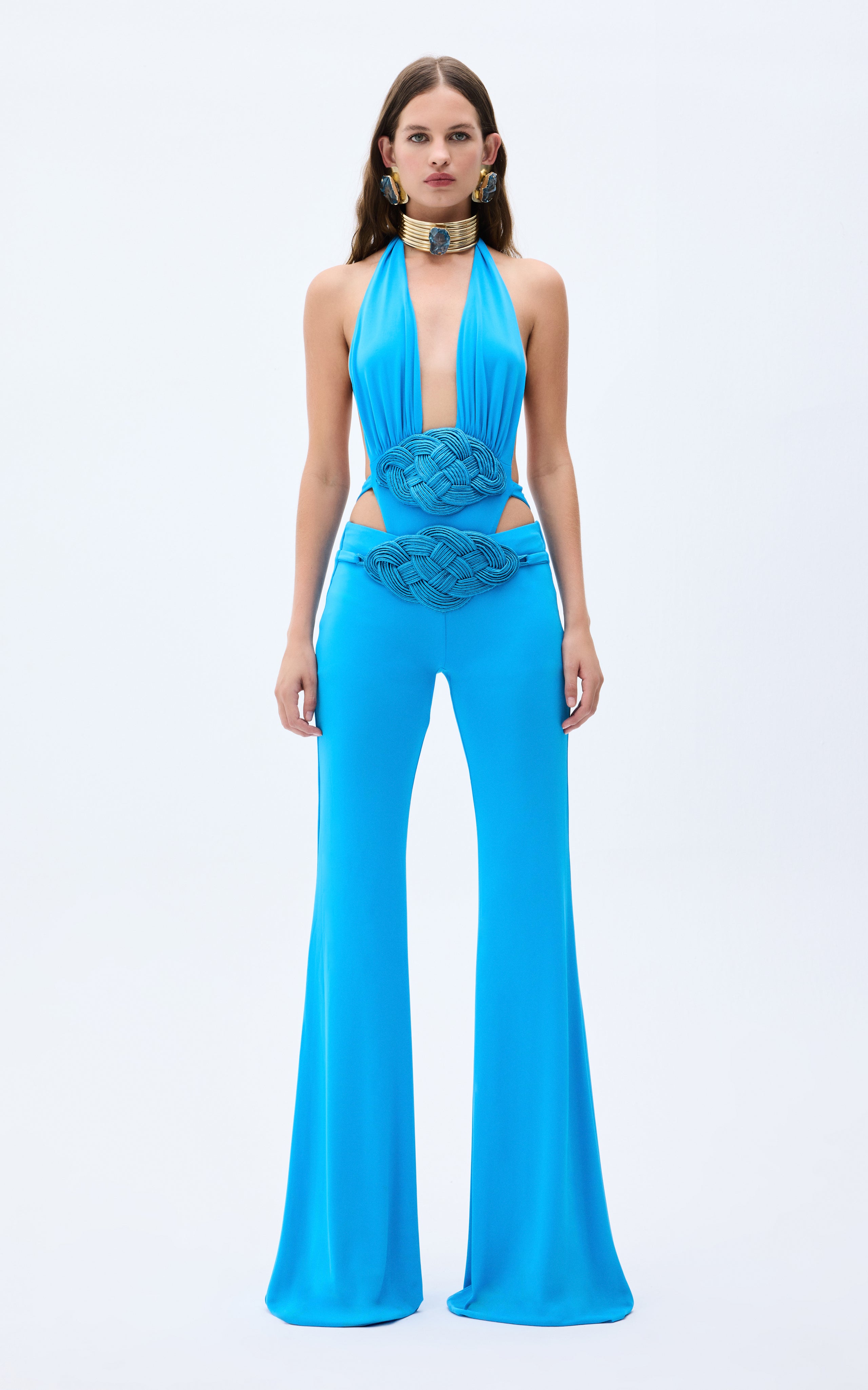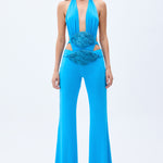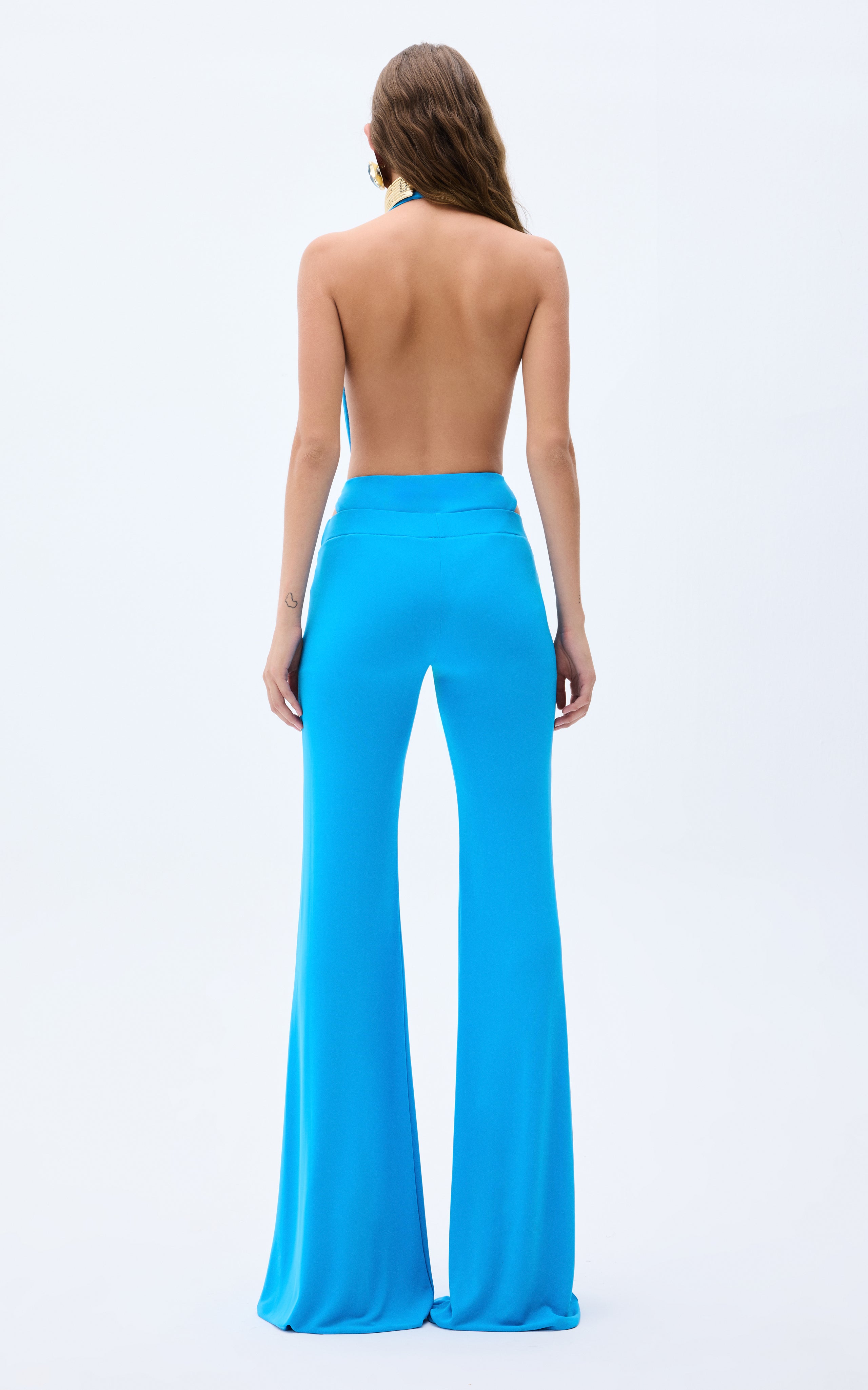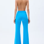 The blue flare pants feature a handmade belt detail, adding a touch of artisanal charm to their chic, retro-inspired silhouette. Perfect for creating a stylish and relaxed look, they combine comfort with unique design.