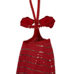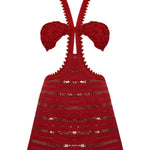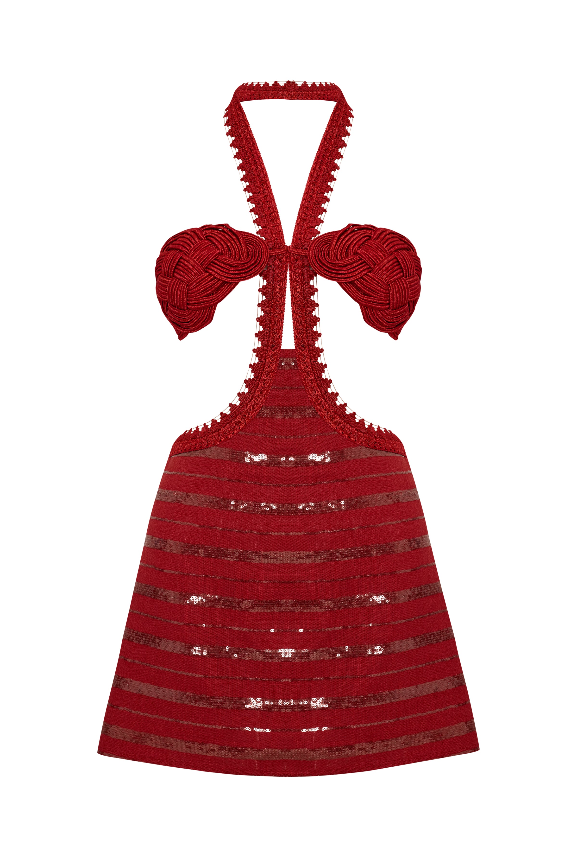 The brick linen mini dress is adorned with sequined stripes and a handmade rope-detailed bra, creating a chic and edgy look. Its unique design and flattering fit make it a perfect choice for a stylish, attention-grabbing outfit.