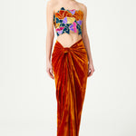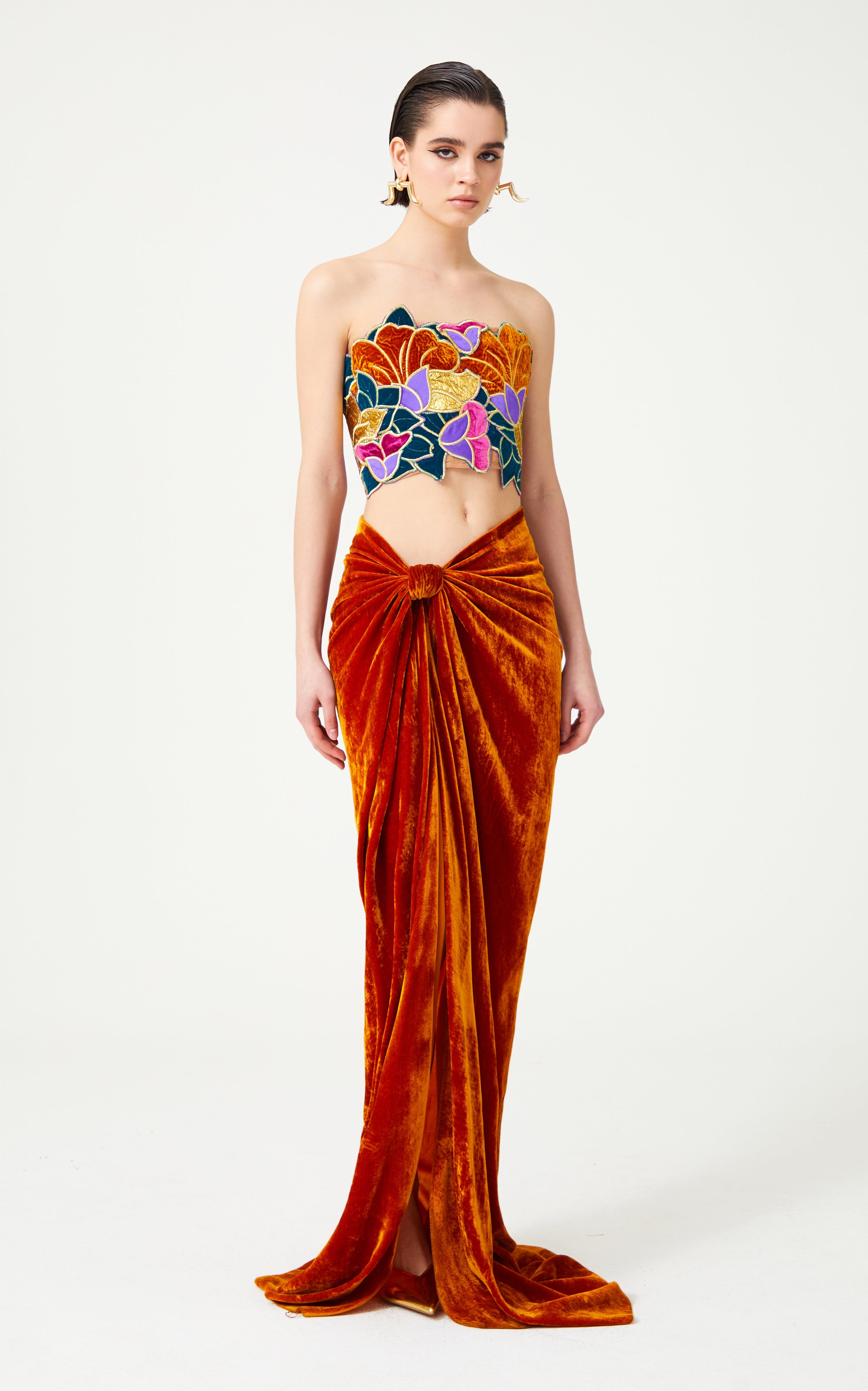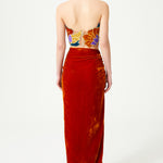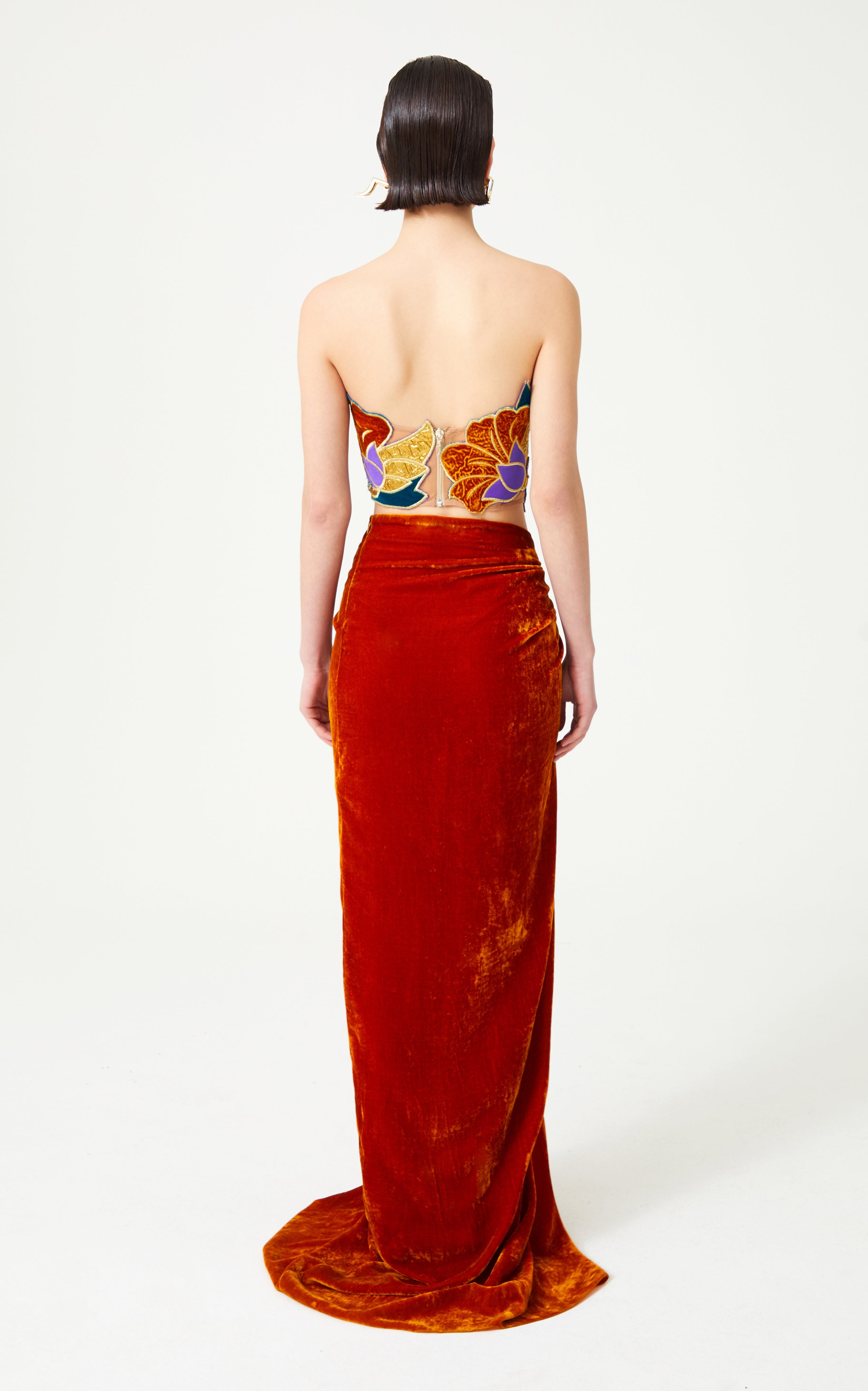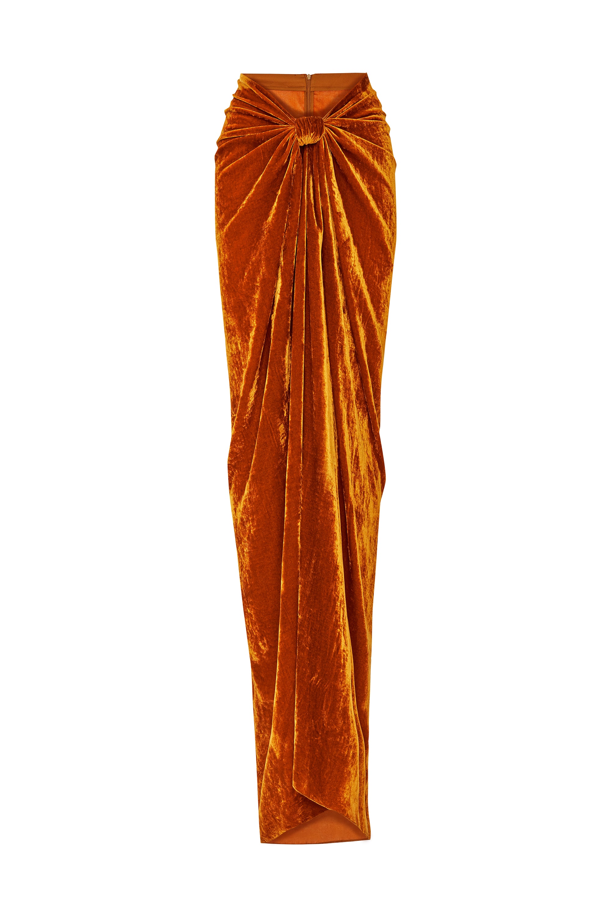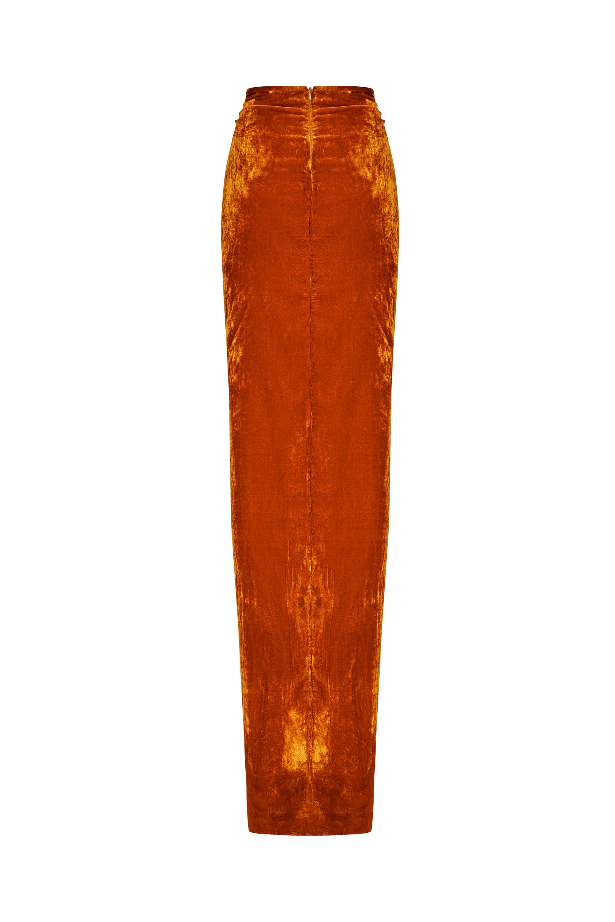 The Brick Red Silk Velvet Maxi Skirt exudes luxury with its sumptuous fabric and elegant silhouette, offering a glamorous addition to your wardrobe.