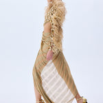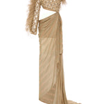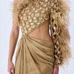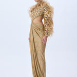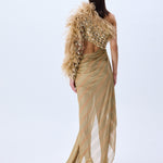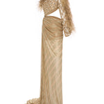 Brode Lace One Shouldered Gown With Big Crystals, Feathers And A Chiffon Skirt With Stick Stones