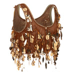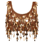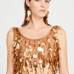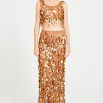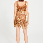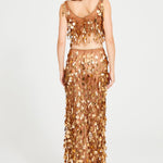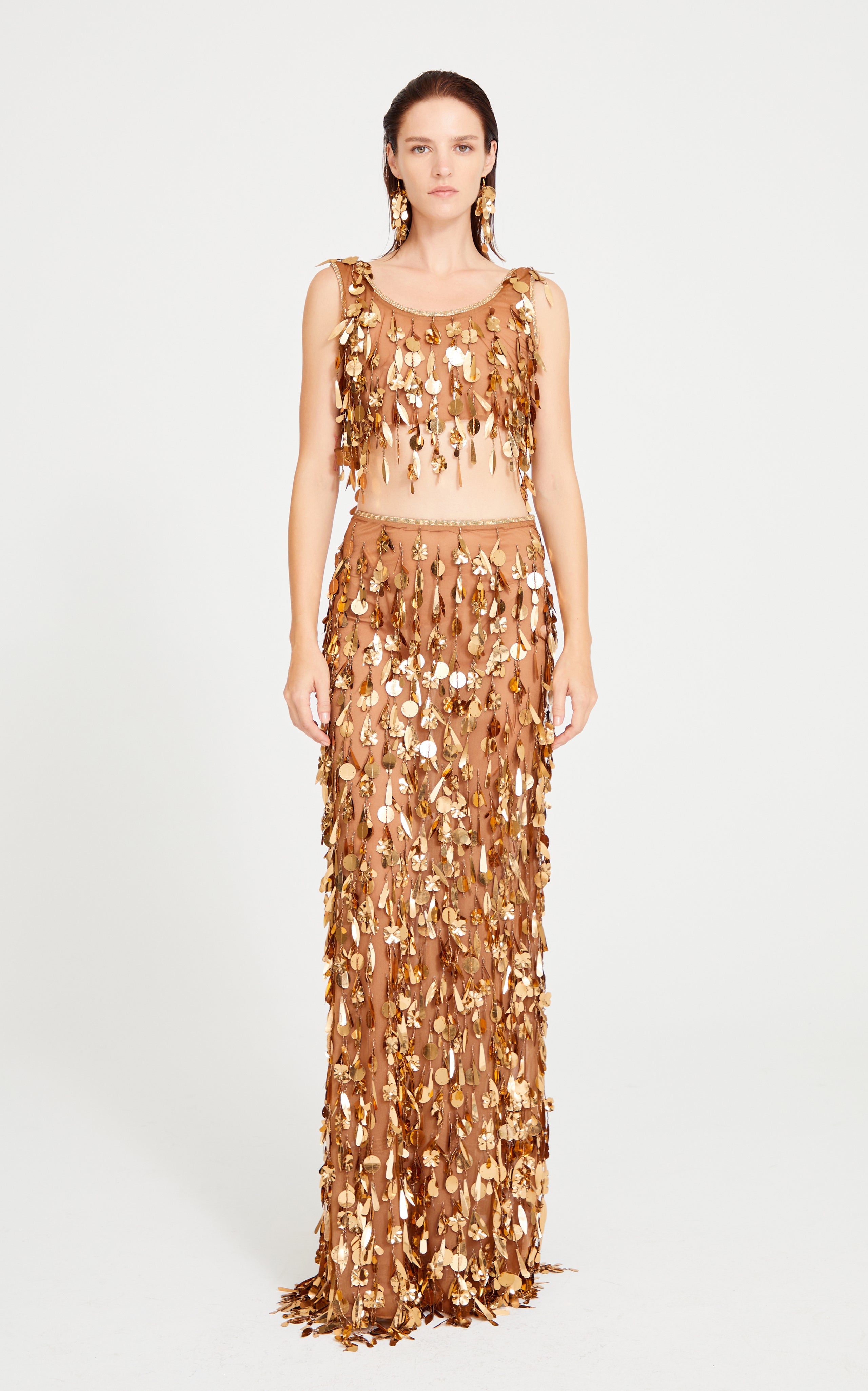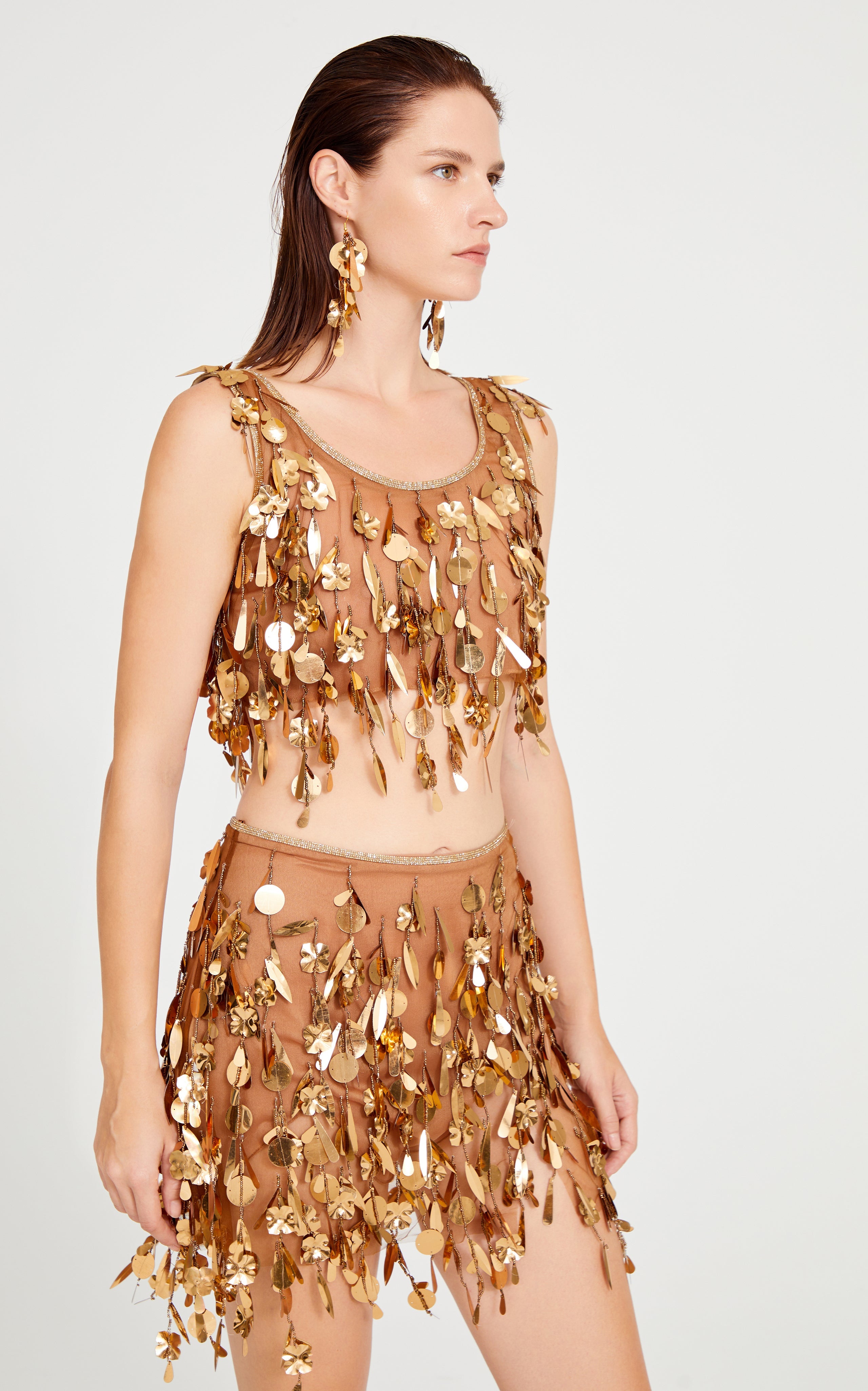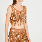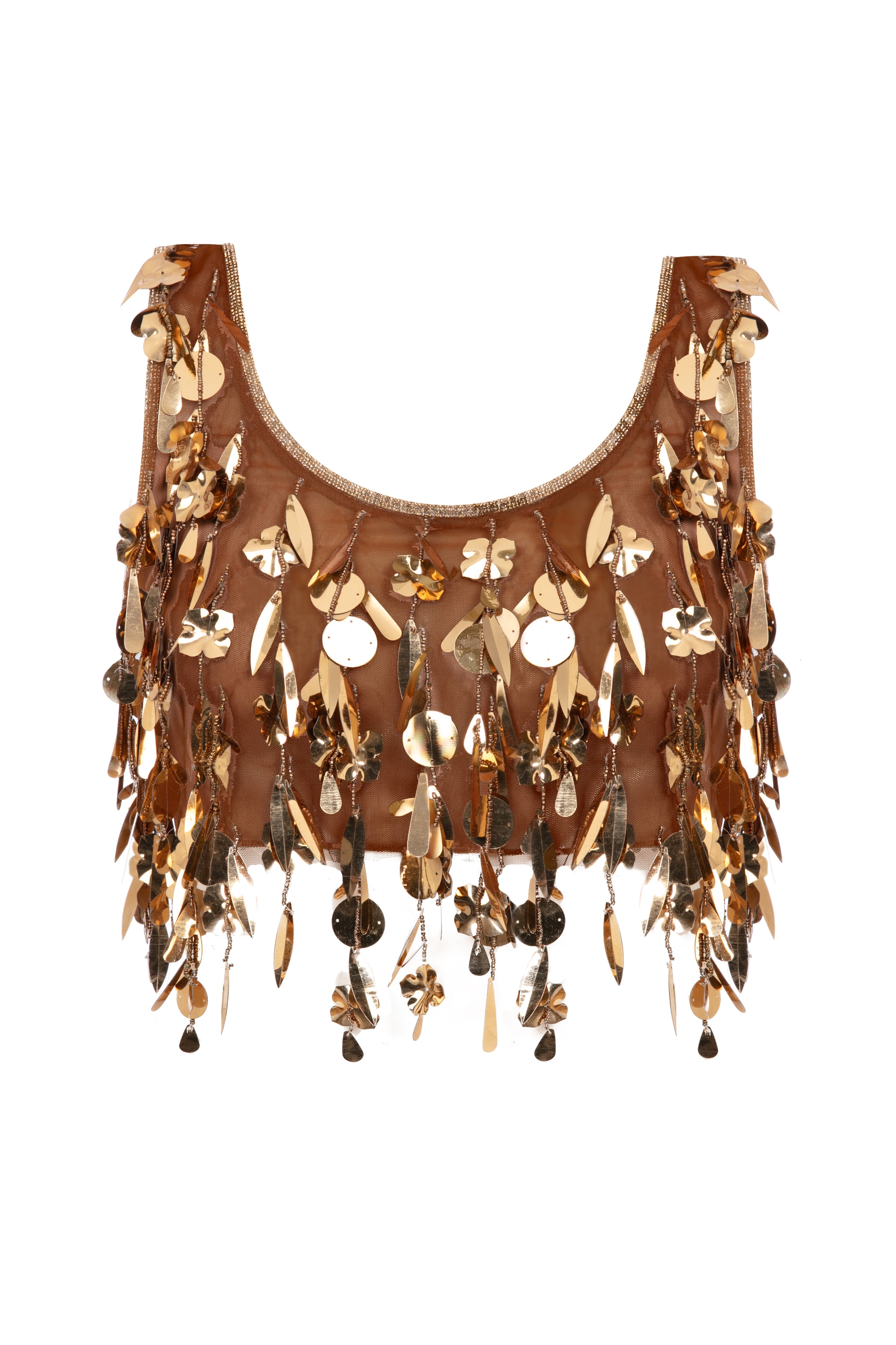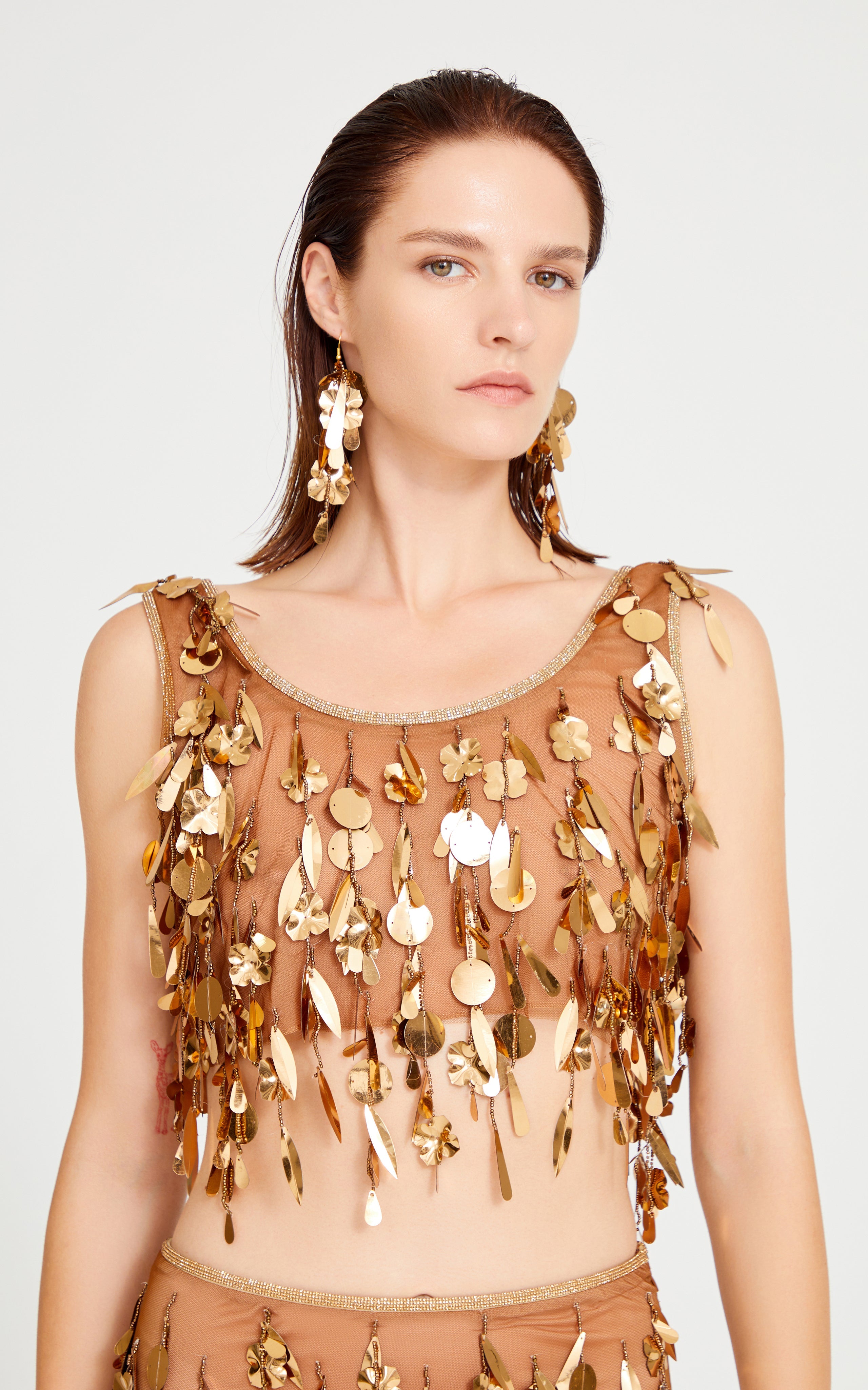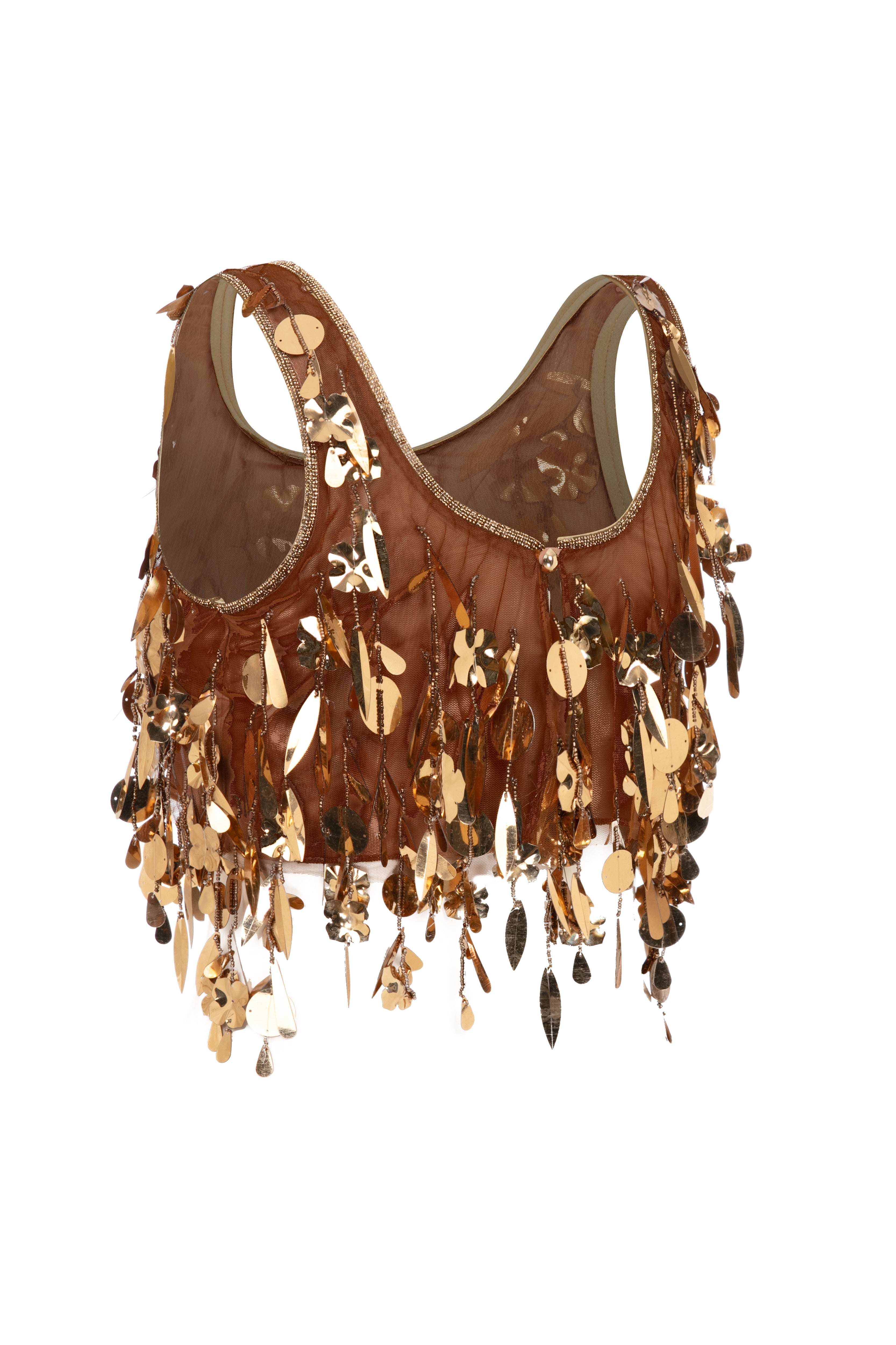 Get ready to shine in our Bronze Beaded Tulle Crop Top, featuring dripping gold sequins and embroidery details.