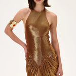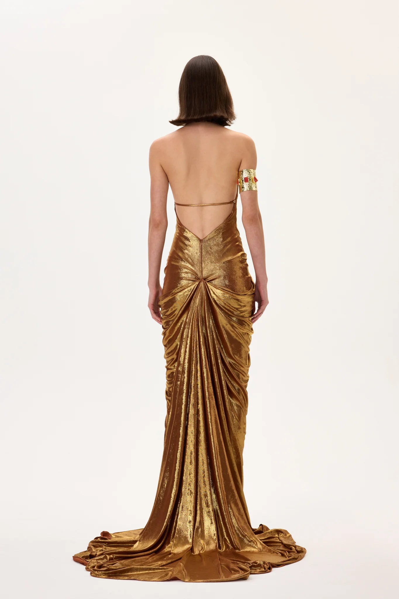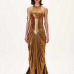 Elegant bronze metallic jersey gown featuring a front slit and a flowing train for dramatic movement. A refined evening design combining timeless sophistication with modern metallic allure.