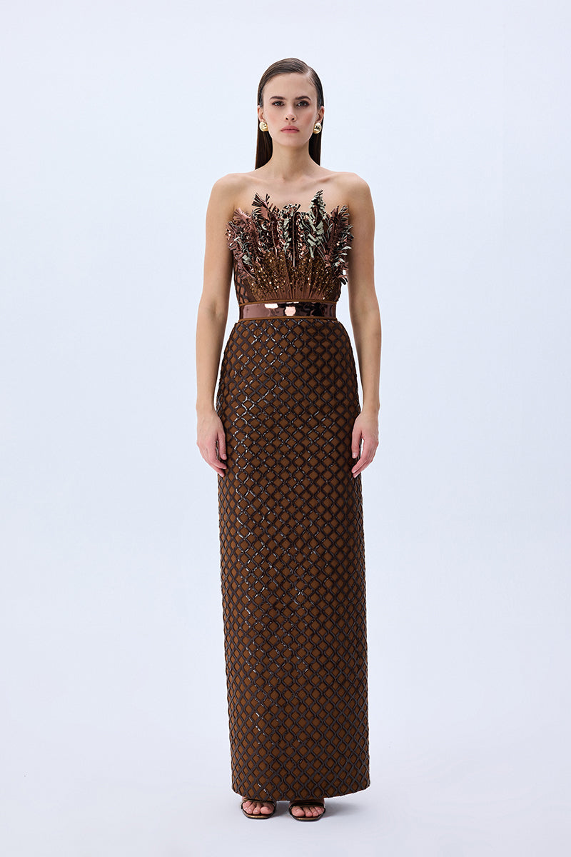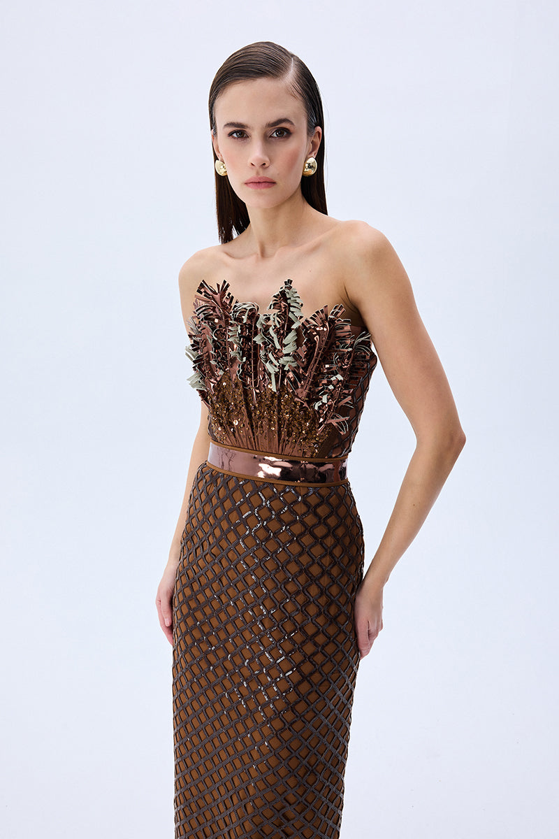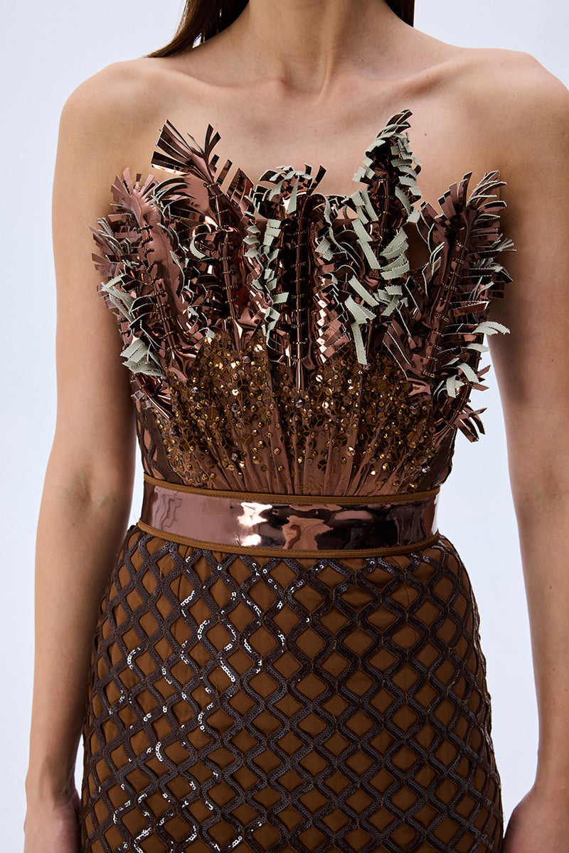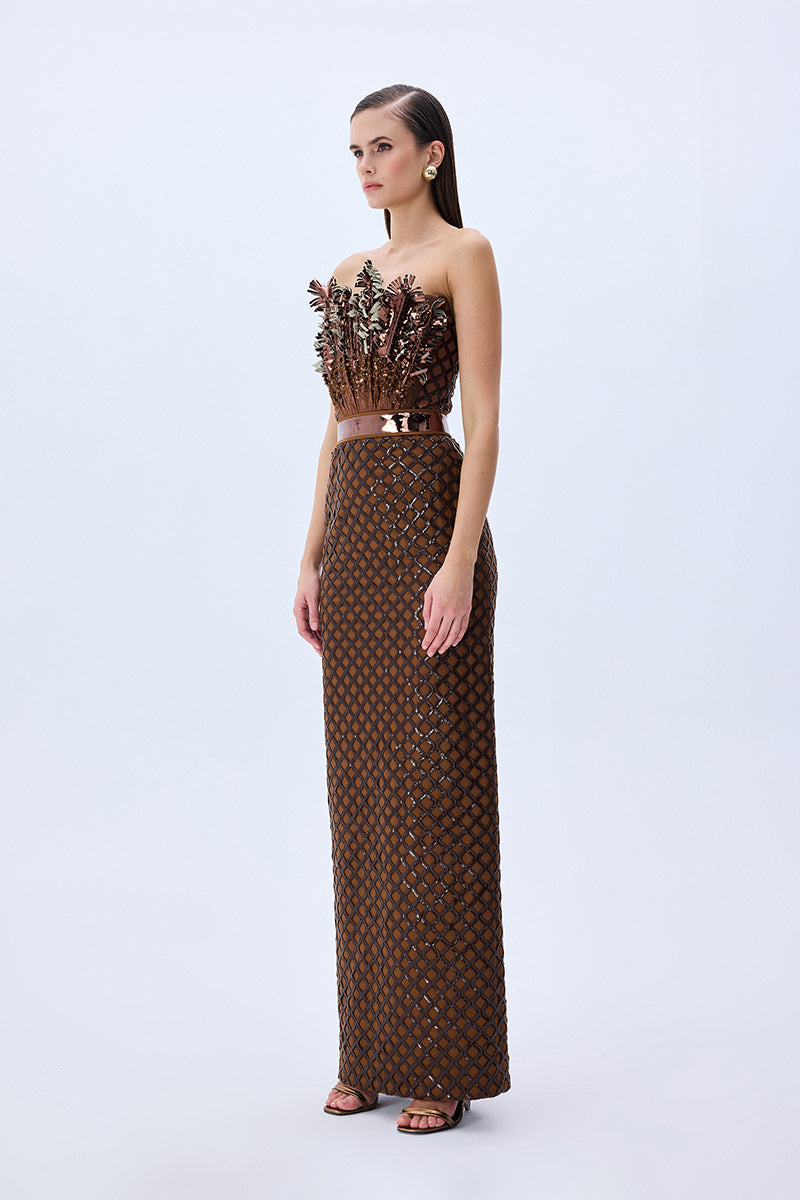 Dimensional patent flowers emerge from the bust, contrasting with the geometric shimmer of brown sequined net. Velvet lining adds richness beneath the surface, creating a look both commanding and poetic.