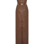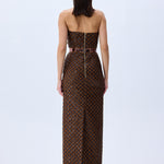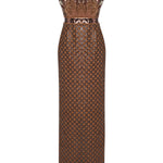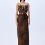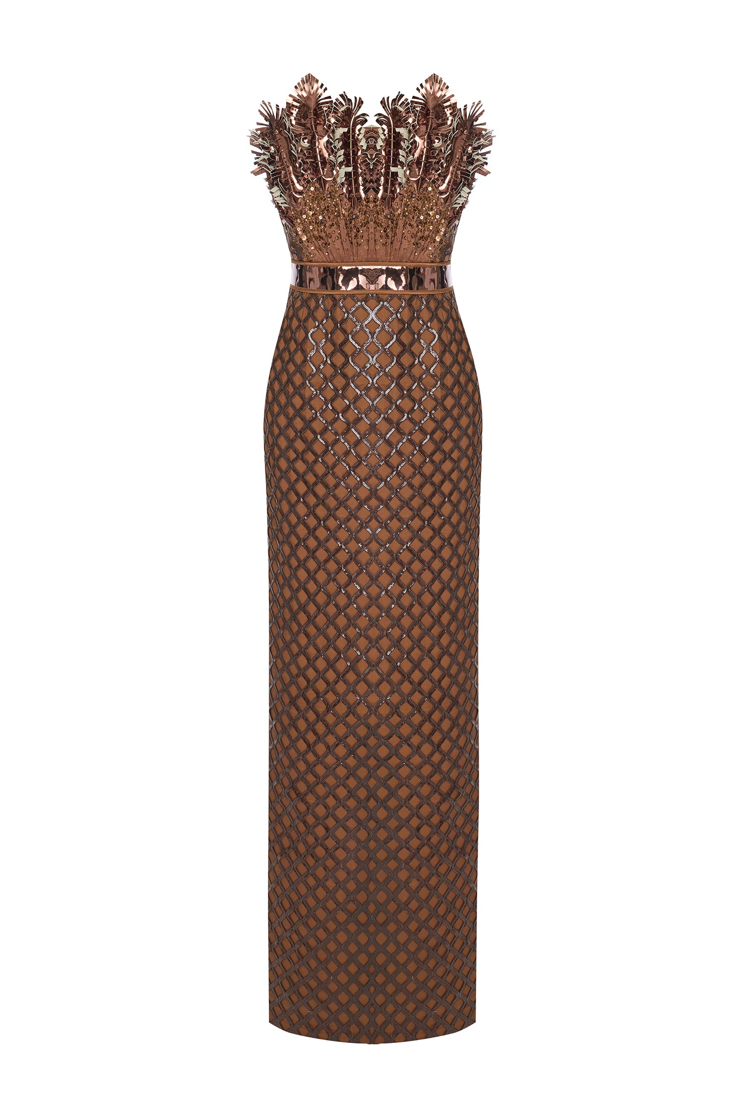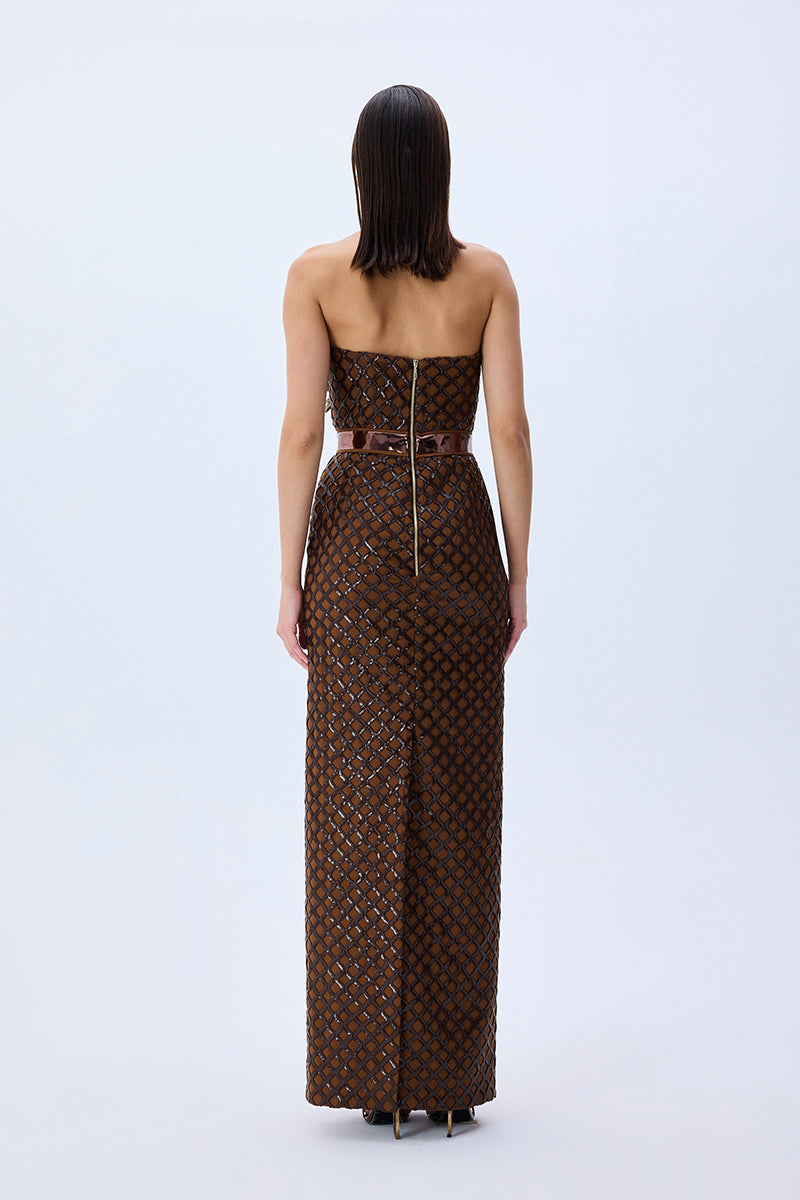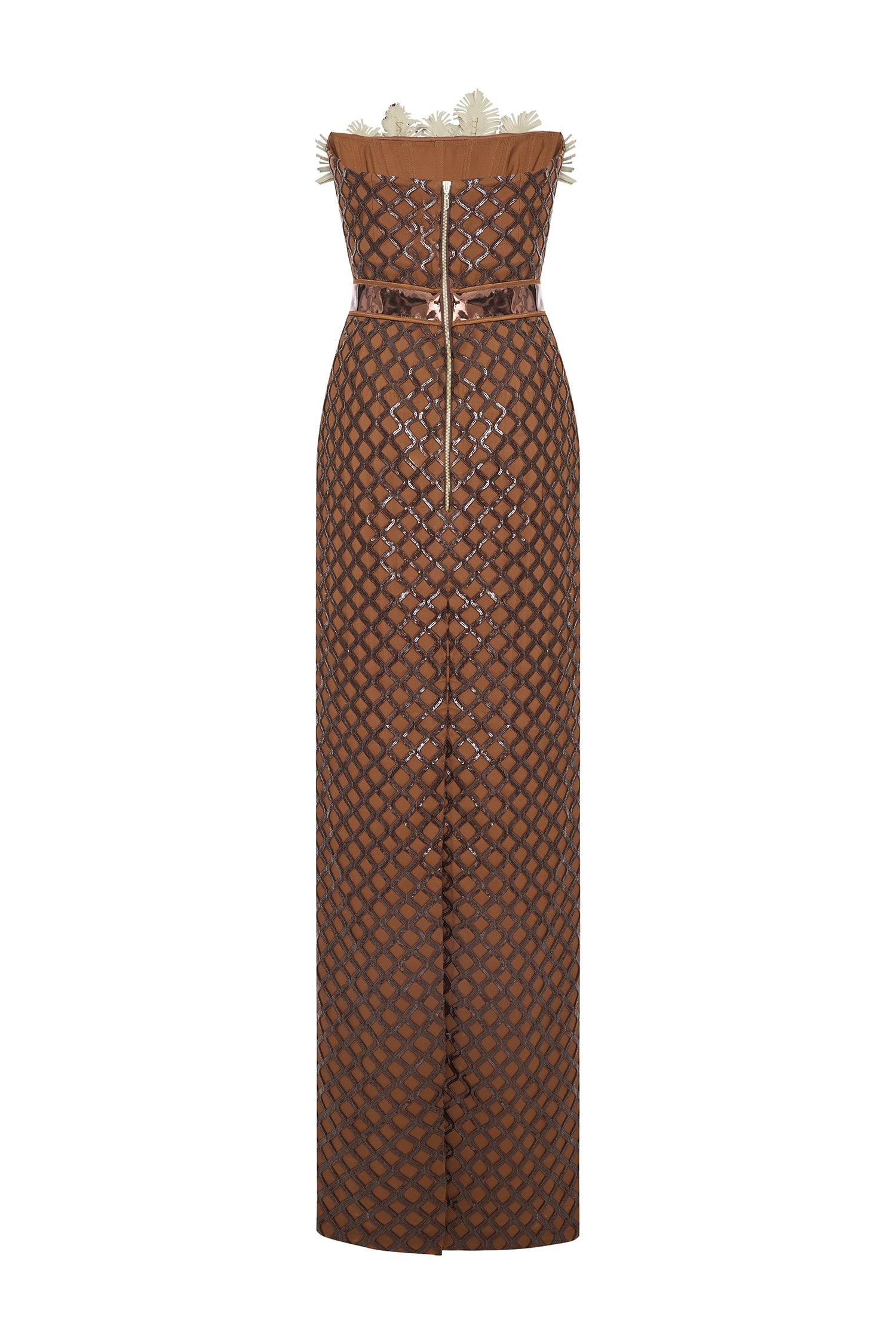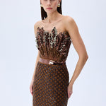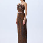 Dimensional patent flowers emerge from the bust, contrasting with the geometric shimmer of brown sequined net. Velvet lining adds richness beneath the surface, creating a look both commanding and poetic.