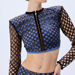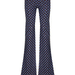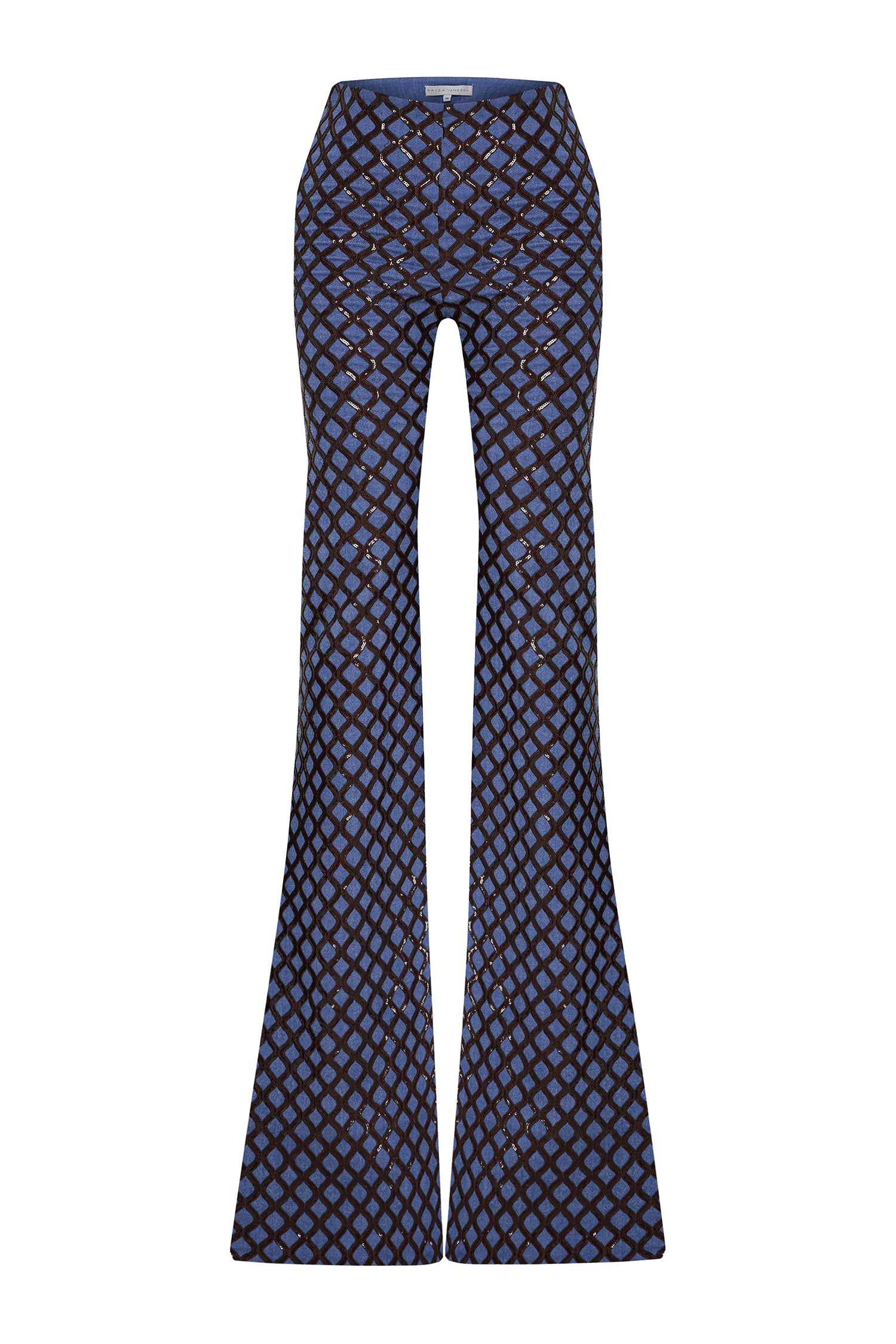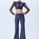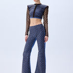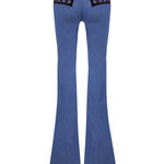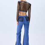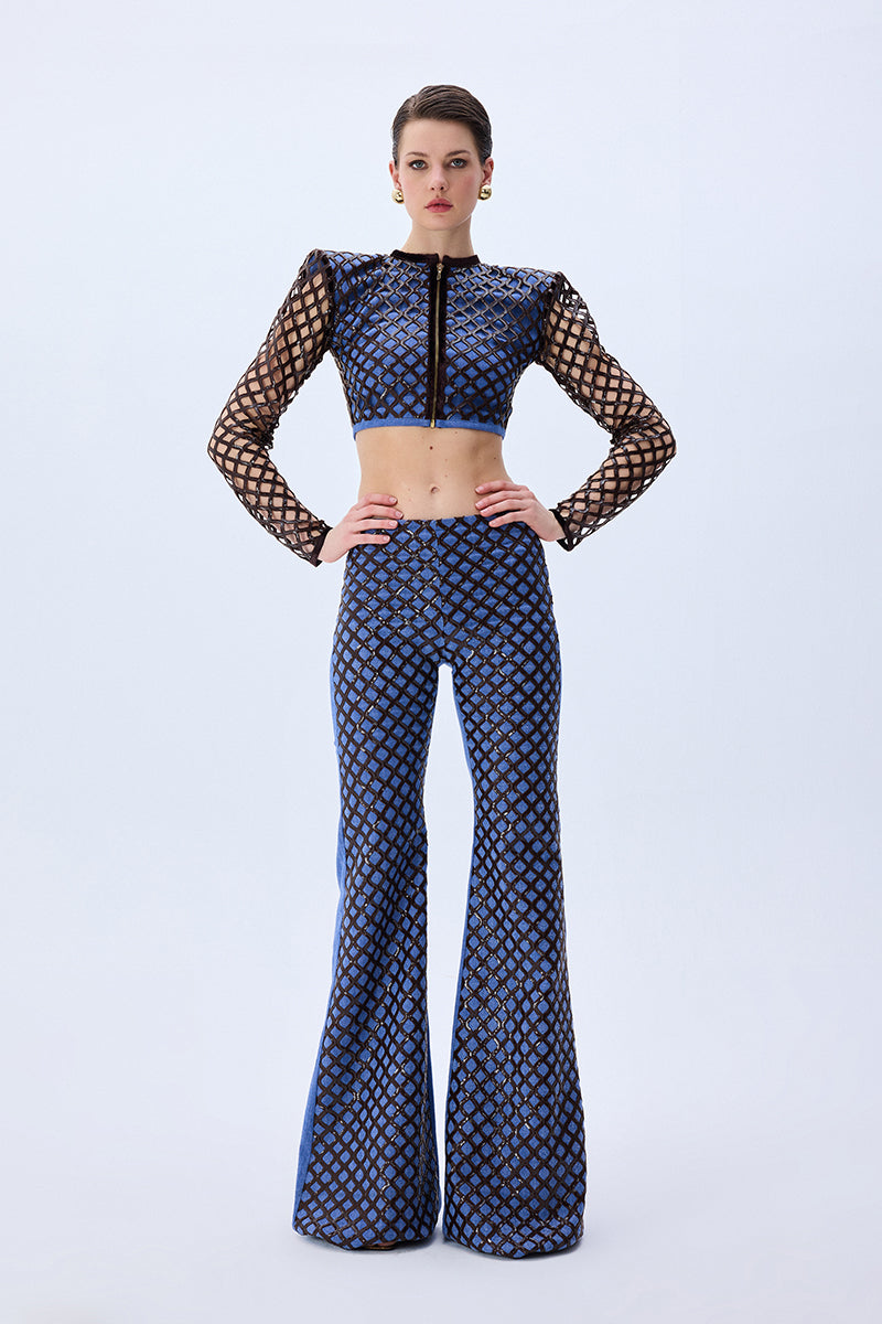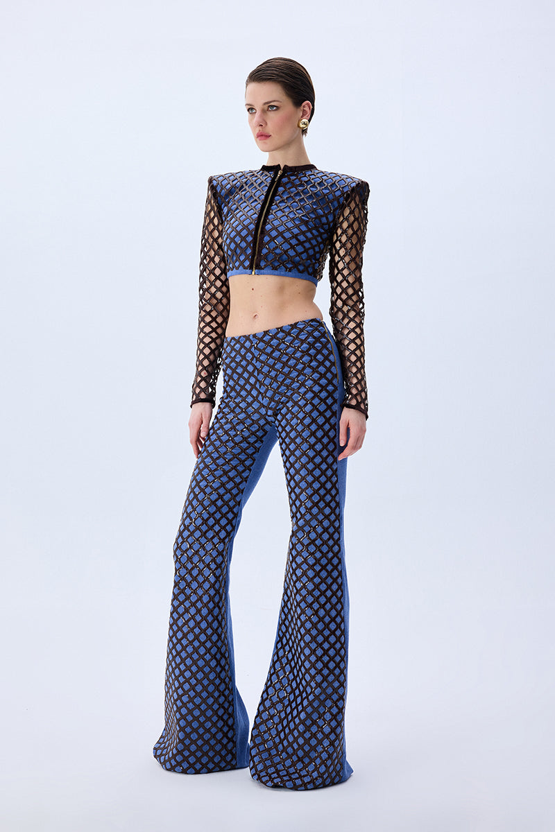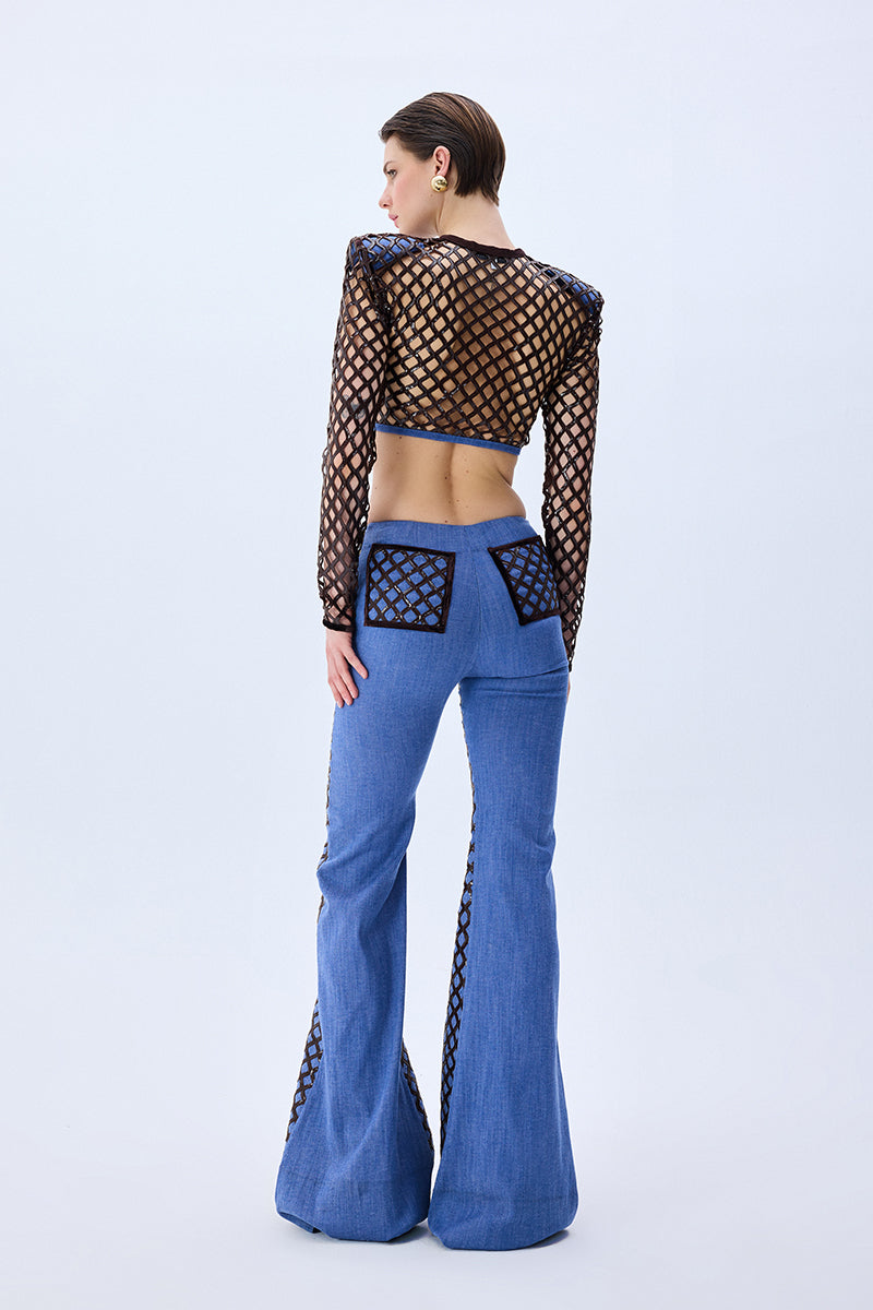 Brown sequined net overlays bring dimensional shimmer to these flared denim pants, creating a rich contrast of texture and movement. The high-rise fit and sculpted leg line evoke a bold yet polished silhouette.