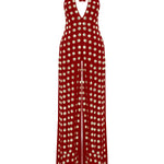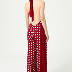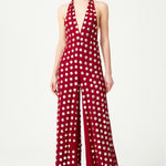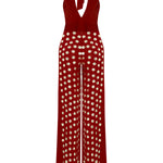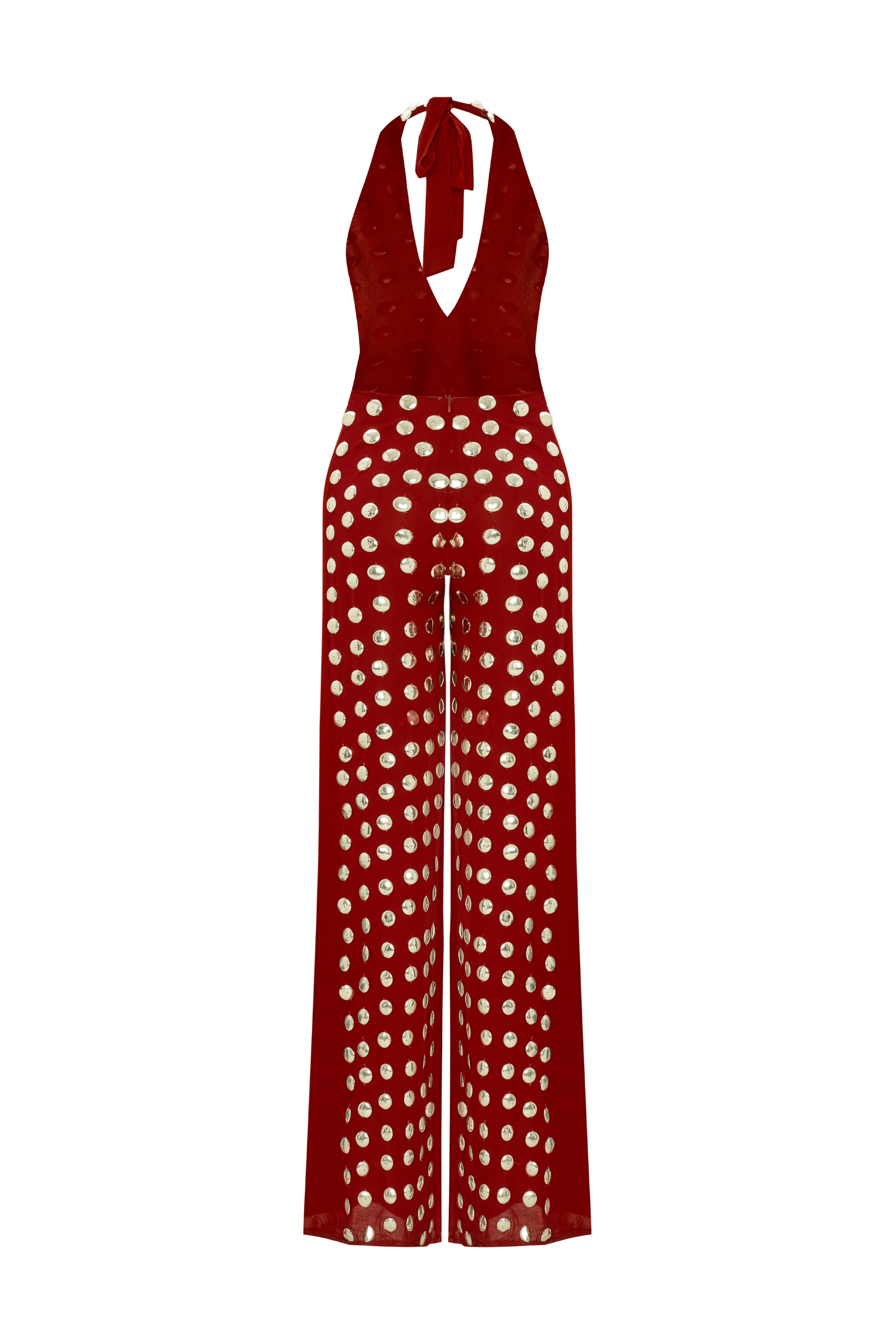 The Burgundy Handmade Gold Polka Dot Detailed Silk Chiffon Jumpsuit exudes glamour with its intricate gold polka dot detailing, offering a chic and stylish ensemble for any occasion.