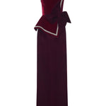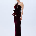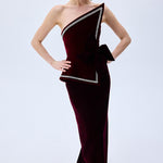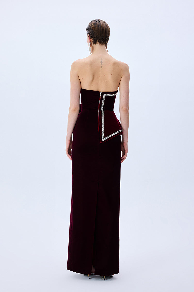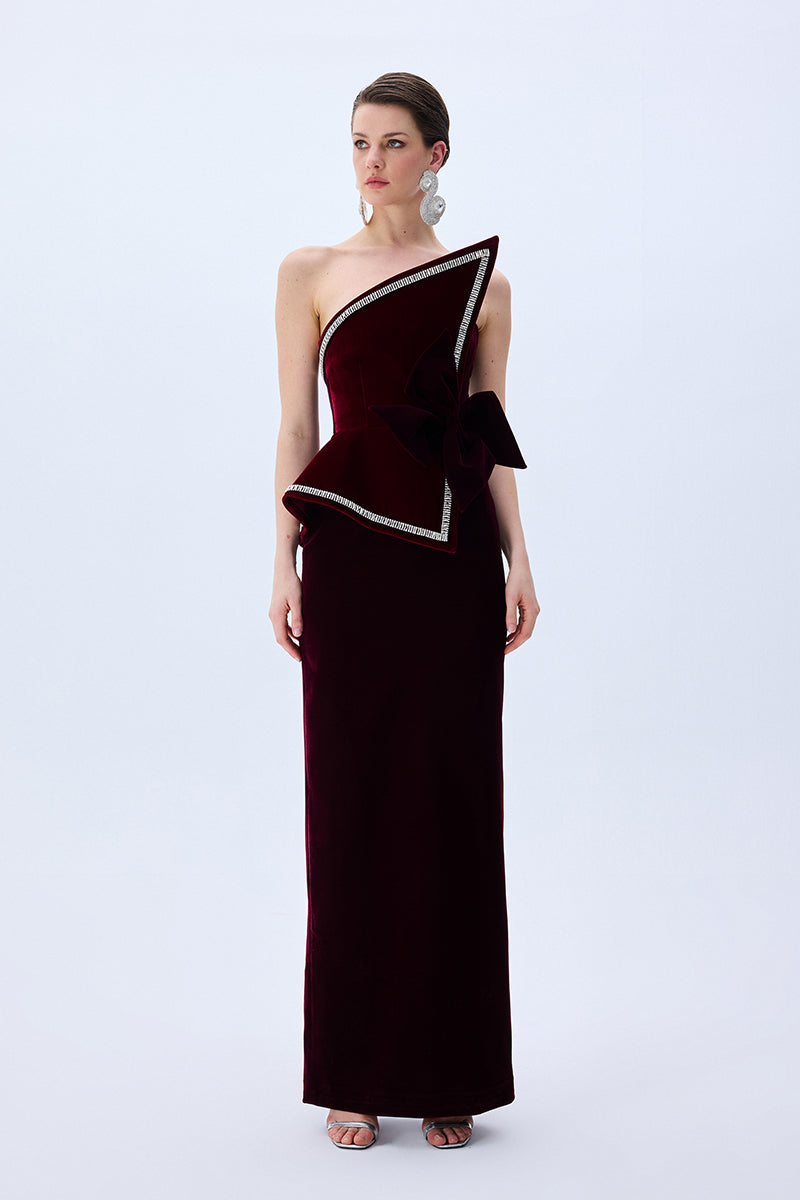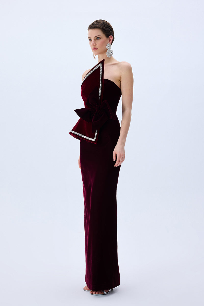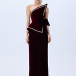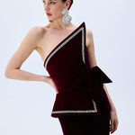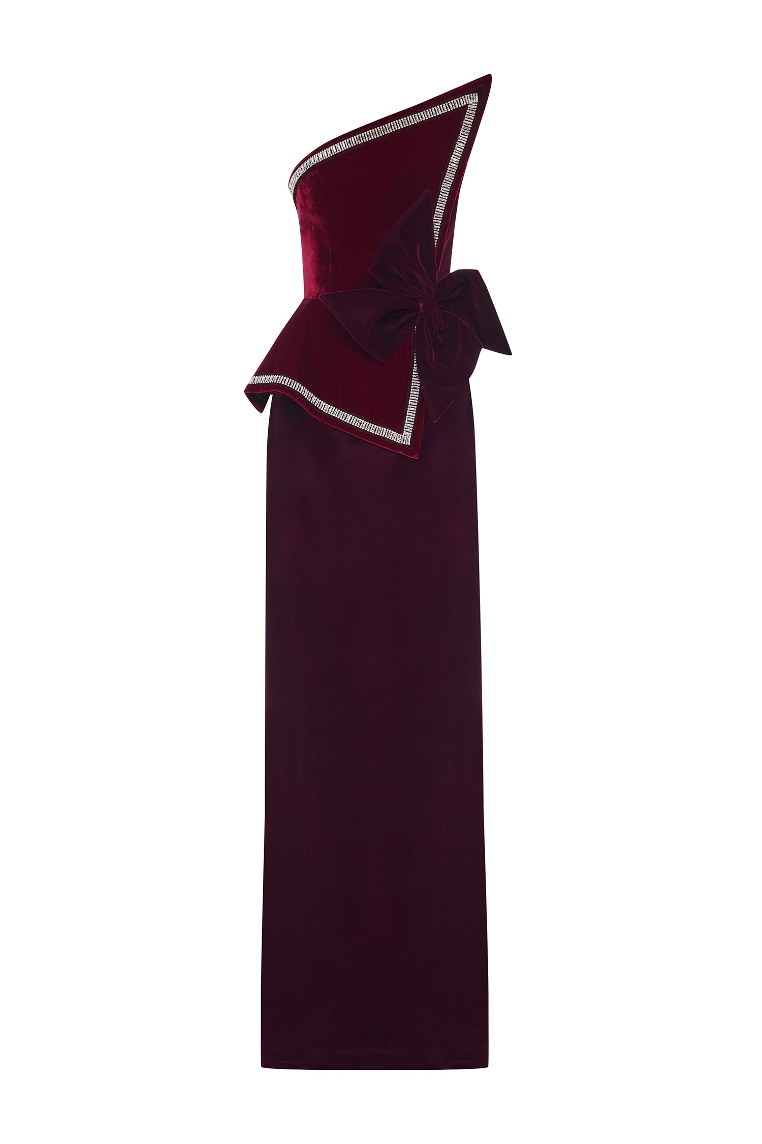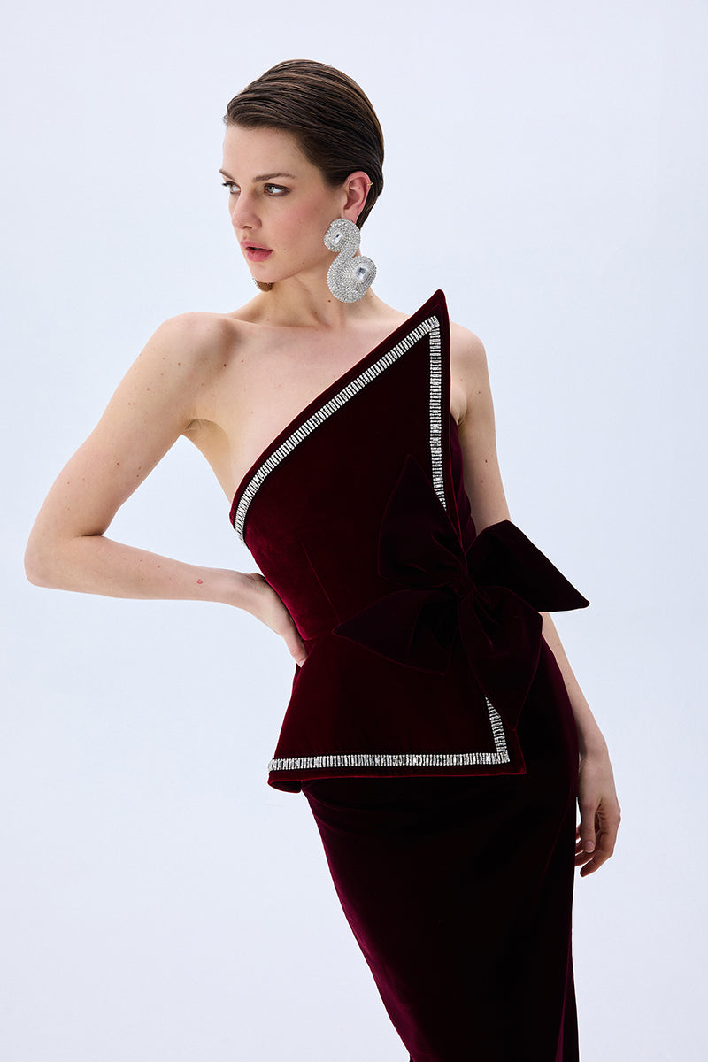 Crafted in deep burgundy velvet, the sculpted bodice flows into sharp architectural lines, crowned with a dramatic bow. Crystal-trimmed edges shimmer like stardust, refined opulence with a sculptural soul.